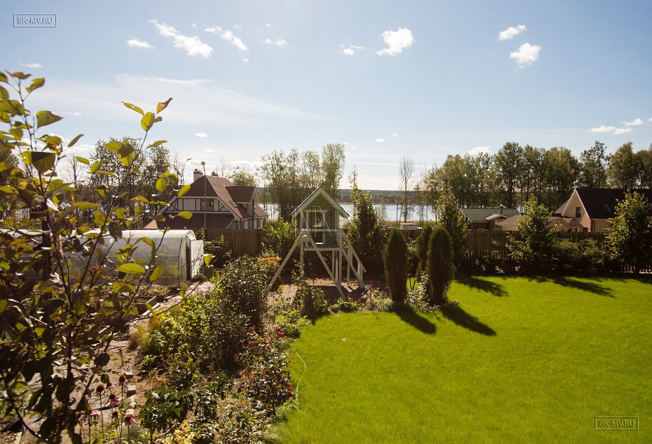 Склон оформлен ровным одеялом зеленой травы. Яблони и кустарники, красивые клумбы оживляют ландшафт. А завершает образ этого домовладения забор с деревянными секциями.
