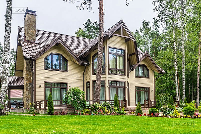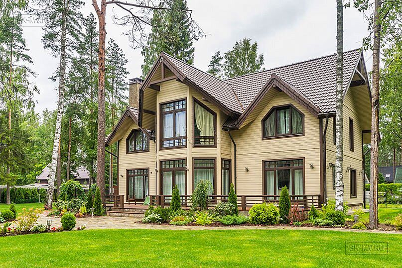 Фасадная отделка выполнена в стиле «комаровских дач» — деревянная вагонка светлых тонов с темно-коричневыми акцентами декоративных элементов, планок, ограждений, водостоков. Оригинальности образу дома добавляет труба дымохода, установленная снаружи дома. Такое решение позволяет расширить внутреннее пространство, но при этом не лишать его уютного огня камина.