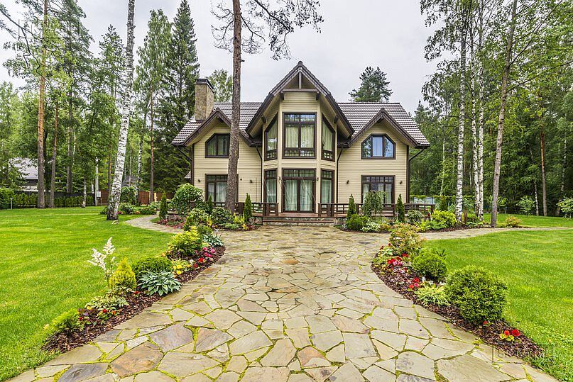 Просторное и обустроенное домовладение расположено в поселке Комарово Ленинградской области в окружении соснового леса. Территория зеленая, благоустроенная с максимальным раскрытием видового потенциала и сохранением естественной растительности в ландшафтном дизайне. Высокие березы и сосны гармонично сочетаются с декоративными растениями и цветущими клумбами.
