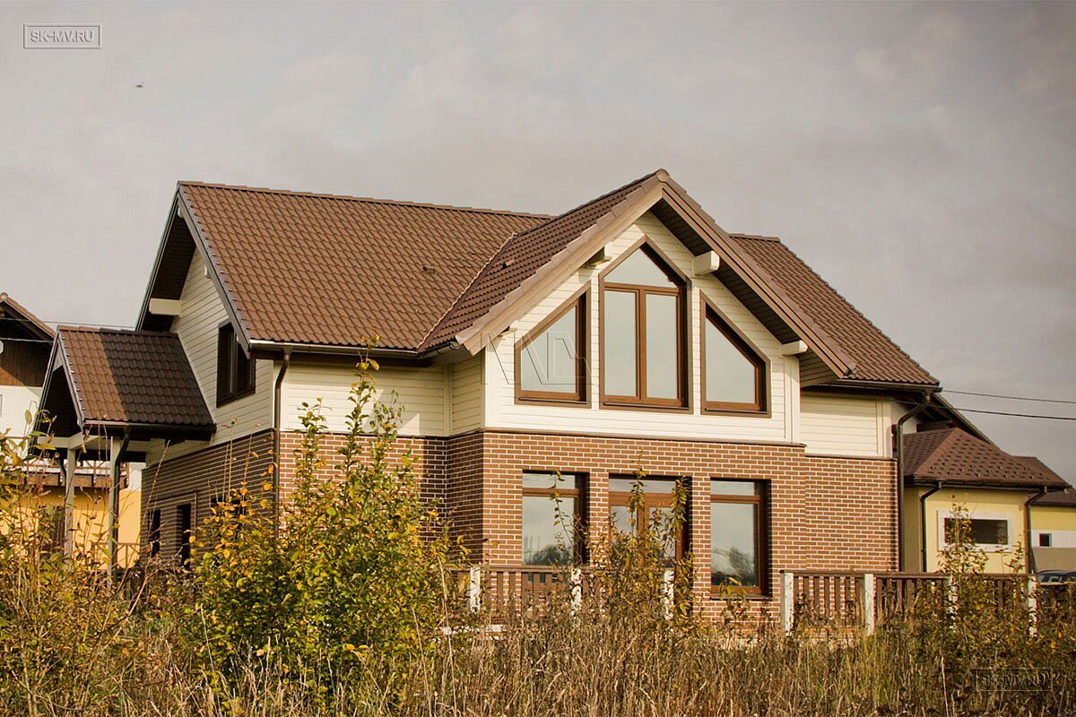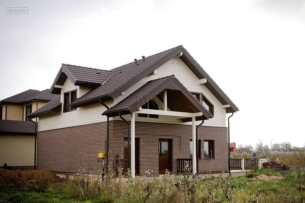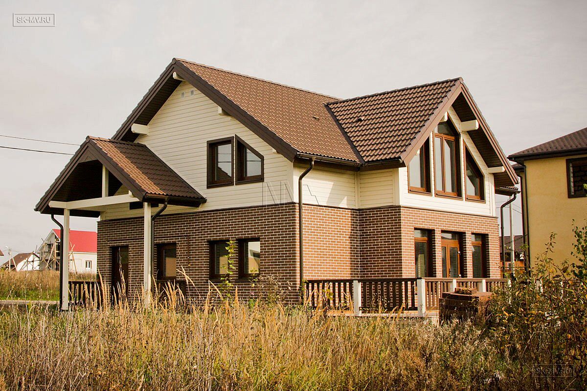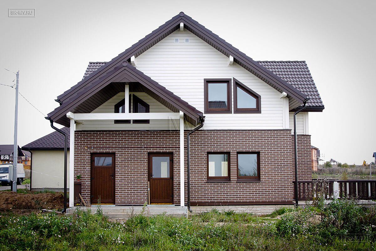 Комбинированный каркасный дом площадью 180 кв.м с отделкой из деревянной вагонки и лицевого кирпича построен по проекту МВ 5 в коттеджном поселке Смартвилль Дмитровского района Московской области.