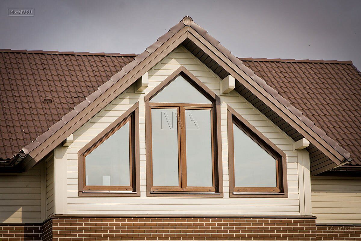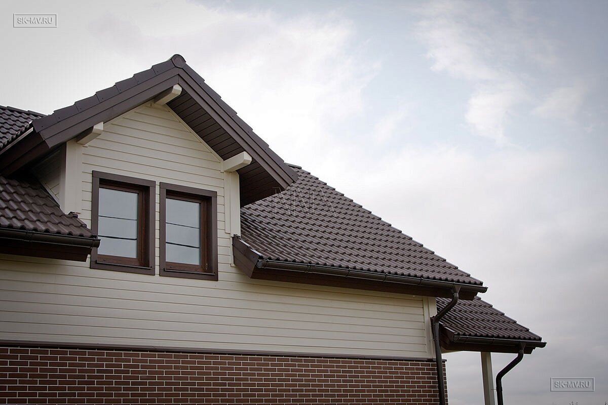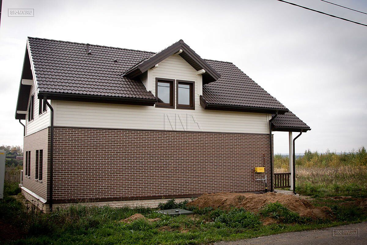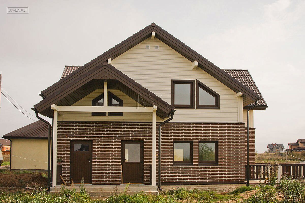 Комбинированный каркасный дом площадью 180 кв.м с отделкой из деревянной вагонки и лицевого кирпича построен по проекту МВ 5 в коттеджном поселке Смартвилль Дмитровского района Московской области.