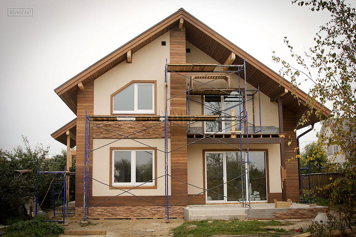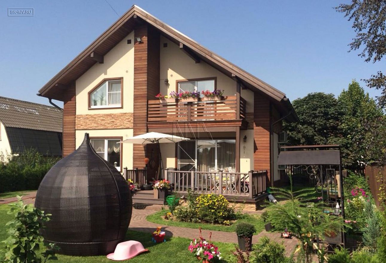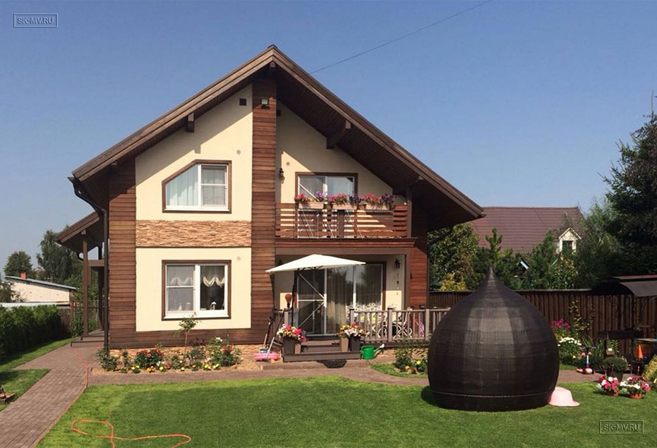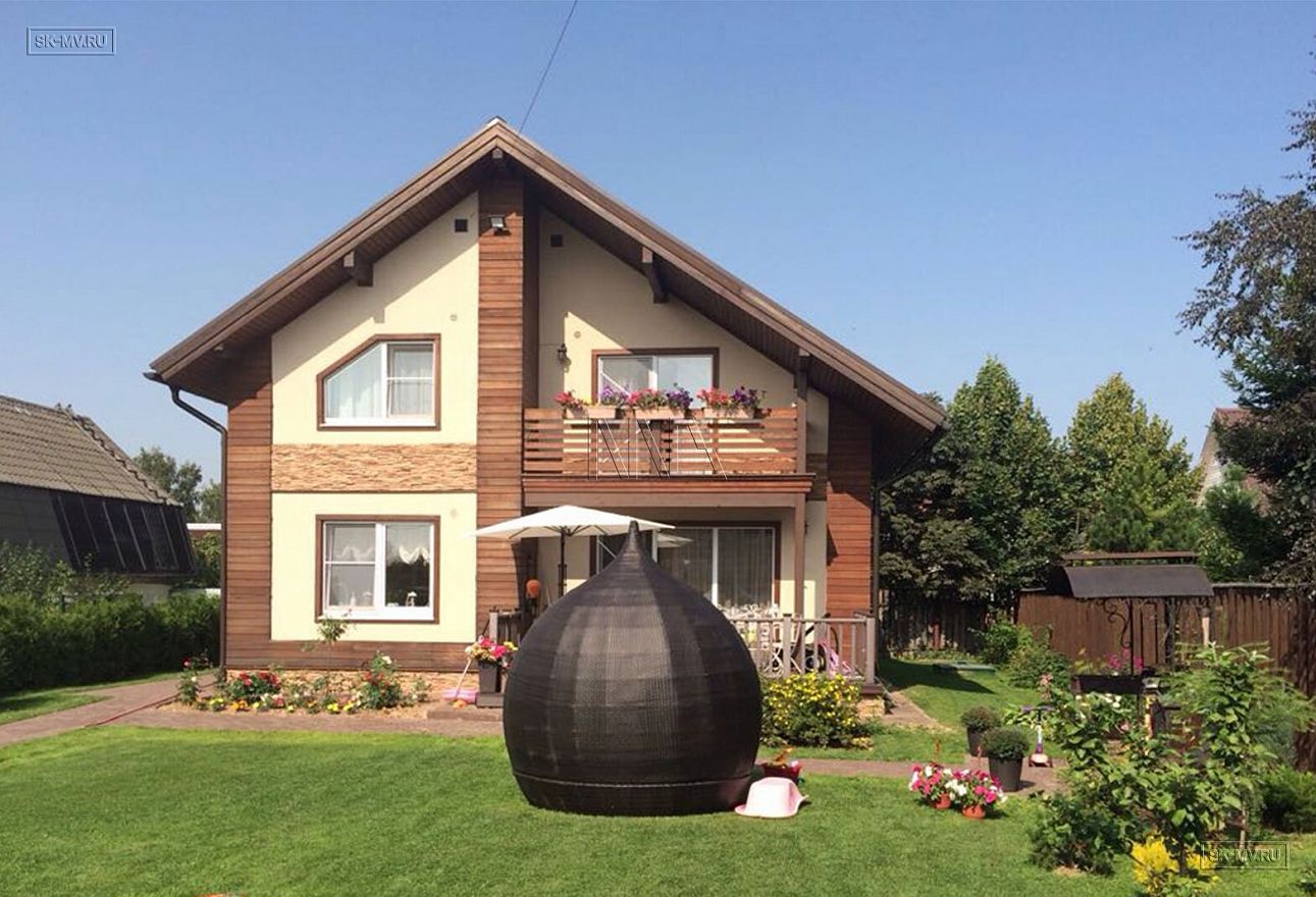 Строительство небольшого двухэтажного каркасного дома площадью 146 кв. м велось на небольшом участке в деревне Сорокино городского округа Мытищи Московской области по проекту «Сампо» из нашей коллекции.