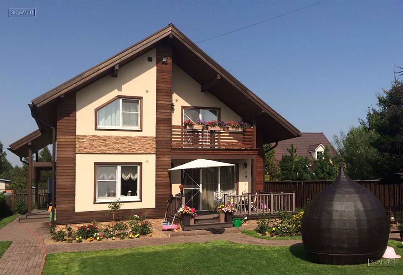 Этот маленький коттедж уникален своим оригинальным комбинированным фасадом из планкена, отделочного камня и штукатурки. Материалы хорошо сочетаются своими приятными теплыми оттенками. Деревянные элементы и камень красиво декорируют фасад, а завершенность образа достигается декоративными наличниками вокруг оконных проемов.