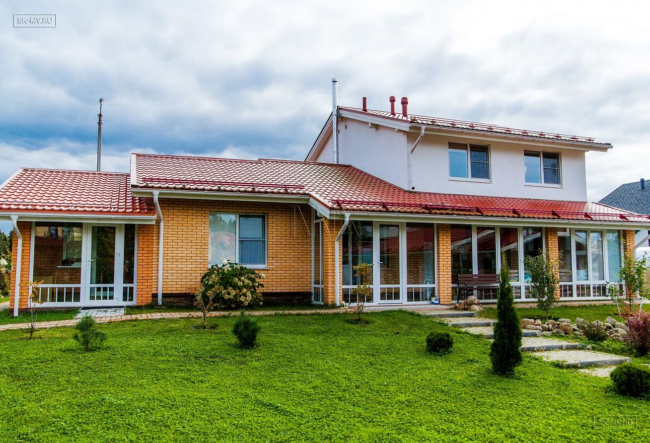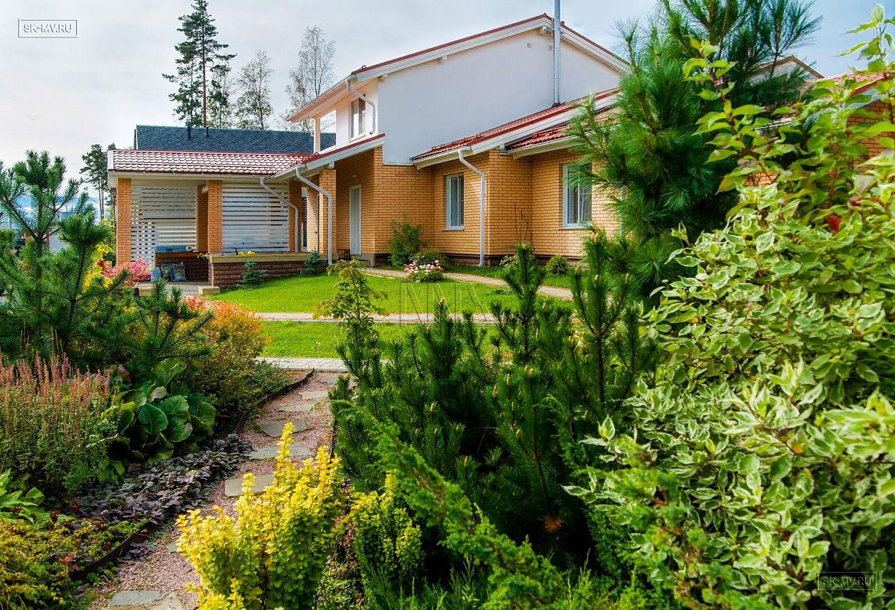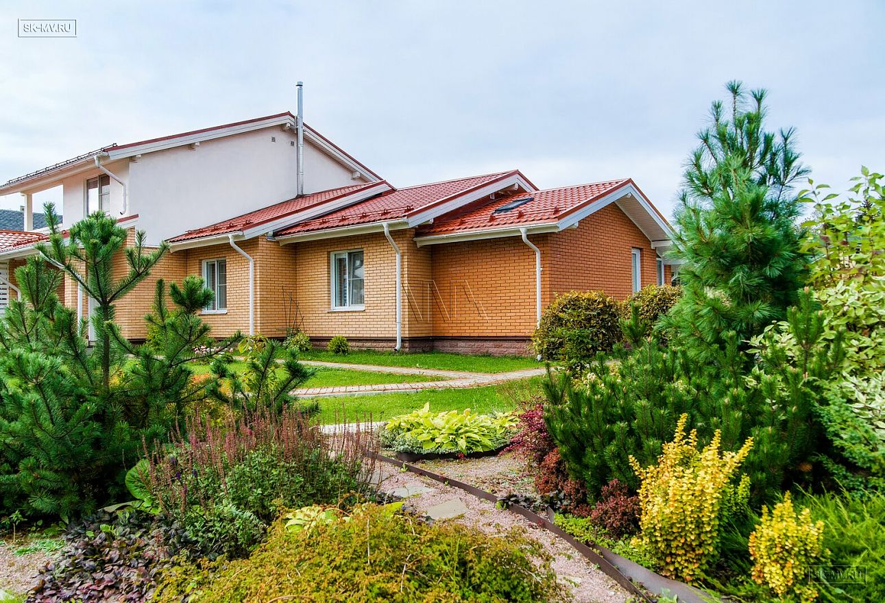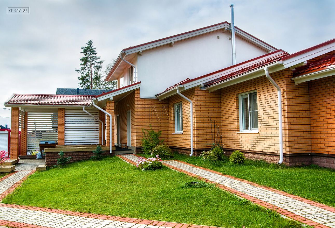 Дом на фото из газобетона площадью 253 кв.м построен в коттеджном поселке «Сосново» Ленинградской области.