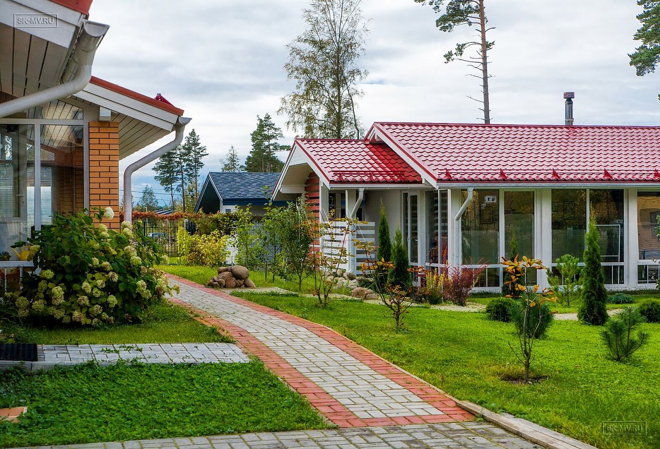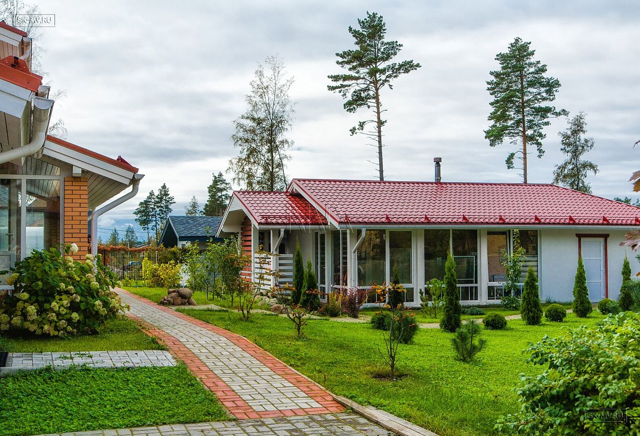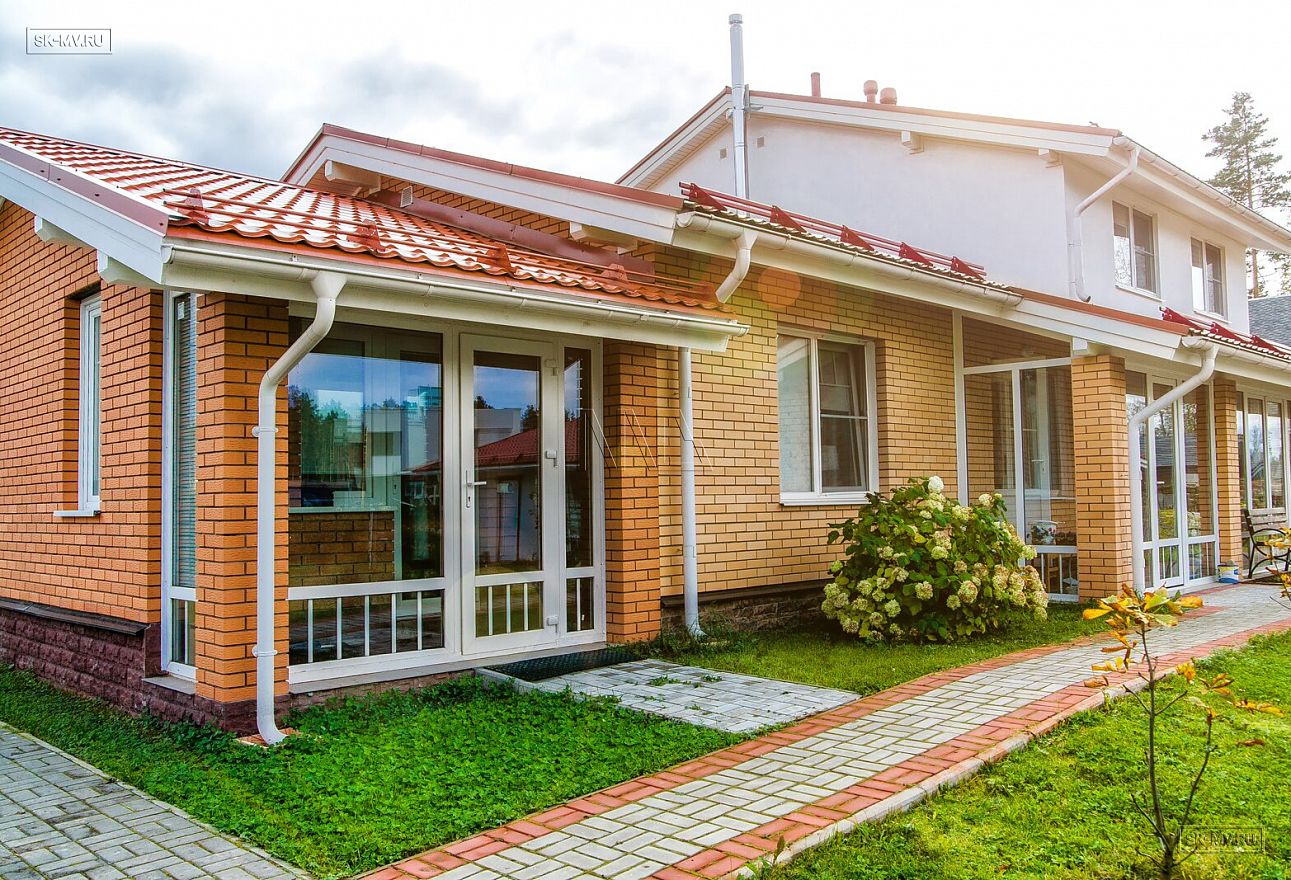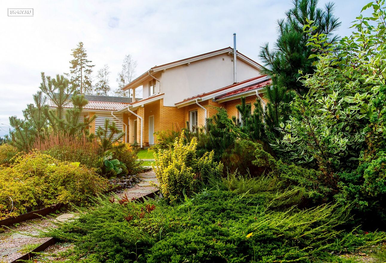 Дом на фото из газобетона площадью 253 кв.м построен в коттеджном поселке «Сосново» Ленинградской области.