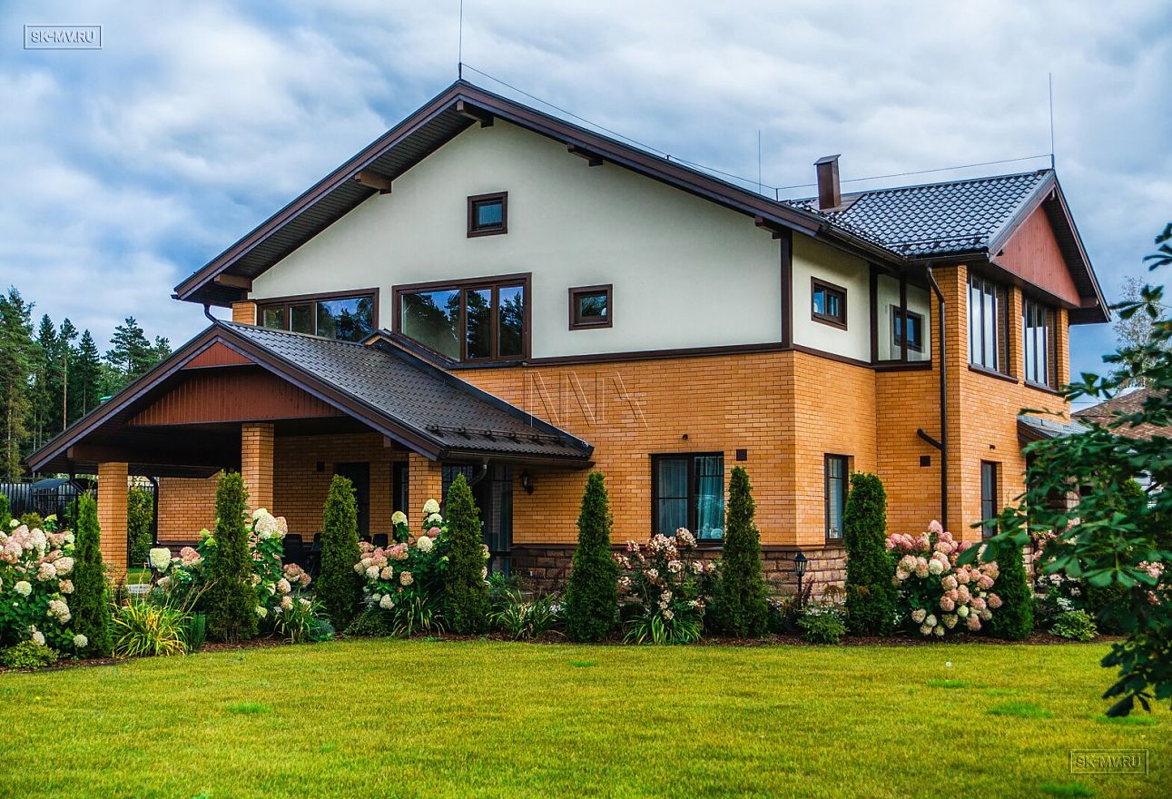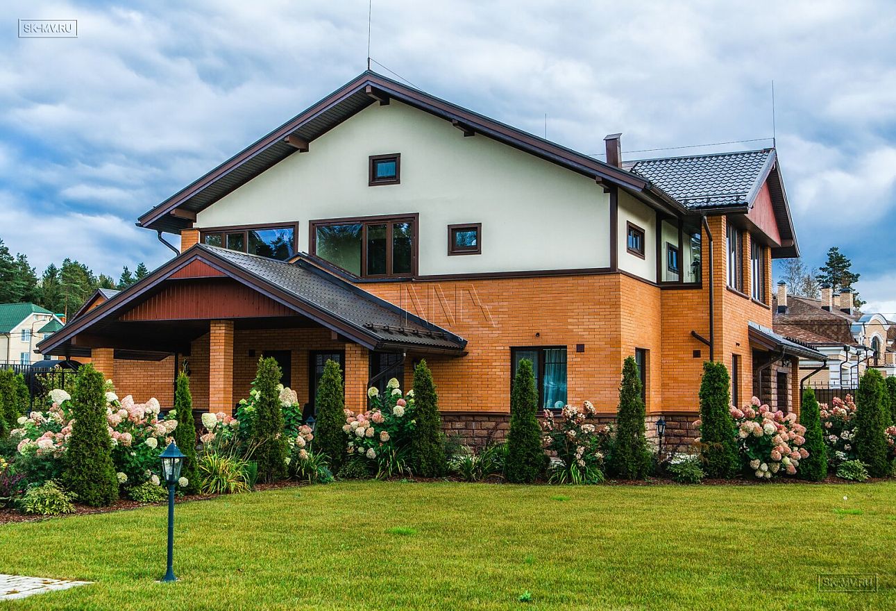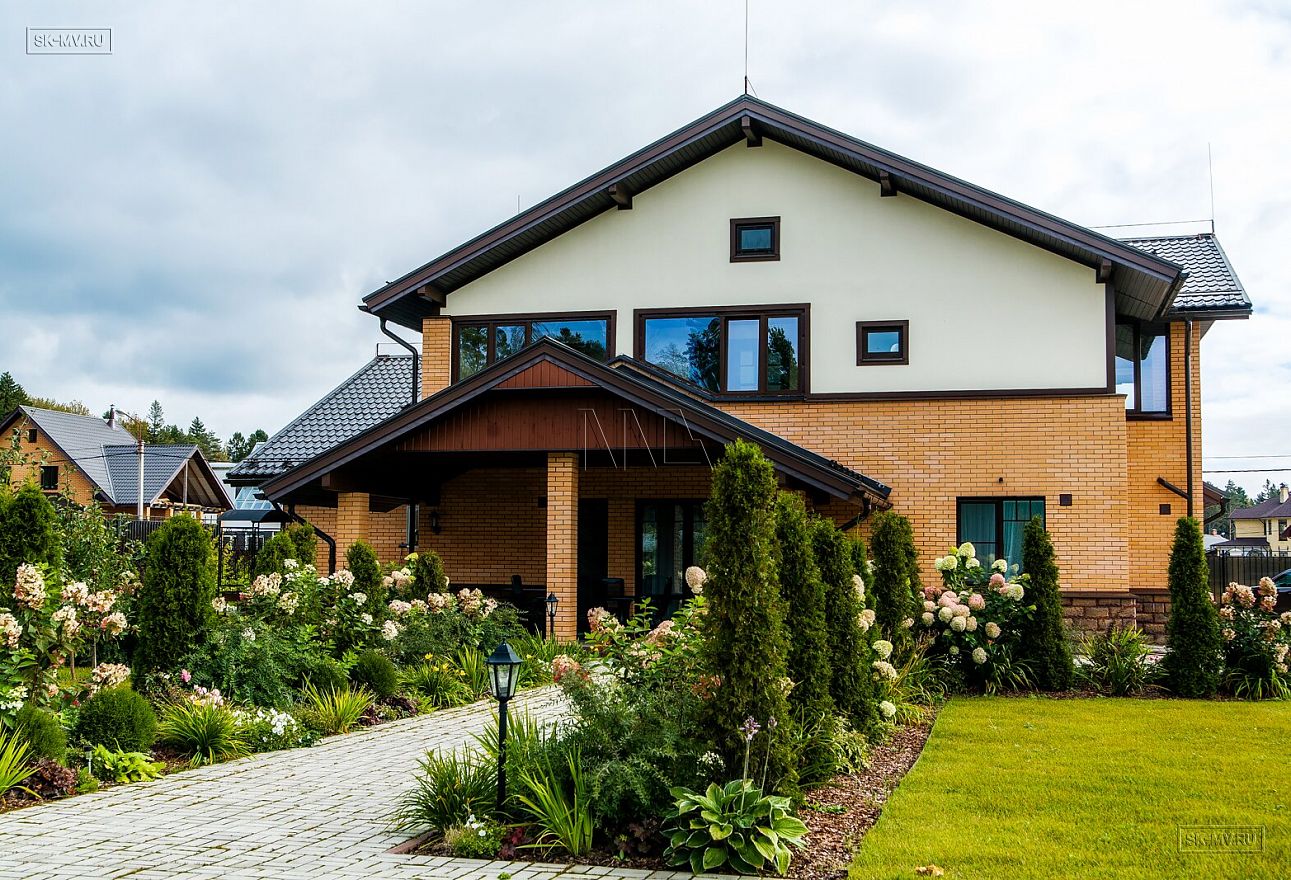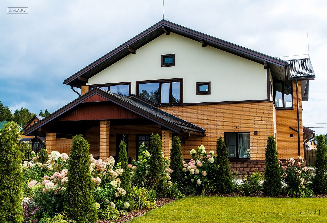 Современная тенденция в фасадной отделке — игра переплетением различных материалов в одной плоскости — нашла отражение и в этом доме, когда мы не можем провести ровной разграничительной линии между кирпичом и штукатуркой по всему периметру дома, а наблюдаем интеграцию кирпичной кладки в пространство второго этажа.