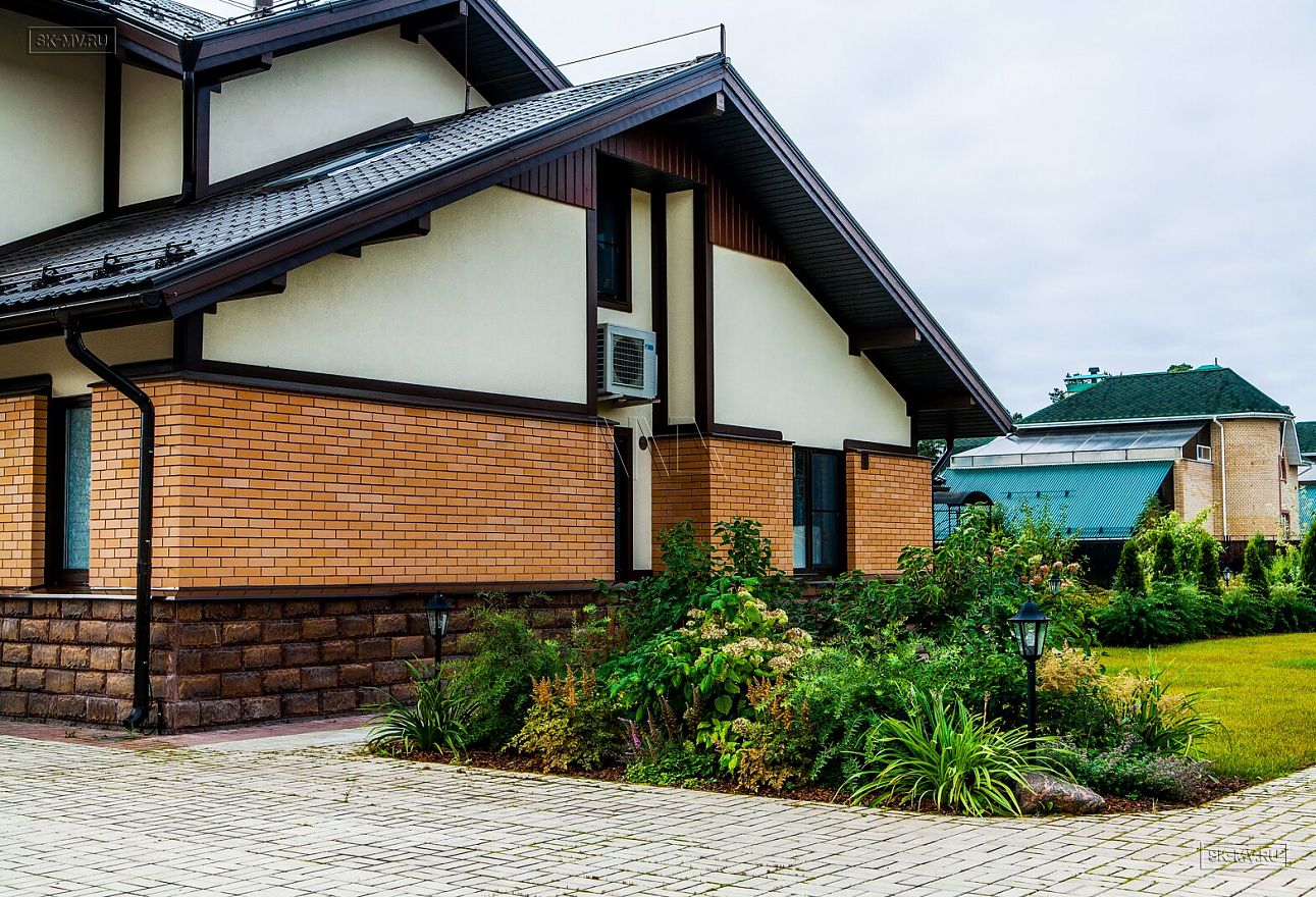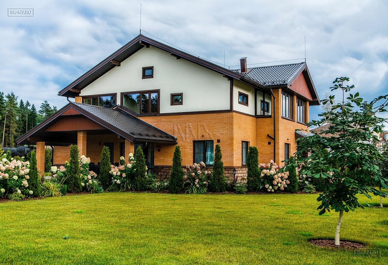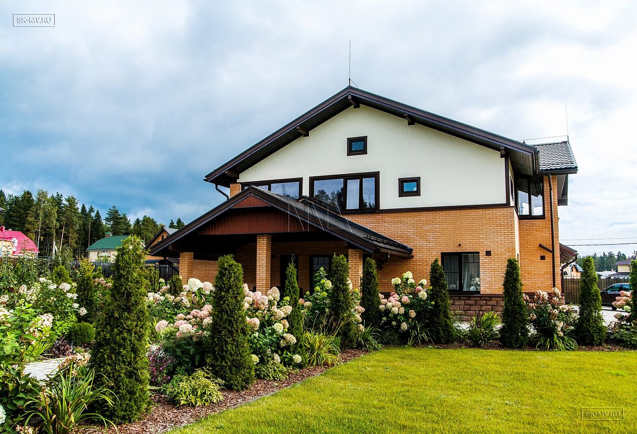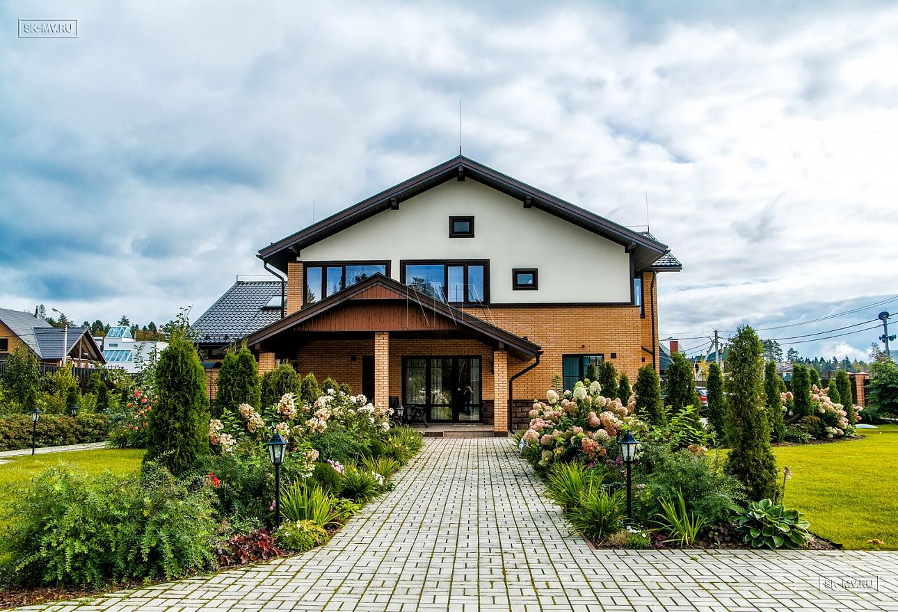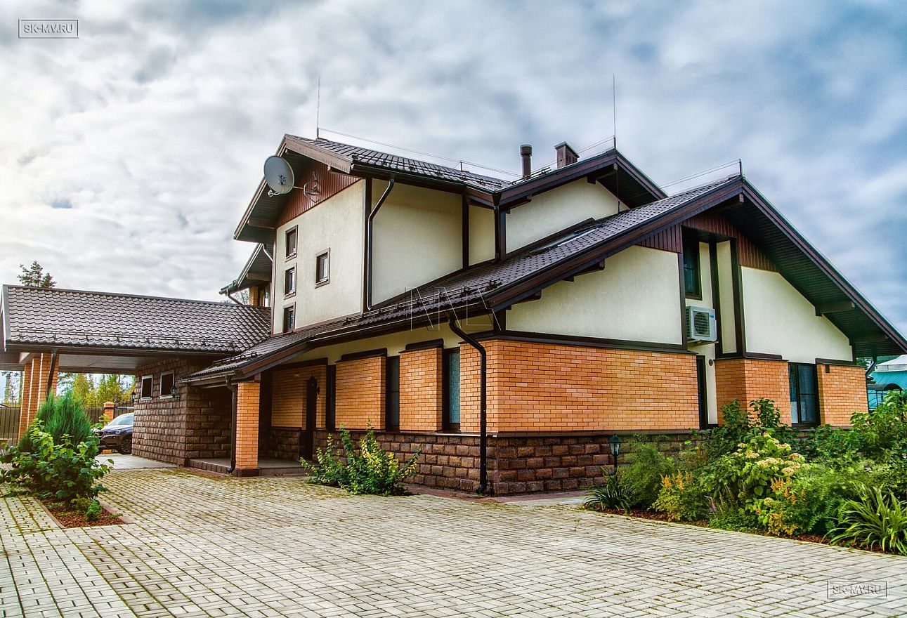 Современная тенденция в фасадной отделке — игра переплетением различных материалов в одной плоскости — нашла отражение и в этом доме, когда мы не можем провести ровной разграничительной линии между кирпичом и штукатуркой по всему периметру дома, а наблюдаем интеграцию кирпичной кладки в пространство второго этажа.