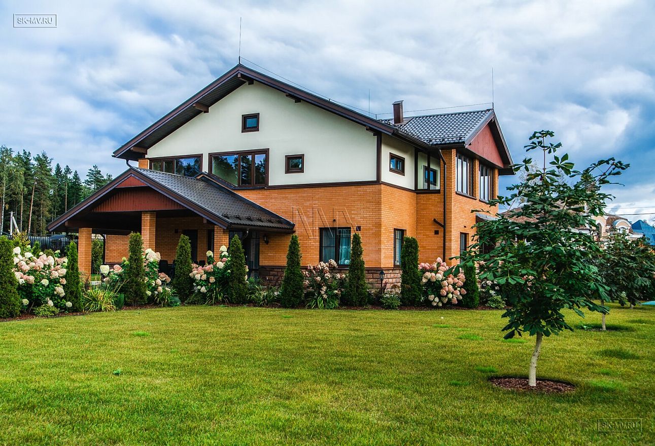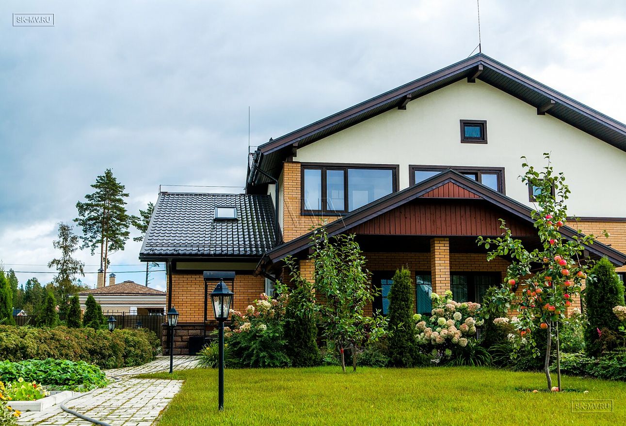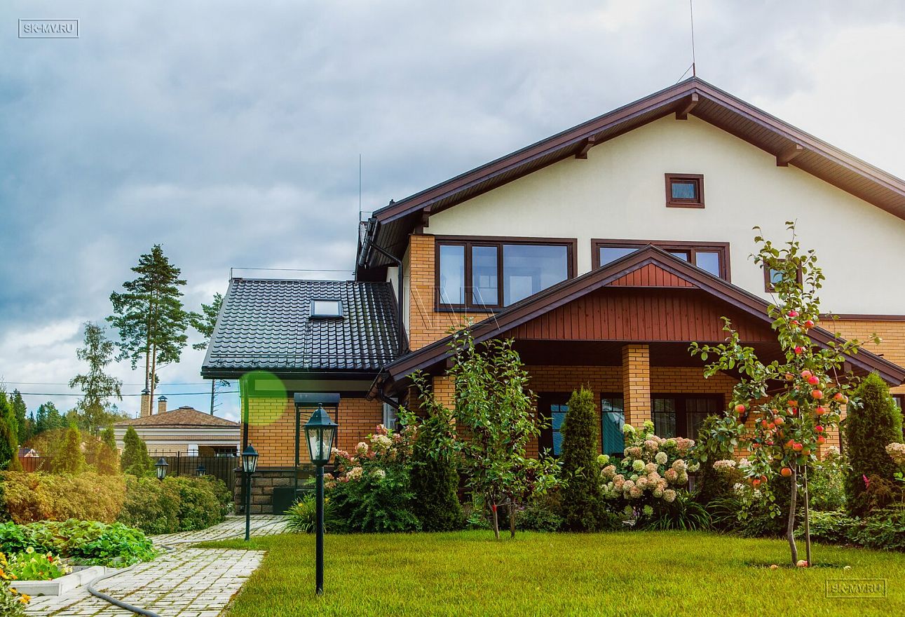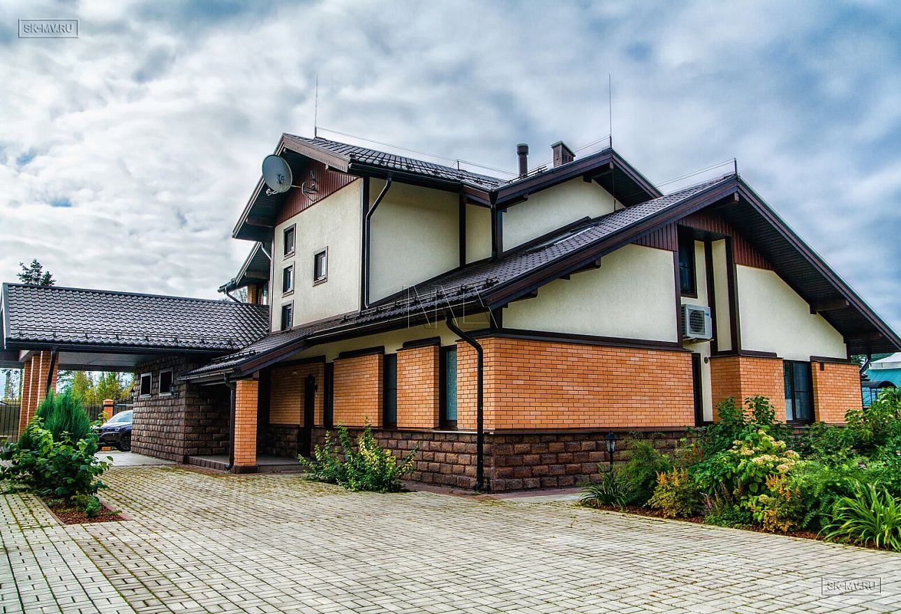 Современная тенденция в фасадной отделке — игра переплетением различных материалов в одной плоскости — нашла отражение и в этом доме, когда мы не можем провести ровной разграничительной линии между кирпичом и штукатуркой по всему периметру дома, а наблюдаем интеграцию кирпичной кладки в пространство второго этажа.