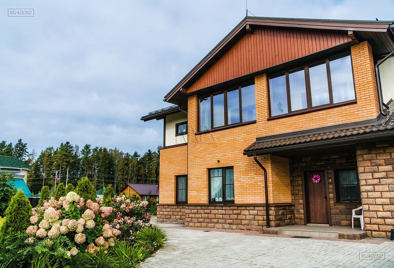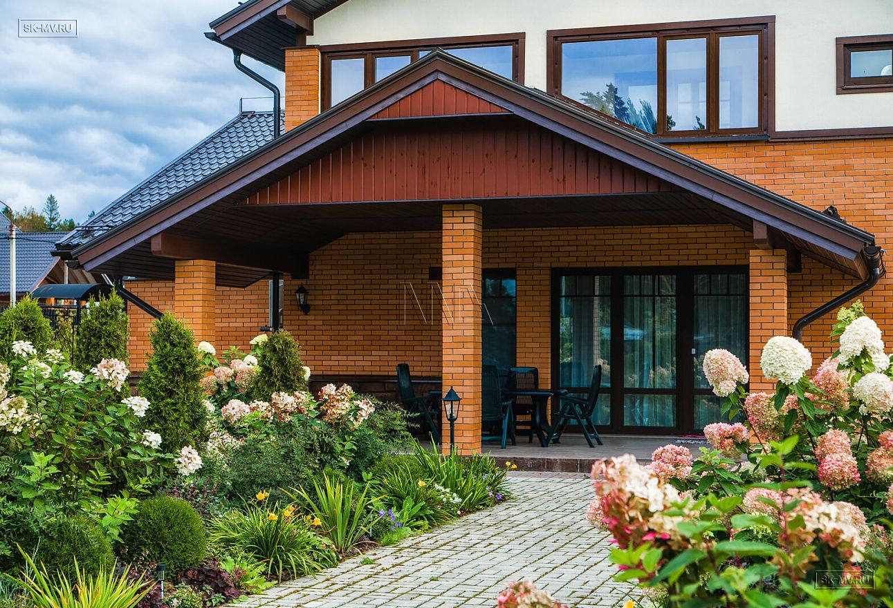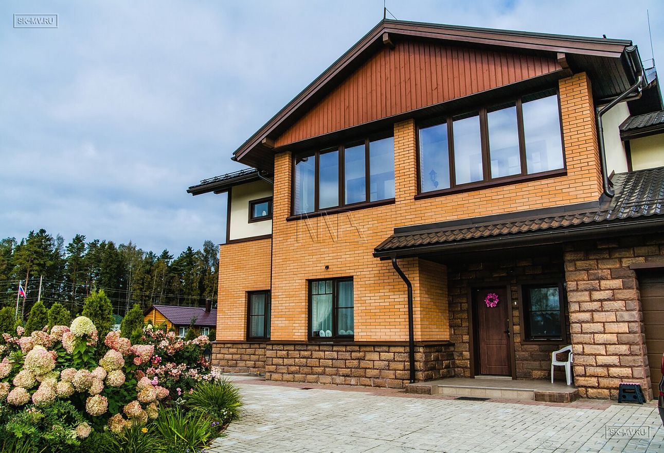 Технология строительства домов из газобетона позволяет выполнить любую фасадную отделку. Домовладельцы отдали предпочтение яркому натуральному облицовочному кирпичу в сочетании с красным цокольным камнем и белой штукатуркой. Темно-коричневая кровля, коричневые наличники, планки выигрышно подчеркивают естественную яркость фасада.