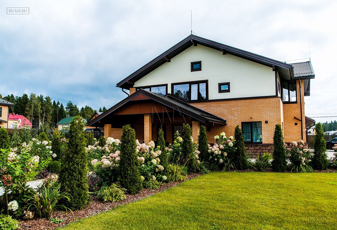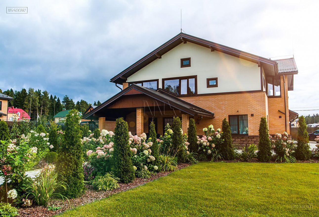 На фото мы видим, что дом окружен чудесным ландшафтным дизайном, который восхитительным образом оживляет образ дома.