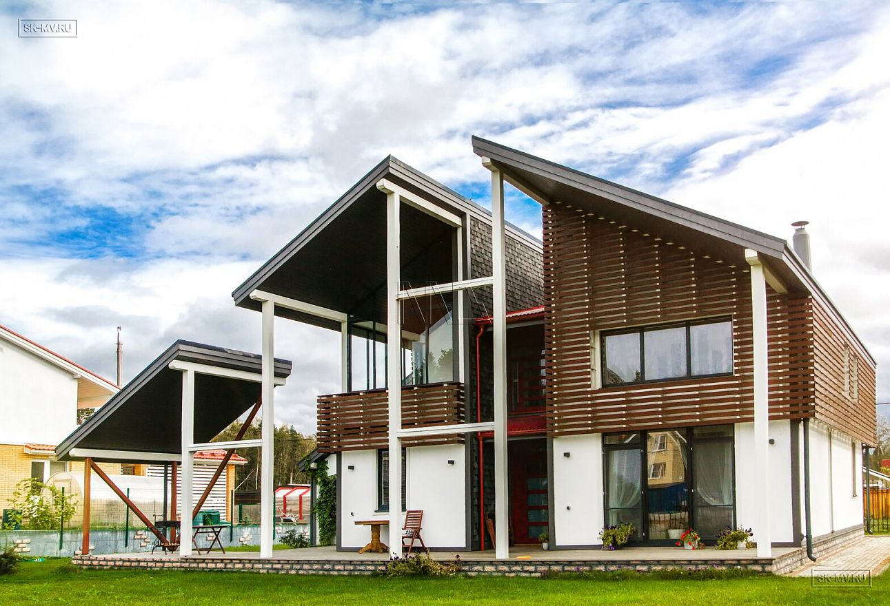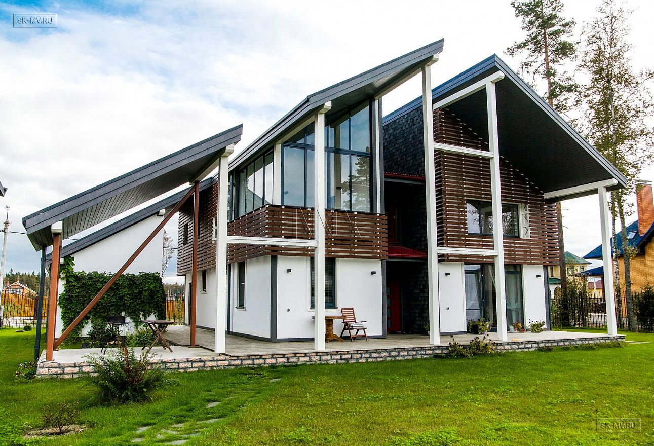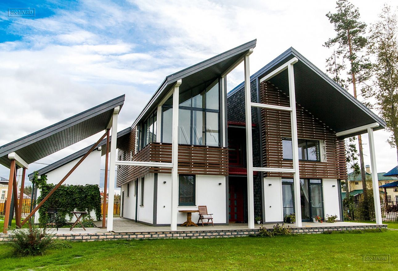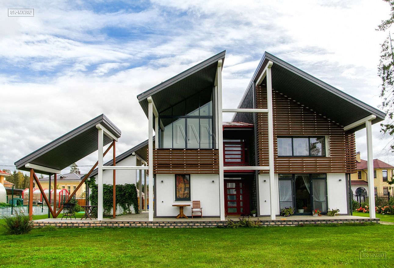 Простыми геометрическими формами и деревянными декоративными элементами создан сложный объемный архитектурный облик этого дома с уникальной комбинированной фасадной отделкой. Деревянный планкен вынесен за пределы фасада на деревянных фермах, что и создает объем. Трехсекционная кровля поддерживаемая белыми стойками террасы — удивительное ощущение парящего дома.