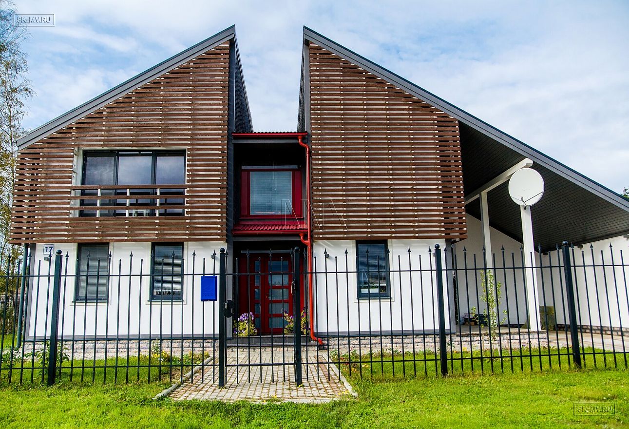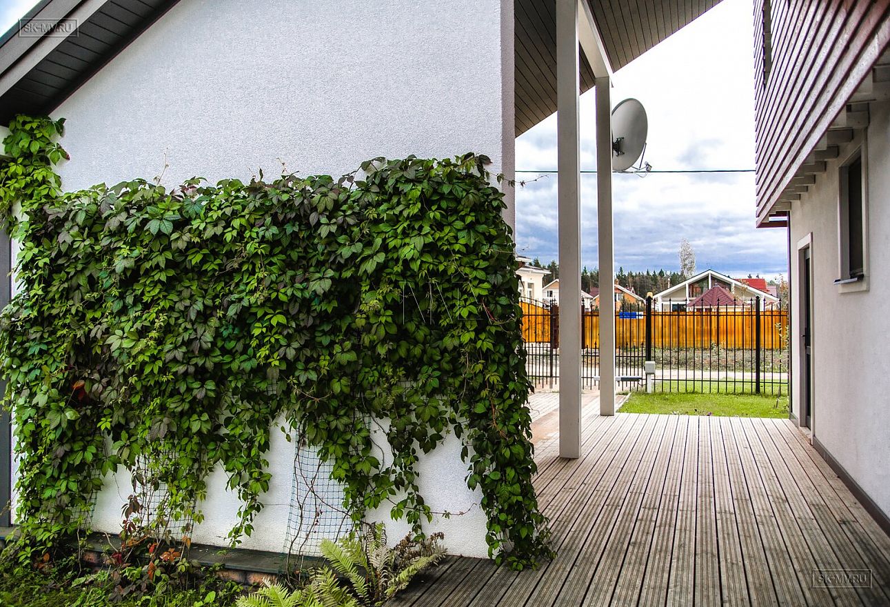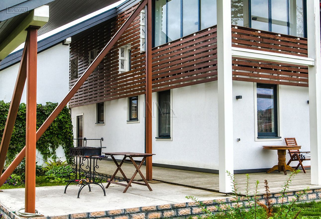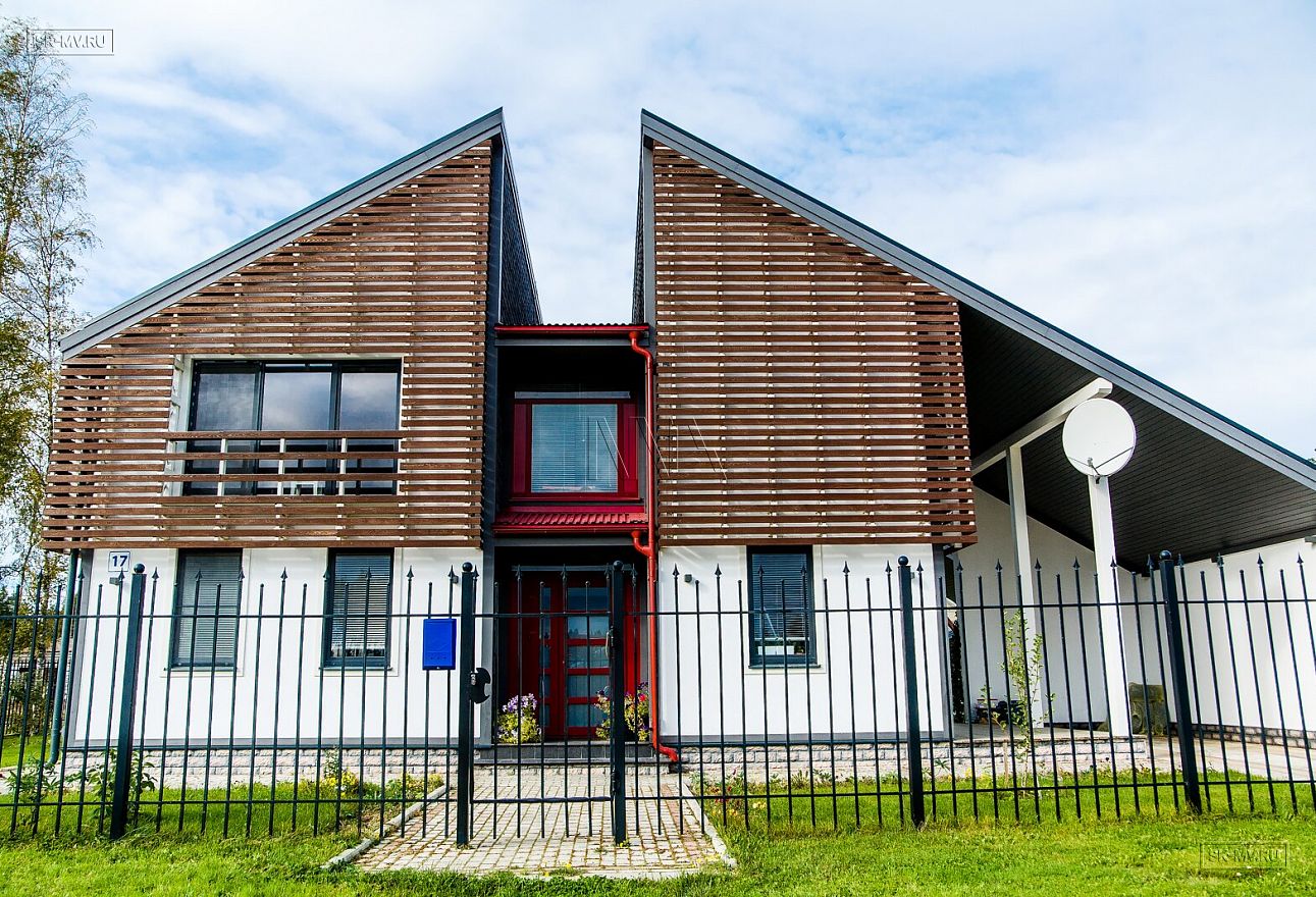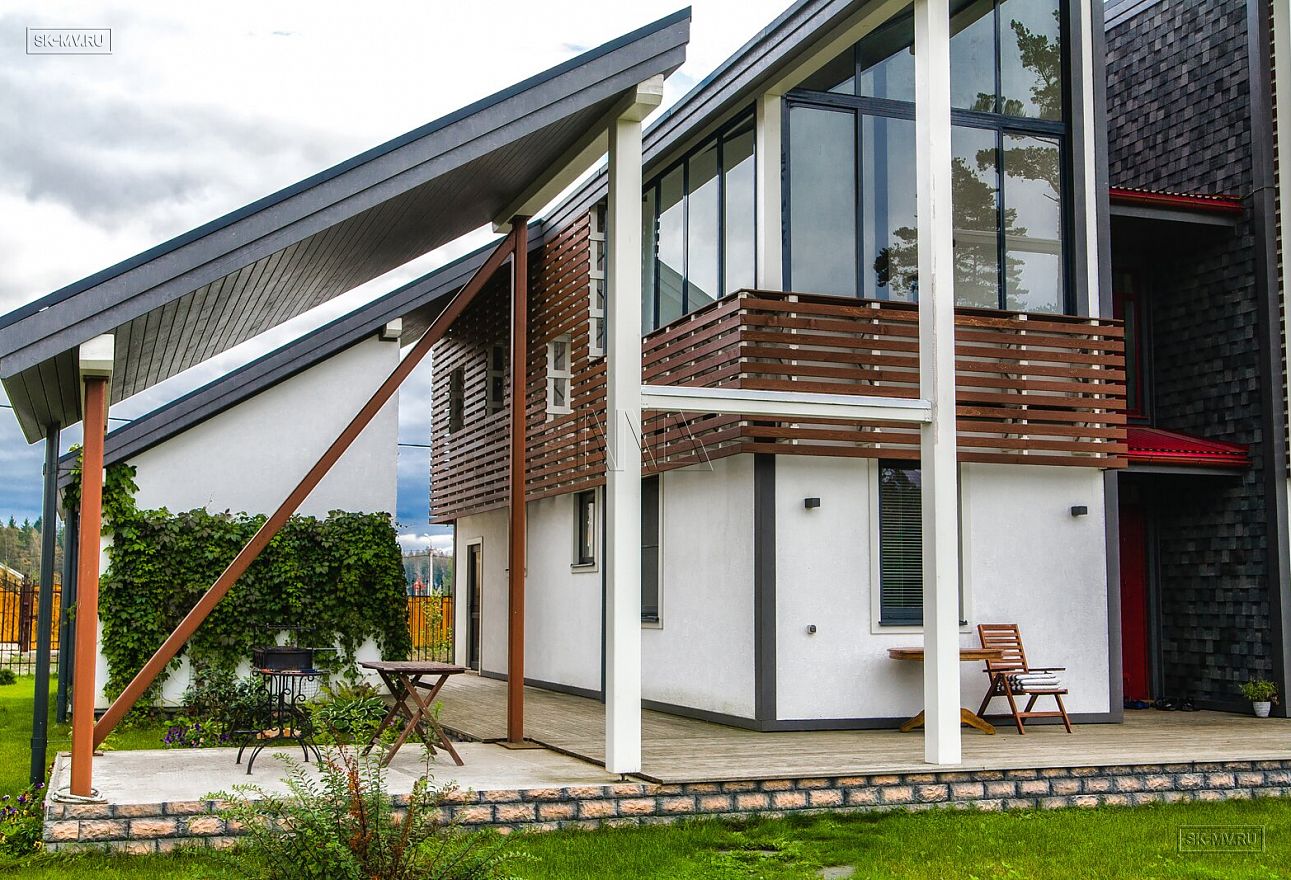 Простыми геометрическими формами и деревянными декоративными элементами создан сложный объемный архитектурный облик этого дома с уникальной комбинированной фасадной отделкой. Деревянный планкен вынесен за пределы фасада на деревянных фермах, что и создает объем. Трехсекционная кровля поддерживаемая белыми стойками террасы — удивительное ощущение парящего дома.