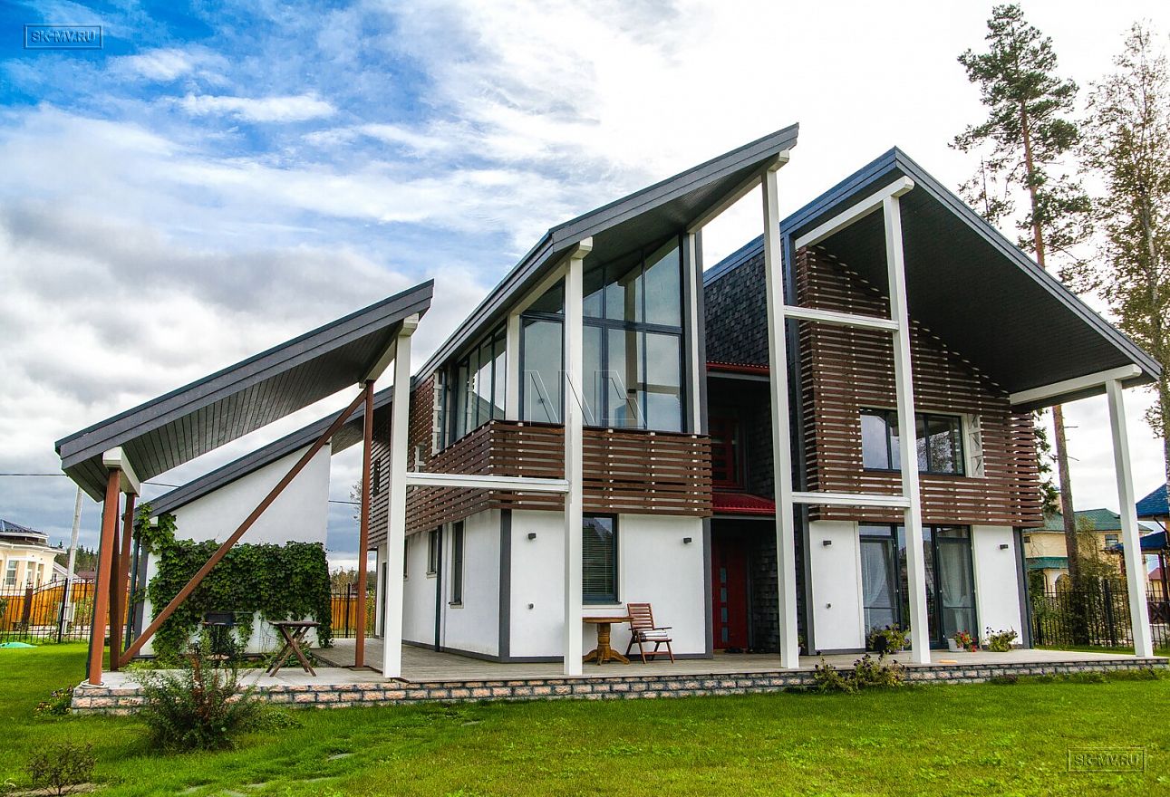 Современный комфортный дом площадью 244 кв.м построен в коттеджном поселке «Сосновое» Ленинградской области по проекту " Сосновый бор 6«.