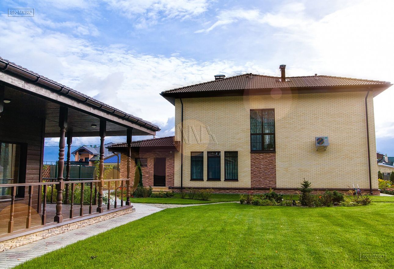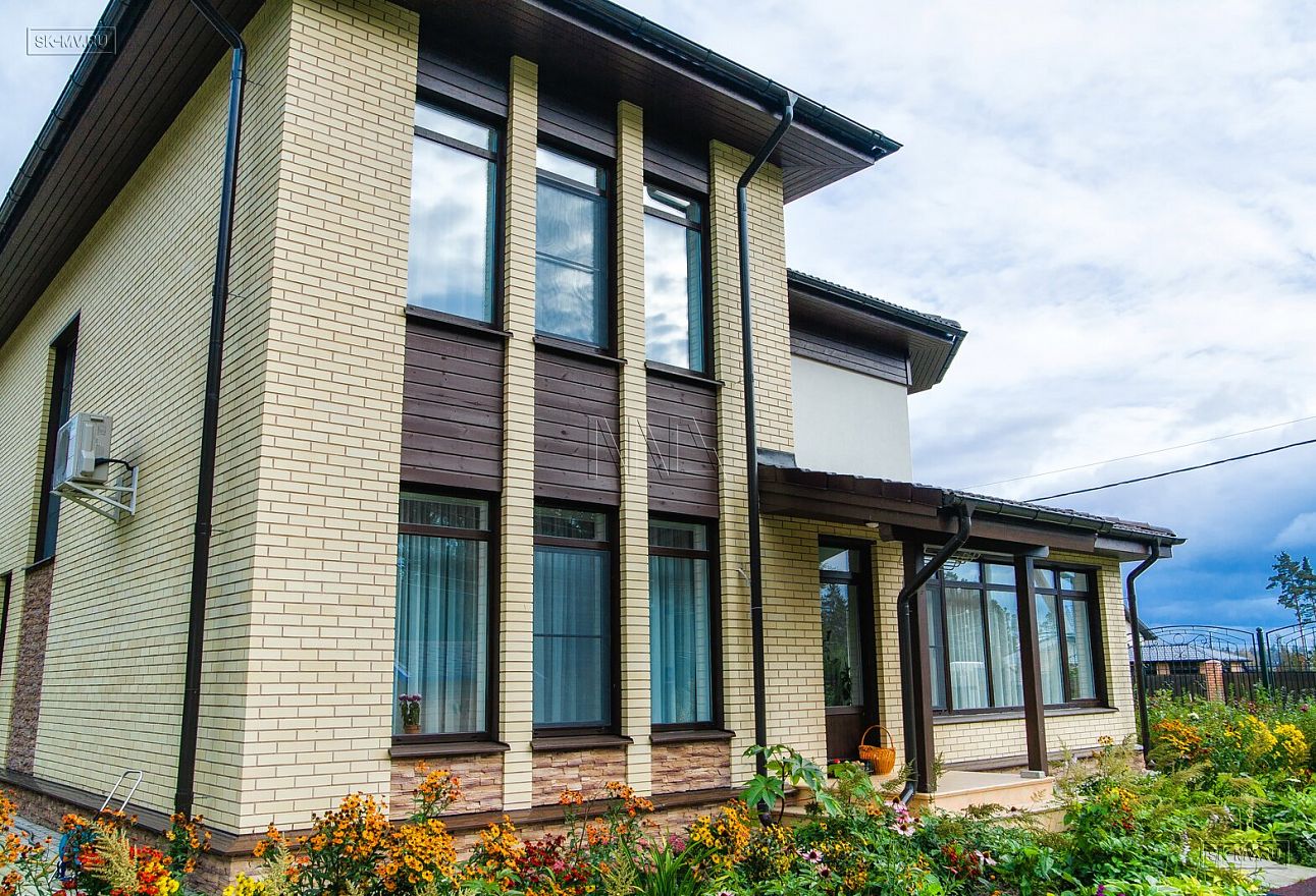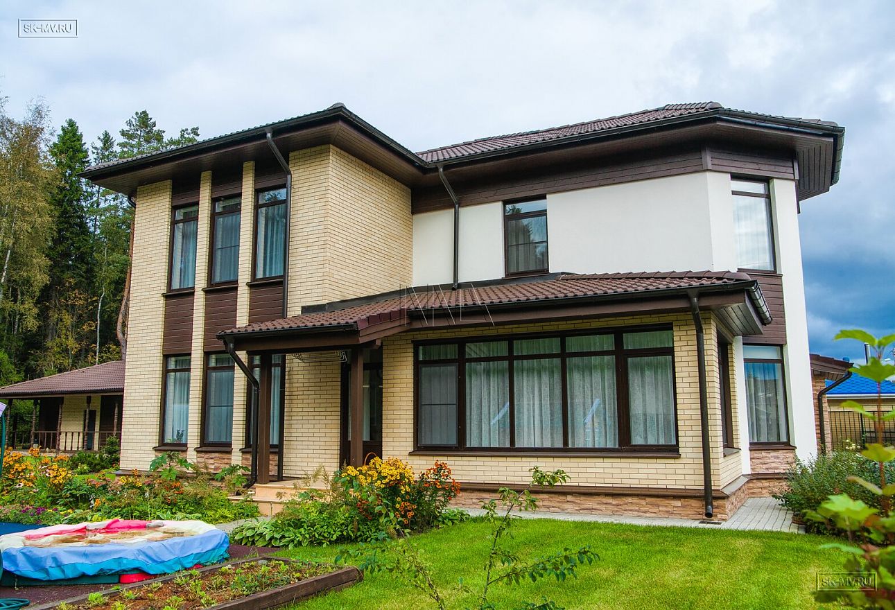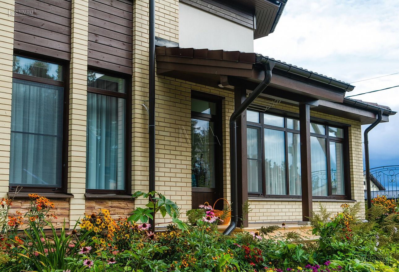 Интересным архитектурным решением является сочетание двух разных по форме эркеров — прямоугольного и круглого, выделенного дополнительно принципиально другим фасадным оформлением — сочетание коричневой вагонки с белой штукатуркой против кирпичной кладки желтым лицевым кирпичом остального периметра дома.