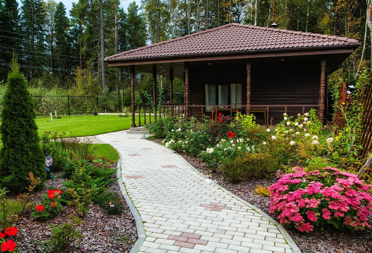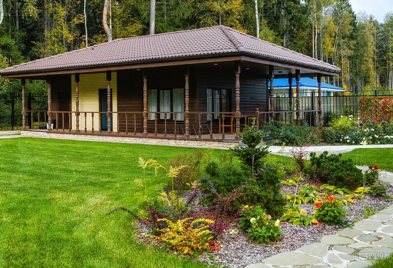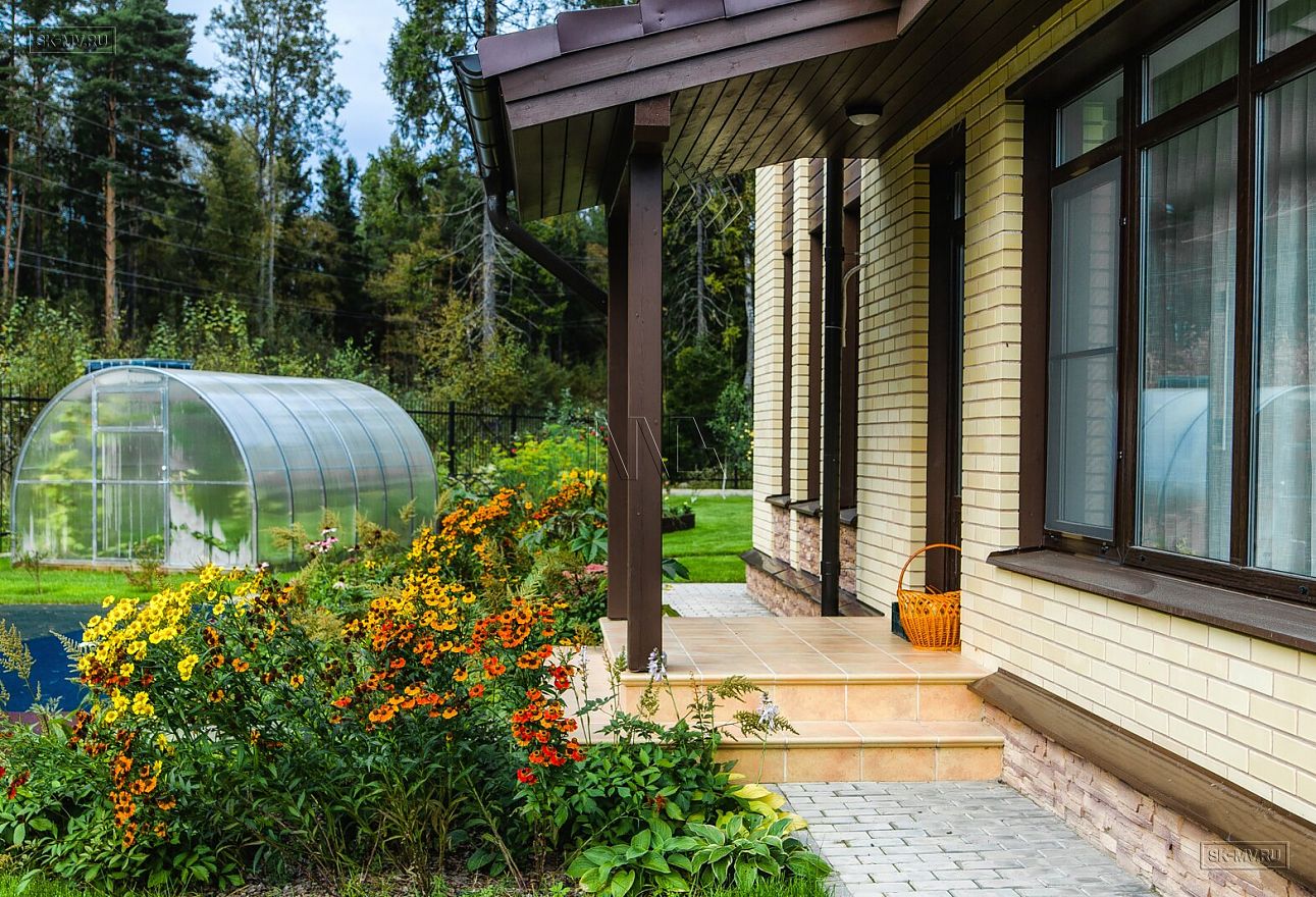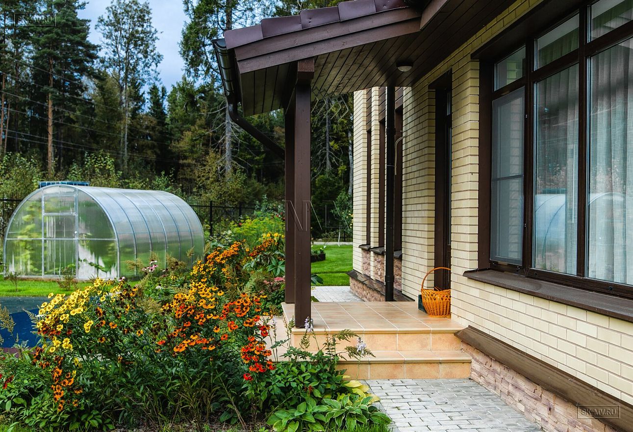 Дом уникальный и очень удобный. Если учесть, что дом расположился на очень небольшом участке, то можно похвалить архитектора, который грамотно его посадил на генплане. Комфортно распложен въезд на участок и вход в дом, что не вынуждает хозяев с тяжелыми сумками бежать еще 300 м по дорожкам своего домовладения. Гостиная обернута в сторону вечернего западного солнышка, вот веранда выходит лицом на две стороны.