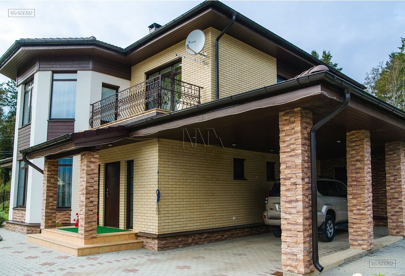 На фотографиях газобетонный дом в классическом стиле площадью 275 кв.м с комбинированной фасадной отделкой, построенный по проекту «Сосновый бор 7» в коттеджном поселке «Сосновое» Ленинградской области.