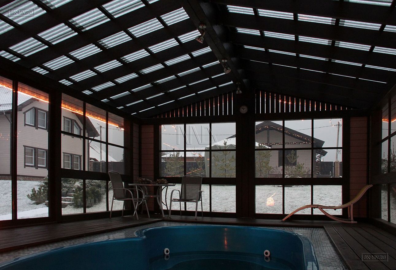Площадь комплекса 120 кв.м включает небольшой бассейн с панорамным остеклением, финскую парную и комнату отдыха с кухней.