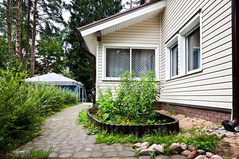 Отделка фасада выполнена Заказчиком самостоятельно светлыми бежевыми панелями сайдинга. Работа наших специалистов заключалась в монтаже фундаментной плиты с трубами теплого пола и в возведении и утеплении несущие и ограждающие конструкции дома. Это достаточно распространенная практика, когда Заказчик по разным причинам желает принимать активное самостоятельное участие в строительстве дома, выполняя функции прораба, и не нуждается в услугах по строительству дома «под ключ».