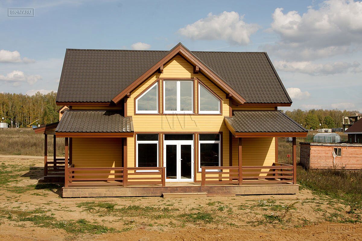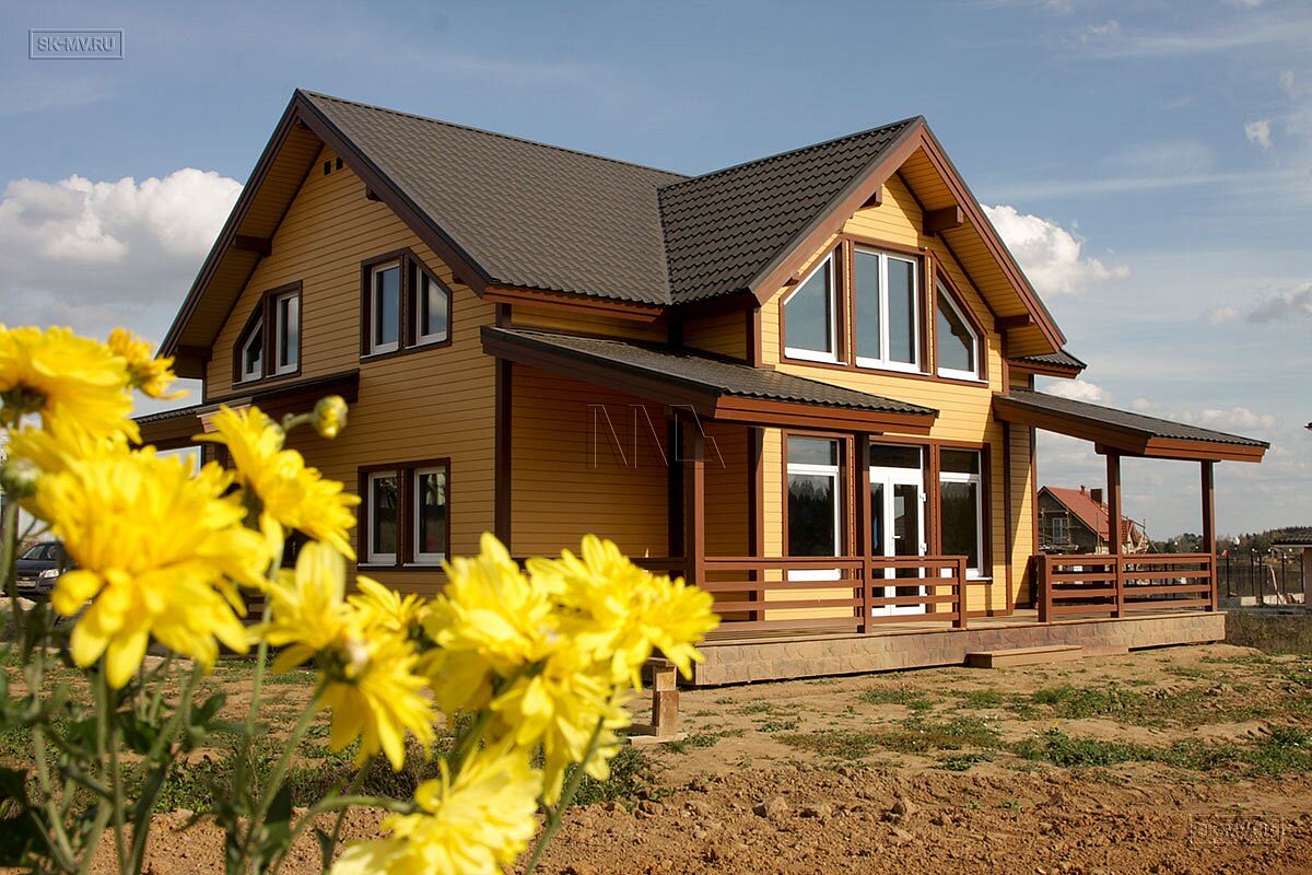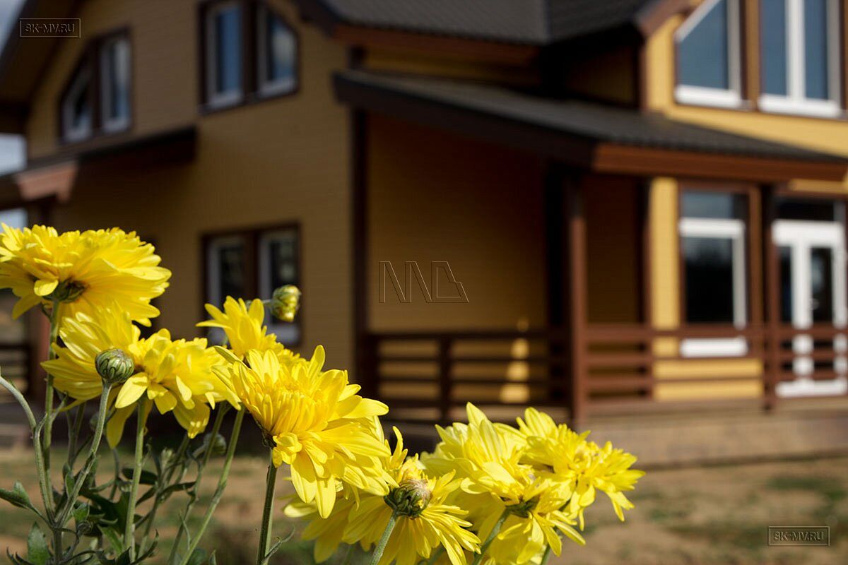 Представленный на фотографиях радостный яркий каркасный дом в коттеджном поселке бизнес-класса для постоянно проживания «Цветочный» в поселении Краснопахорское Троицкого административного округа города Москвы (Новая Москва) построен по проекту МВ 5 с его адаптацией по желанию заказчика, которому понравился этот проект и его планировочное решение.