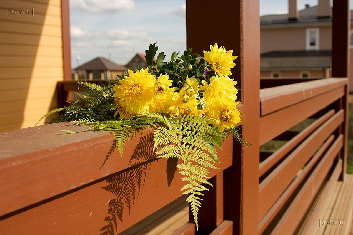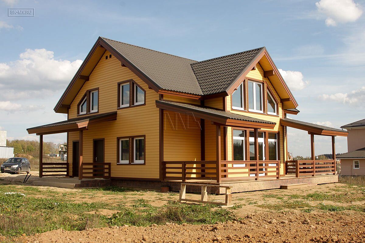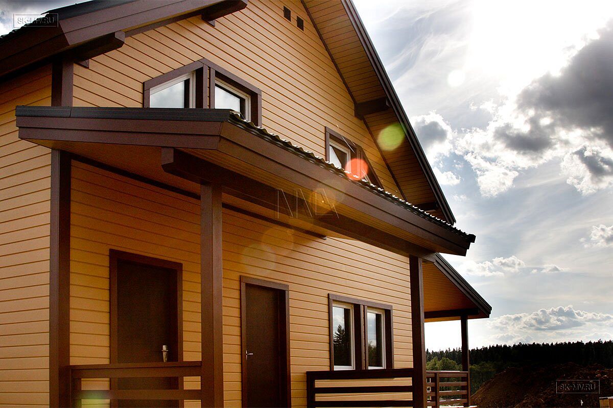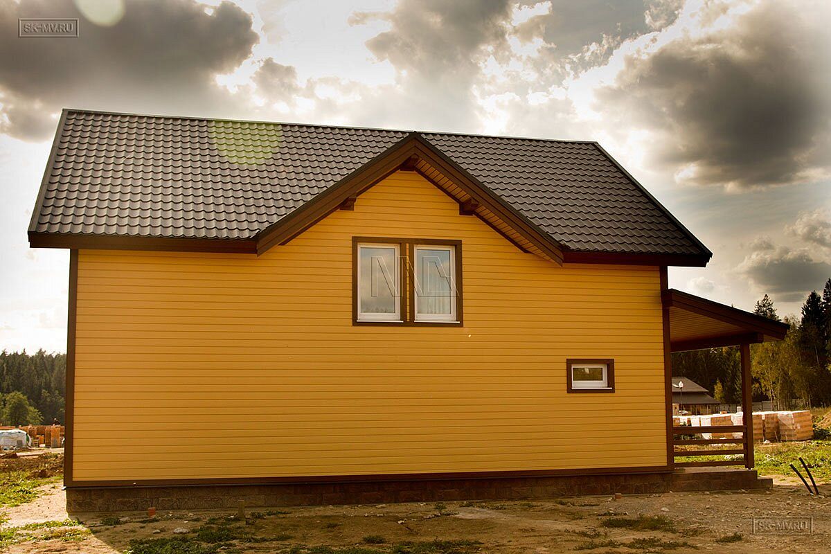 Представленный на фотографиях радостный яркий каркасный дом в коттеджном поселке бизнес-класса для постоянно проживания «Цветочный» в поселении Краснопахорское Троицкого административного округа города Москвы (Новая Москва) построен по проекту МВ 5 с его адаптацией по желанию заказчика, которому понравился этот проект и его планировочное решение.
