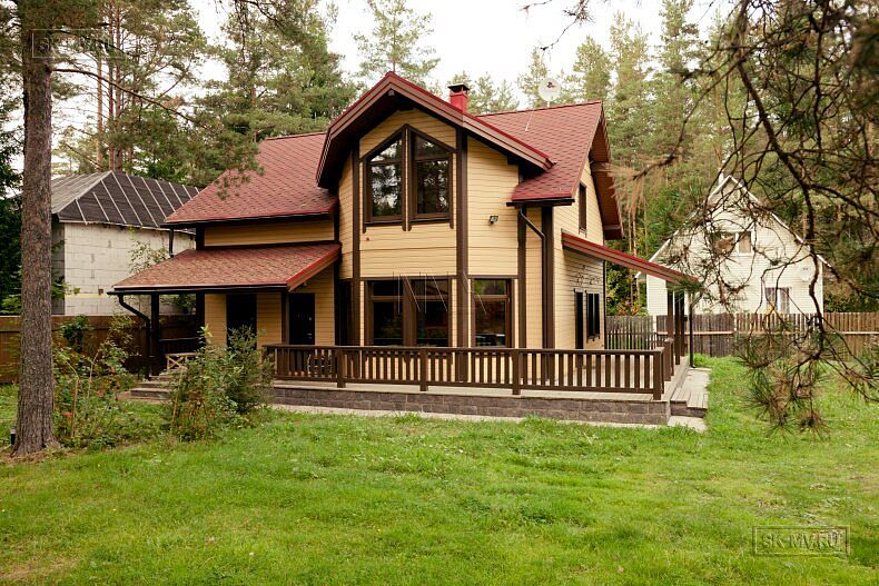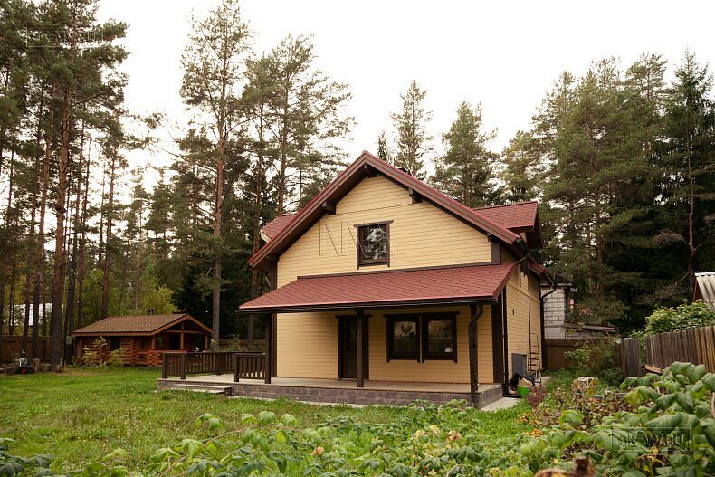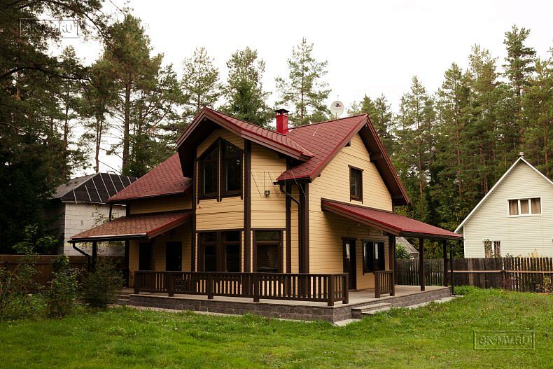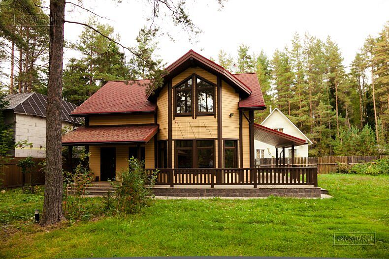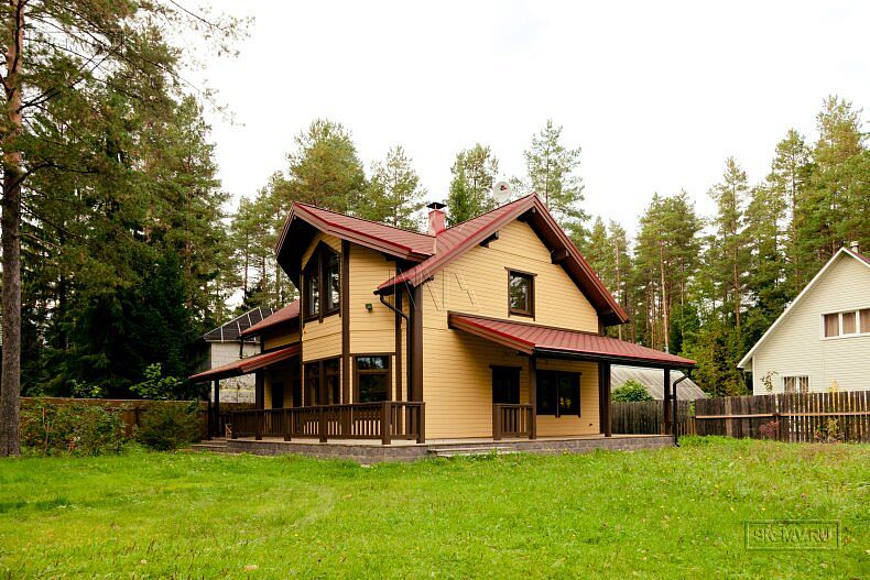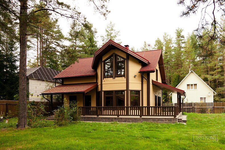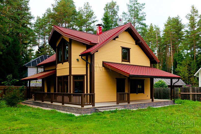 Для фасадной отделки использовалась отделочная доска покрытая финскими колерованными красками Винха. Необычно смотрится красная мягкая черепица, которая добавляет оранжевый оттенок желтой вагонке. Образ дома собирают коричневые декоративные планки, ограждения, планки подшивка свесов и металлические водостоки.