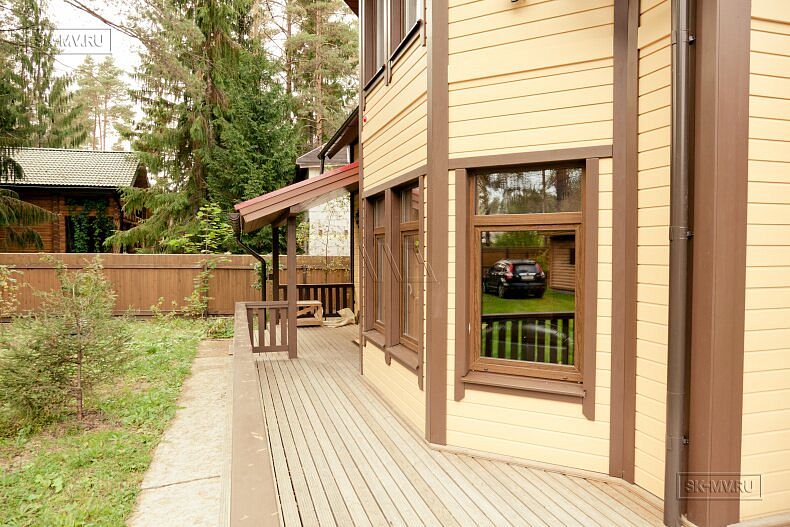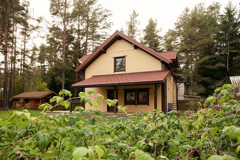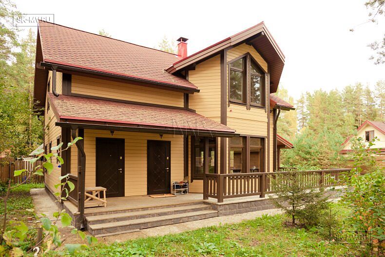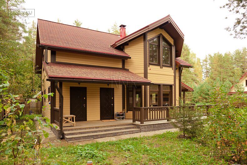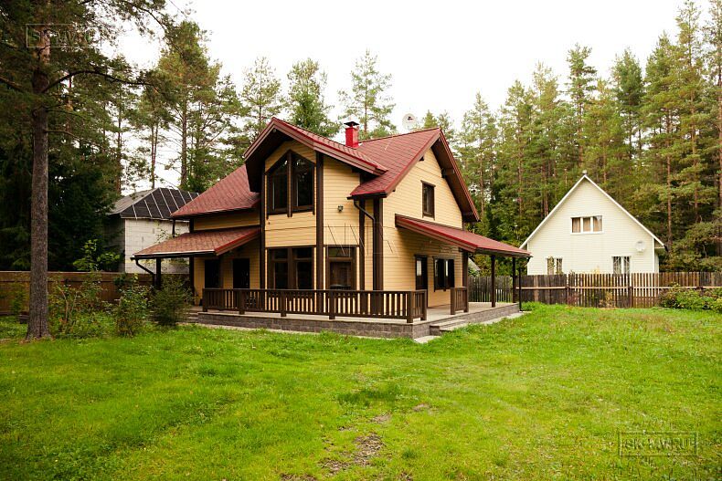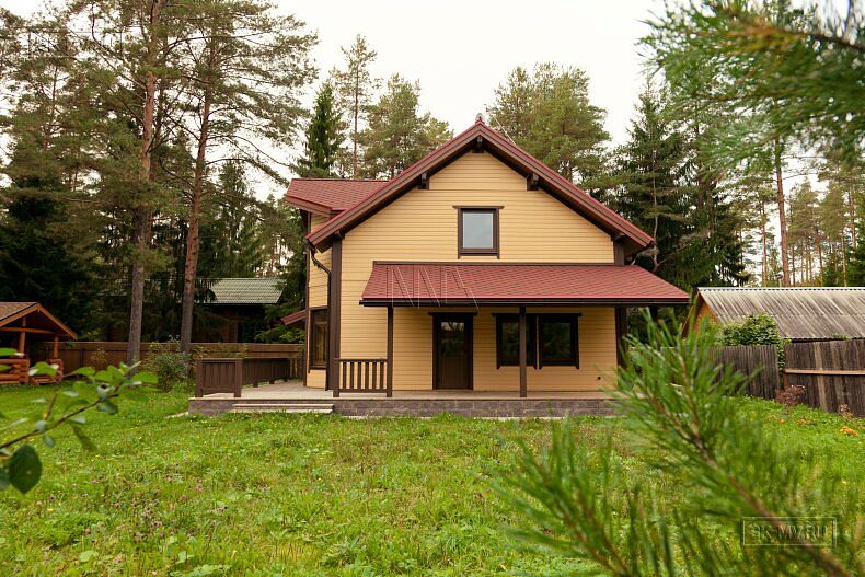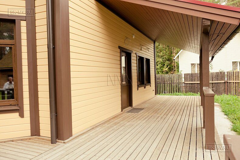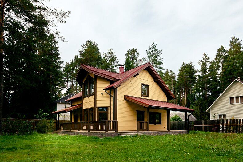 Для фасадной отделки использовалась отделочная доска покрытая финскими колерованными красками Винха. Необычно смотрится красная мягкая черепица, которая добавляет оранжевый оттенок желтой вагонке. Образ дома собирают коричневые декоративные планки, ограждения, планки подшивка свесов и металлические водостоки.