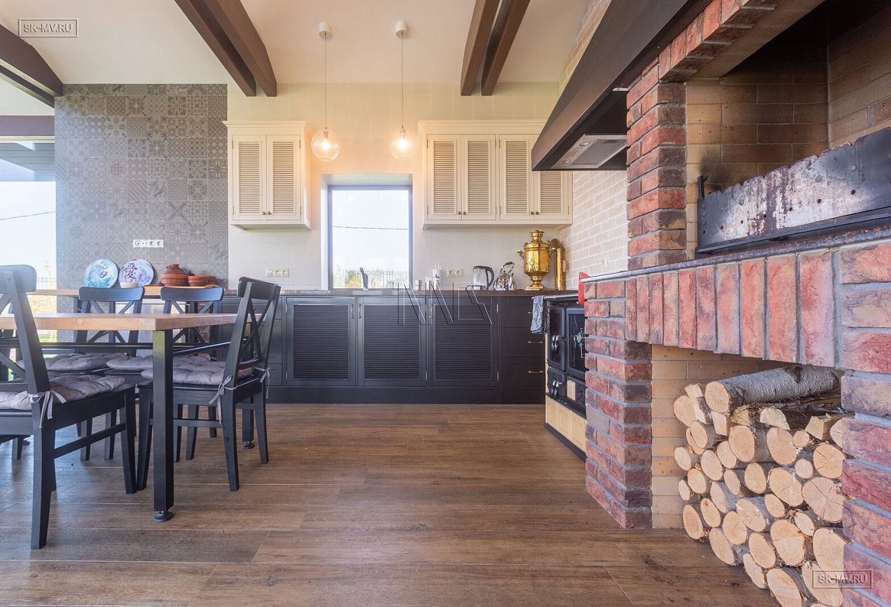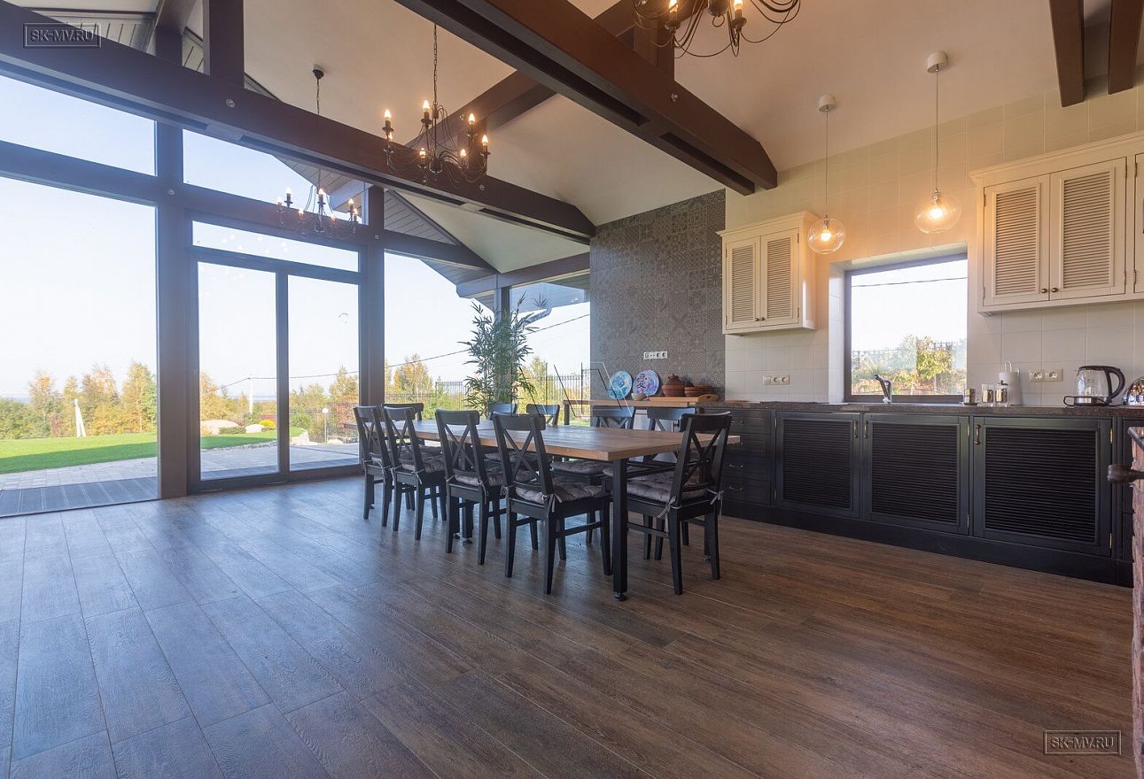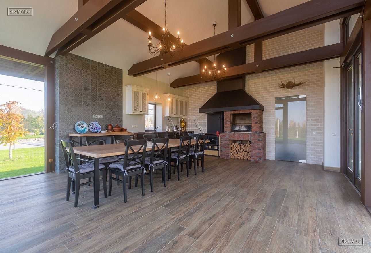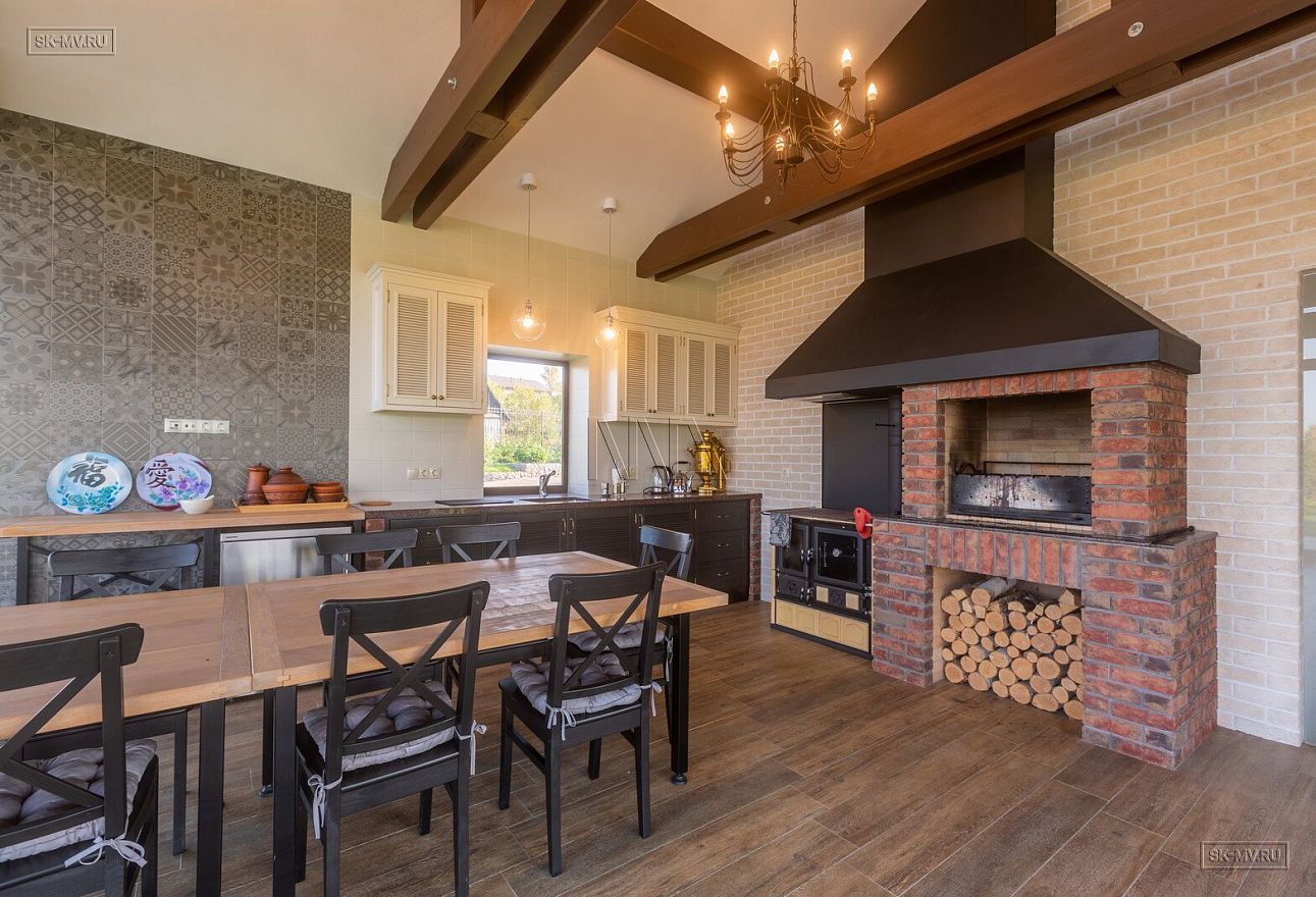 Интерьер летней кухни площадью 120 кв.м в Пениках Ломоносовского района Санкт-Петербурга. Летняя кухня построена по технологии фахверк в едином ансамбле с основным домом.