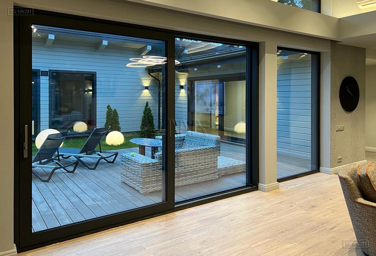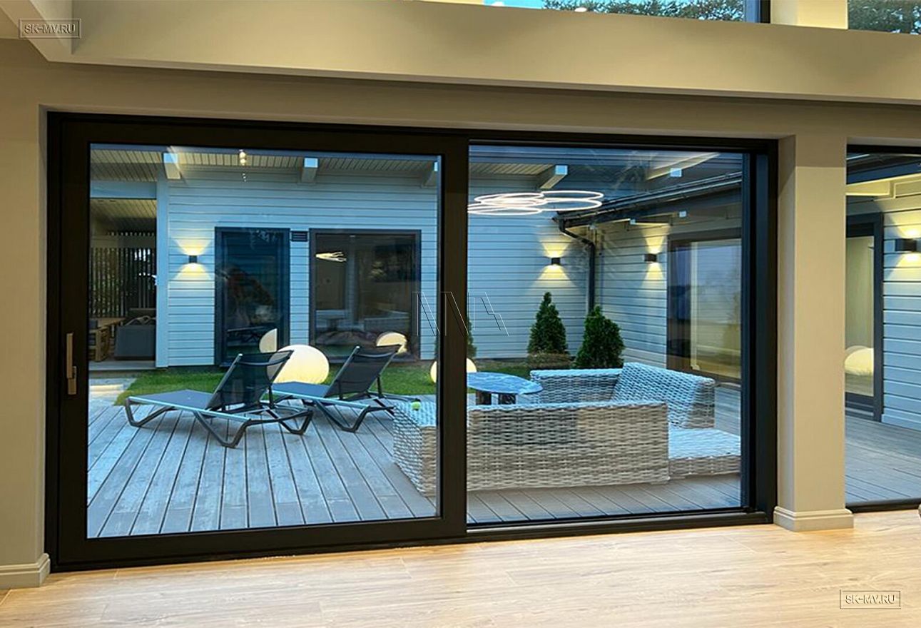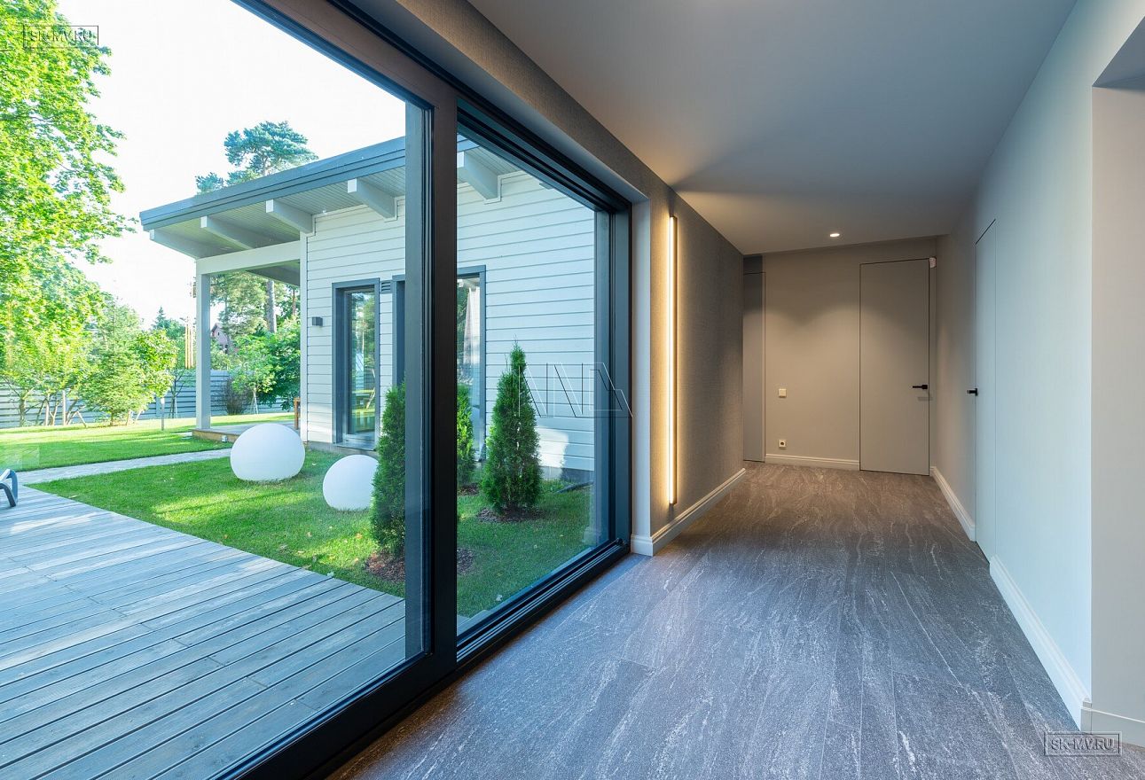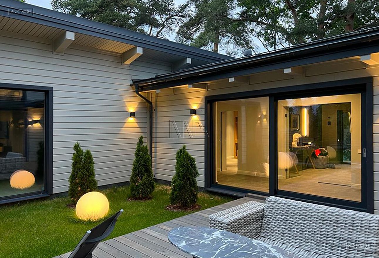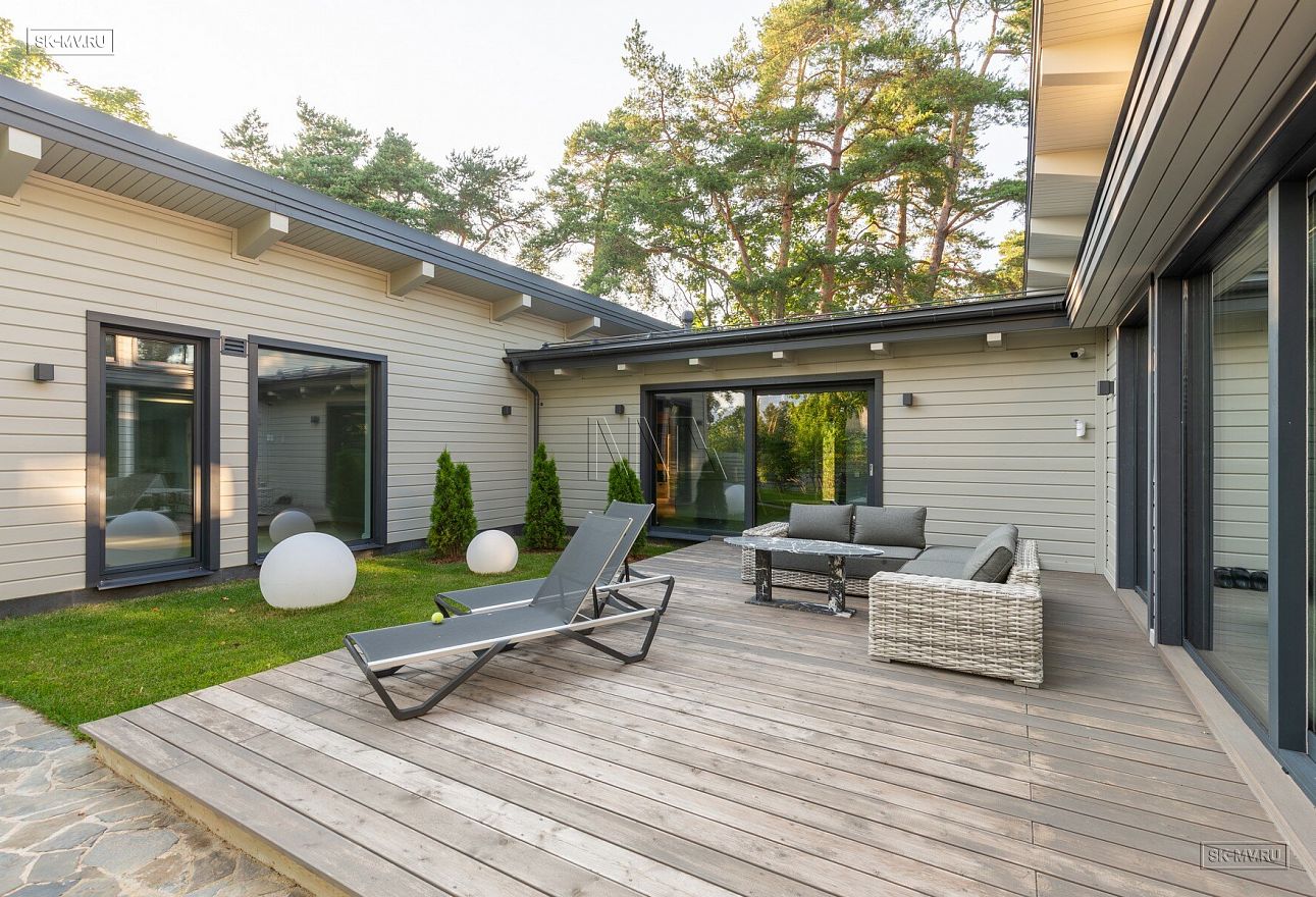 Дом построен в форме буквы П, что позволило создать уютный внутренний дворик-террасу. На террасу ведут большие раздвижные панорамные окна из гостиной-столовой.