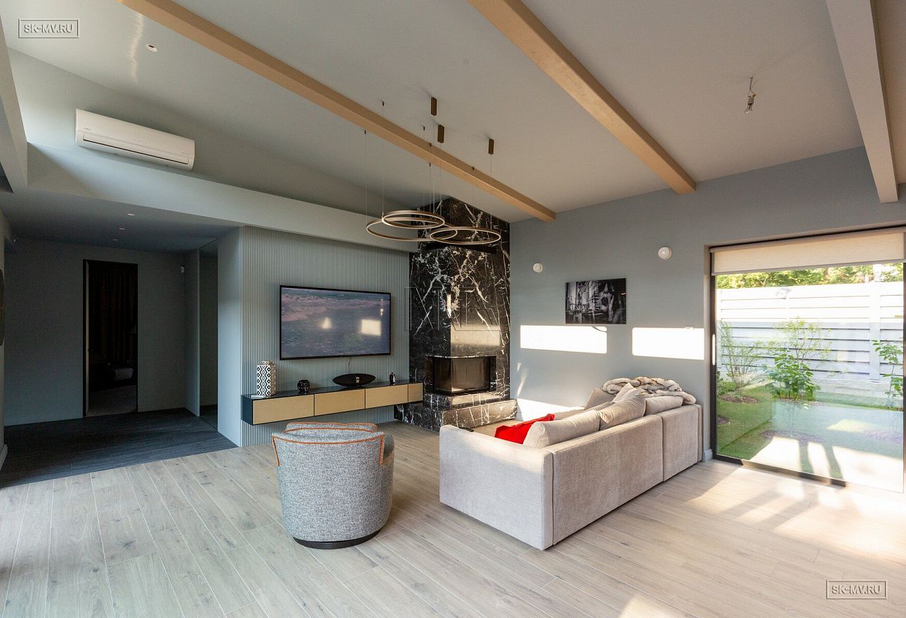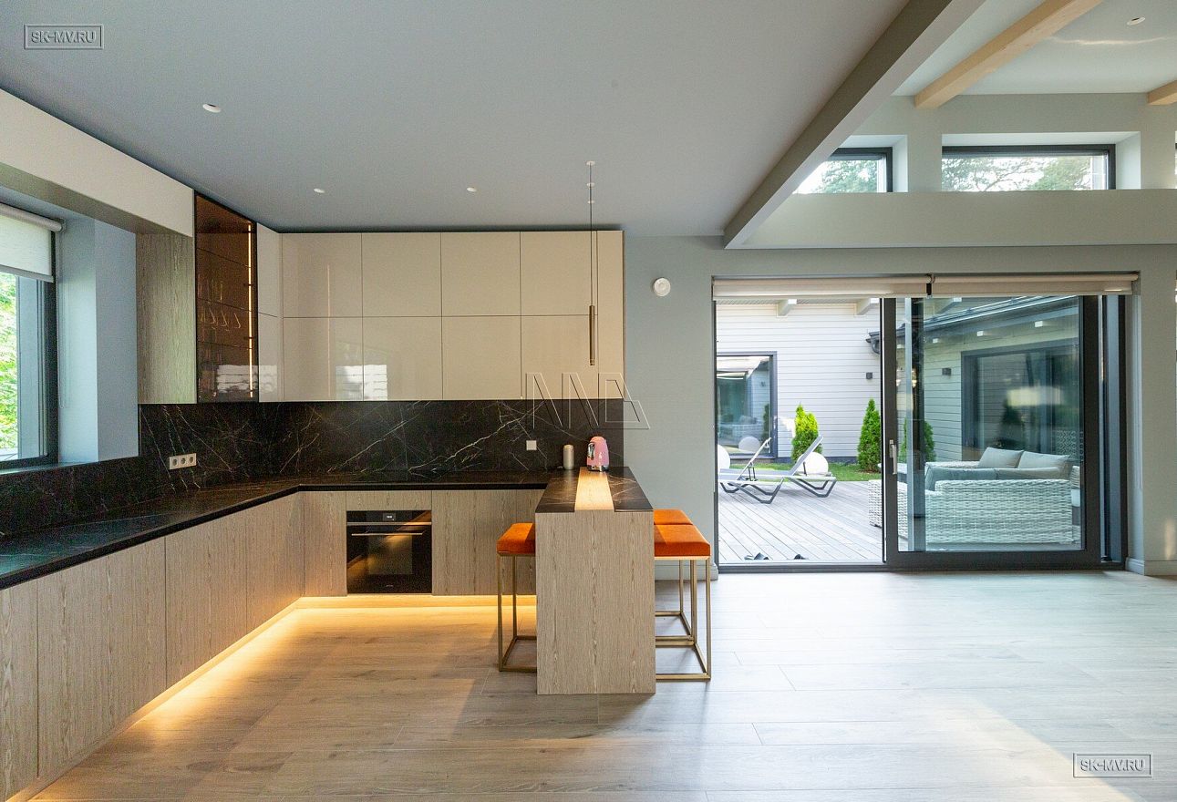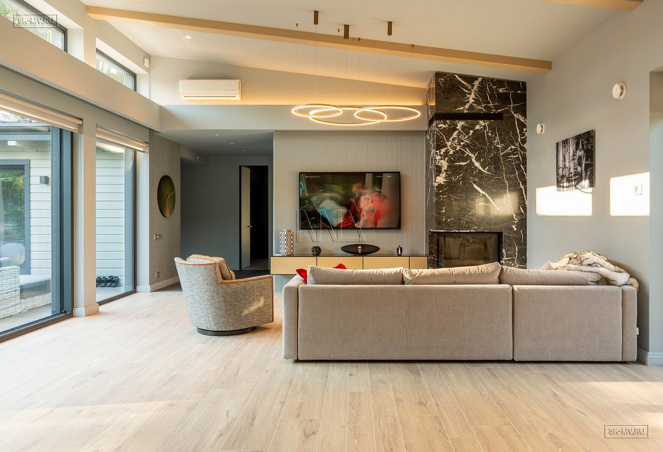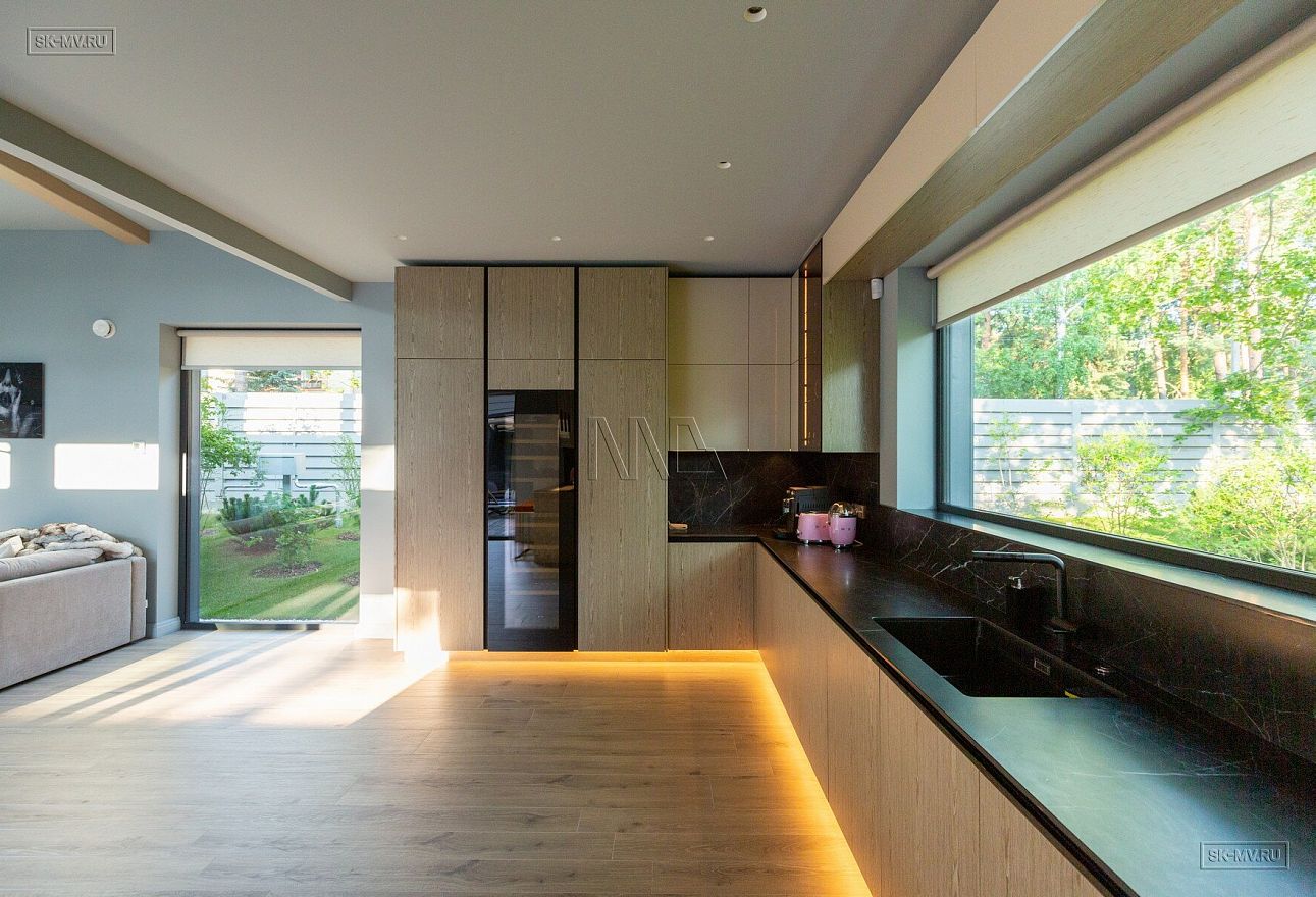На фотографиях представлен интерьер П-образного загородного дома в Сестрорецке площадью 238 кв м, построенного СК Медный Всадник по каркасной технологии. Этот дом - идеальный пример скандинавской простоты и функциональности.