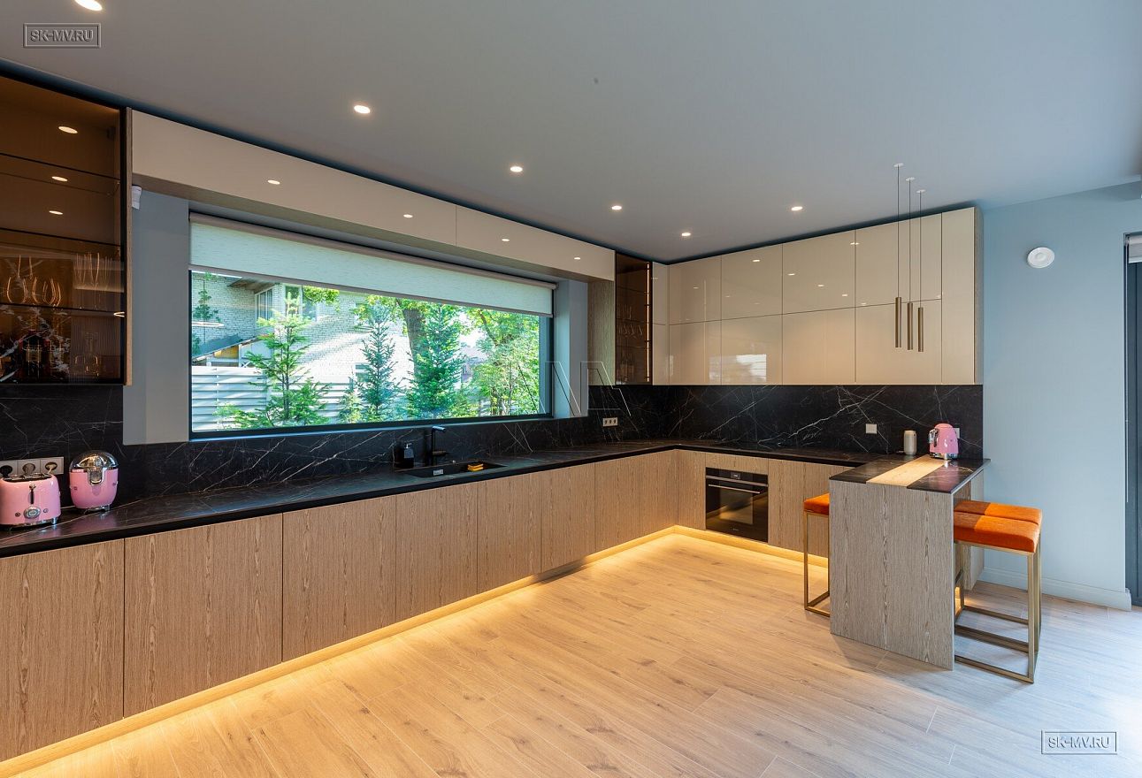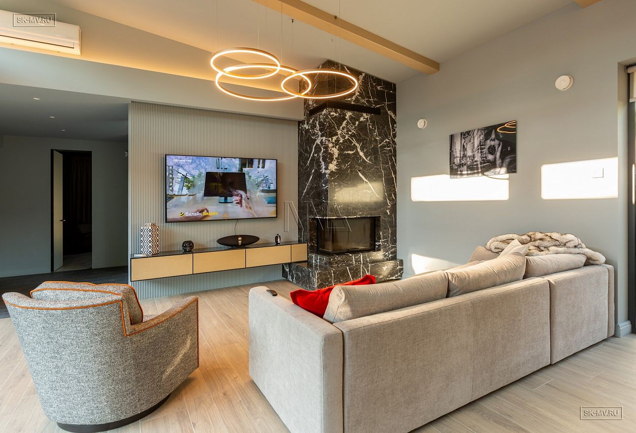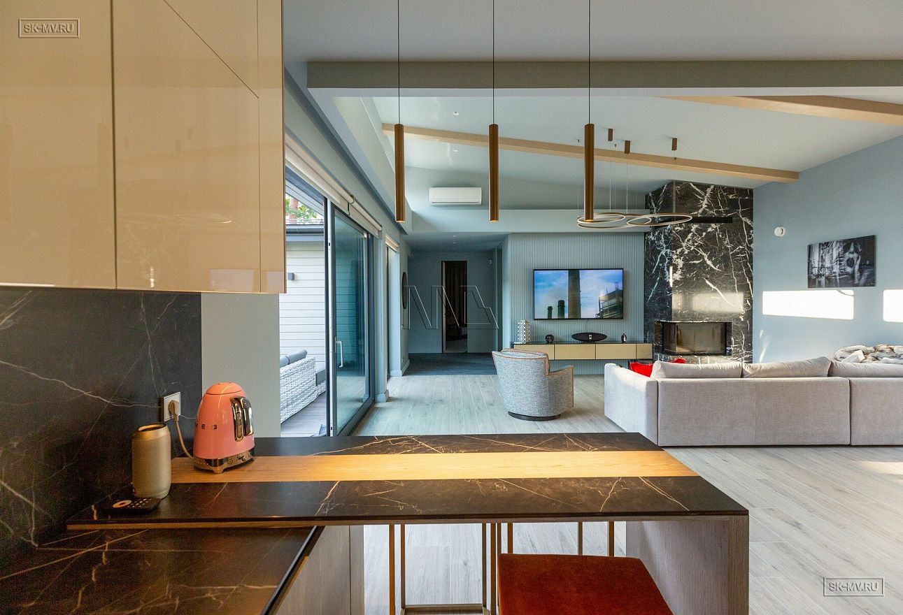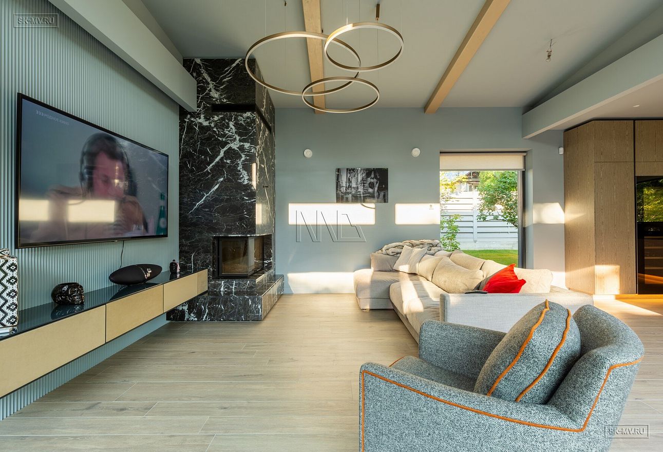 На фотографиях представлен интерьер П-образного загородного дома в Сестрорецке площадью 238 кв м, построенного СК Медный Всадник по каркасной технологии. Этот дом - идеальный пример скандинавской простоты и функциональности.