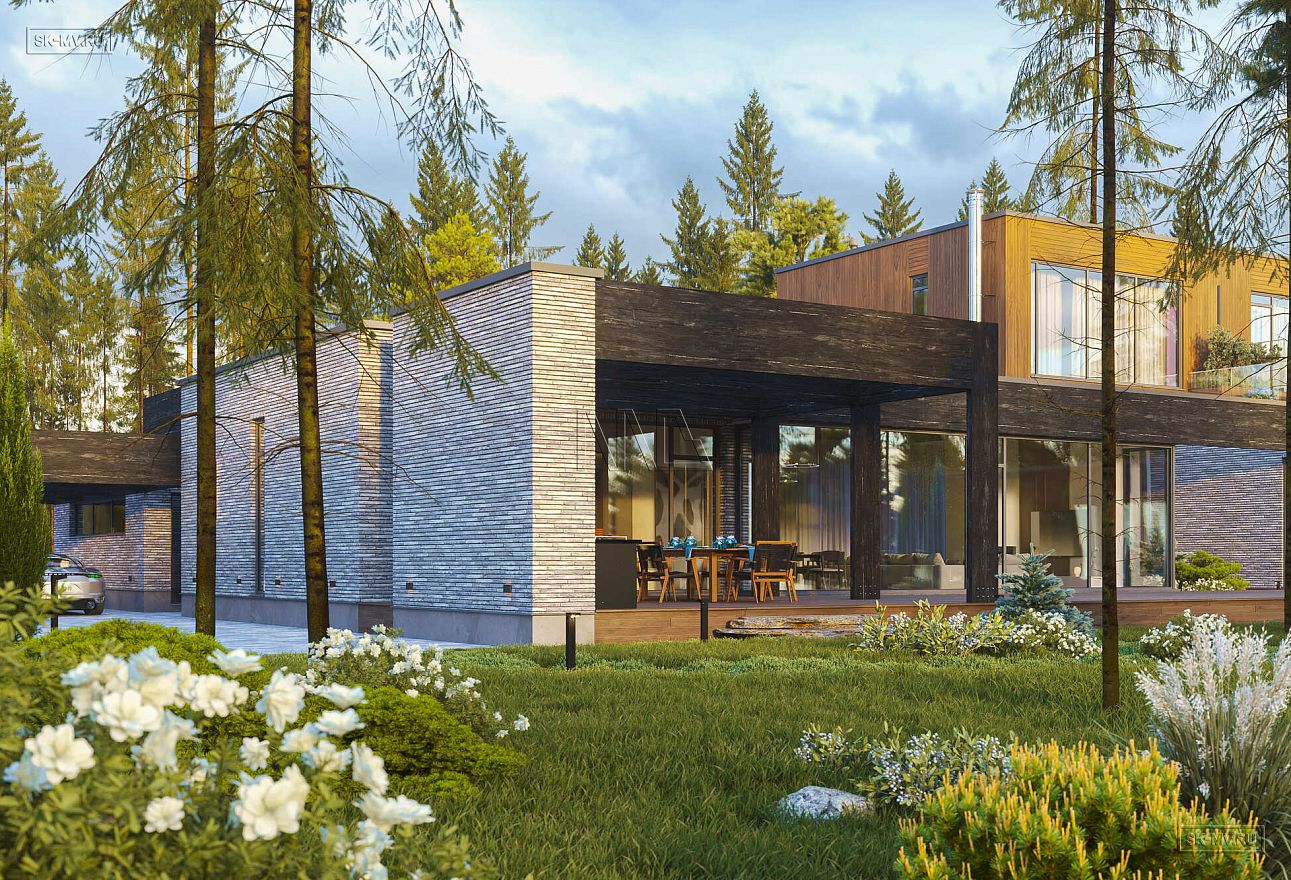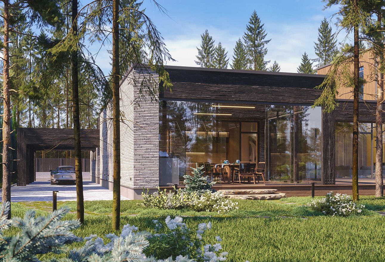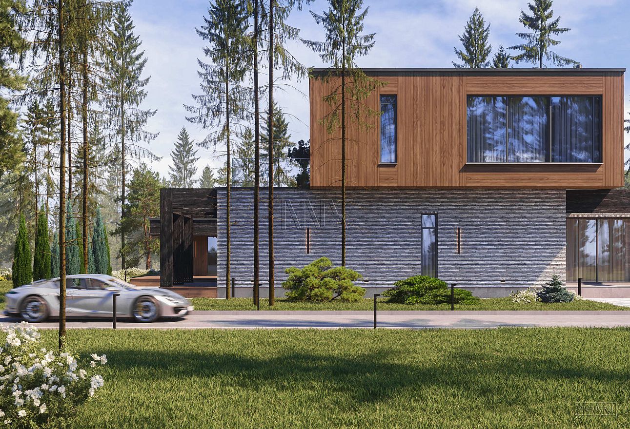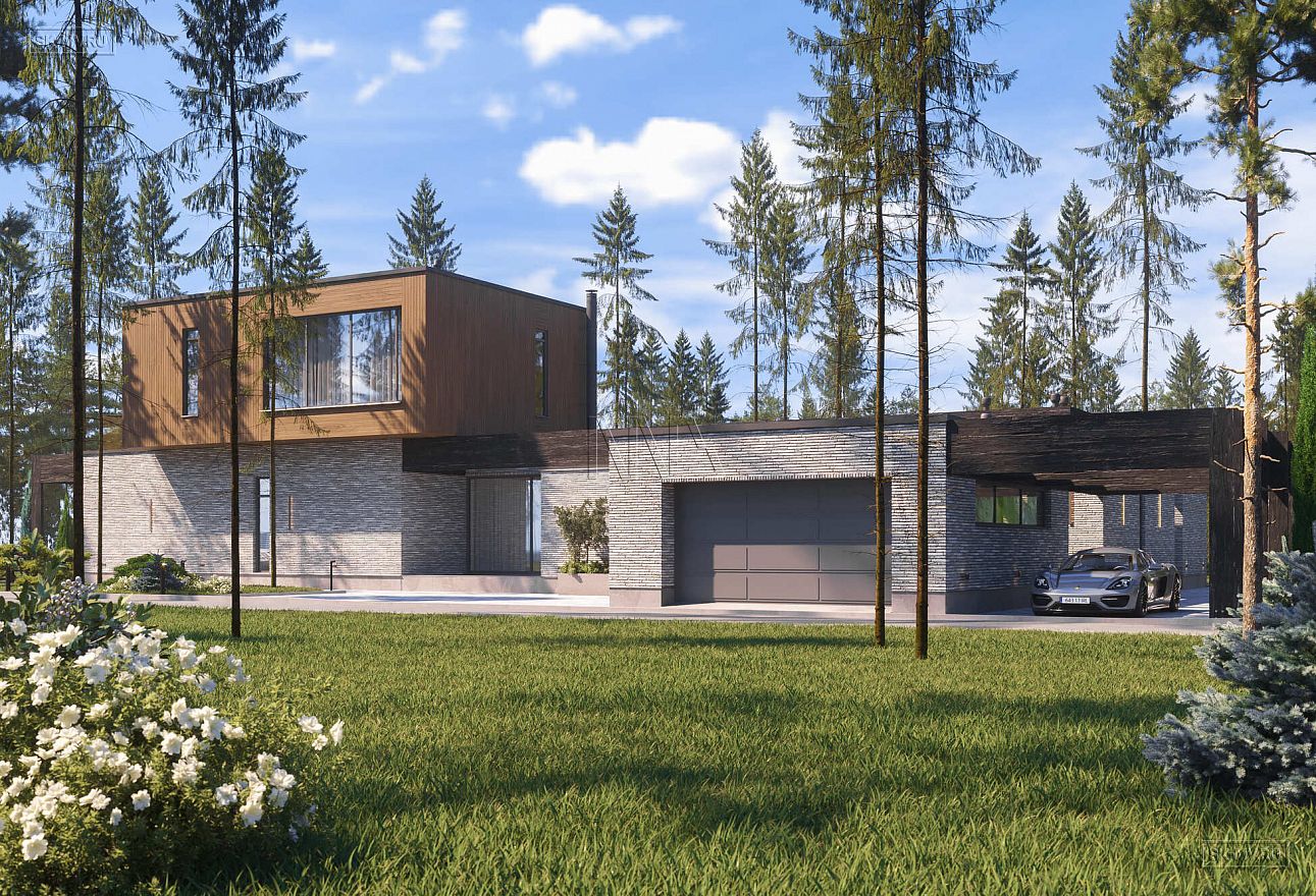 Дом выполнен в современном стиле, что подчеркивают такие элементы, как плоская кровля, минималистичная облицовка, широкие панорамные окна в пол. Экстерьер отличается сдержанными натуральными цветами: облицовочный кирпич смешанных оттенков светло-коричневого тона, темное и светлое дерево.