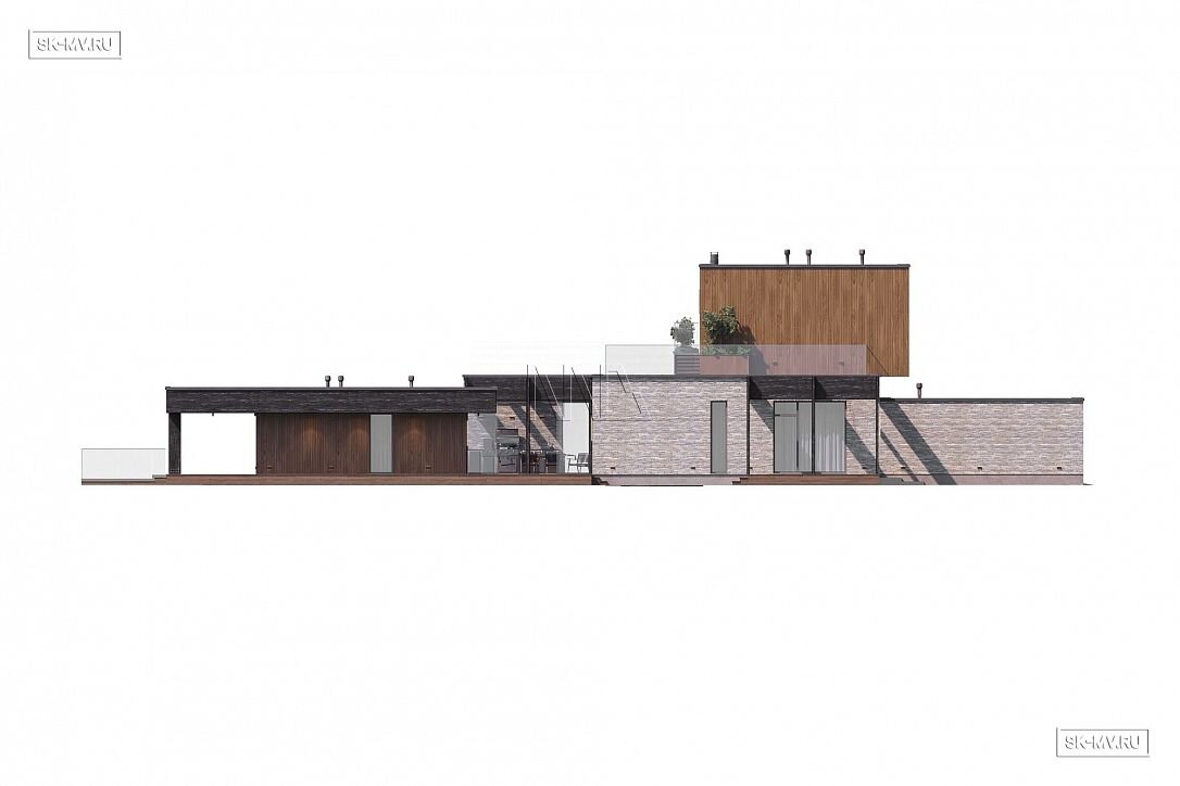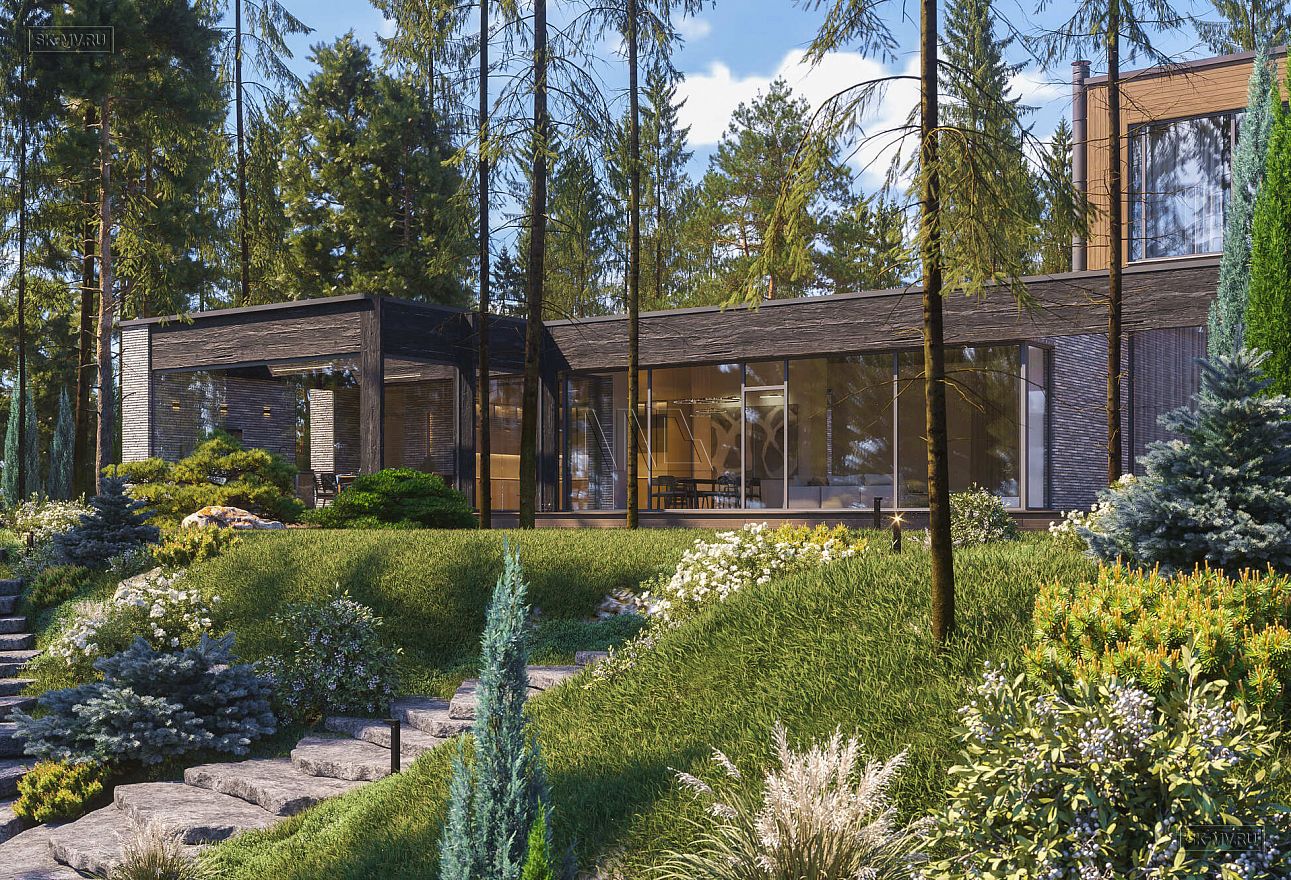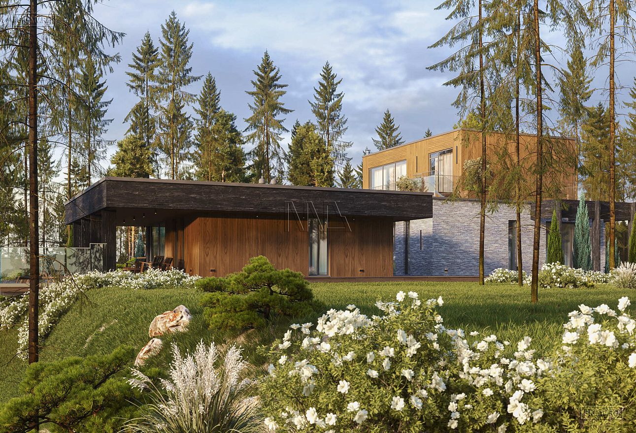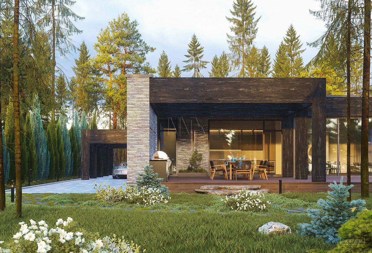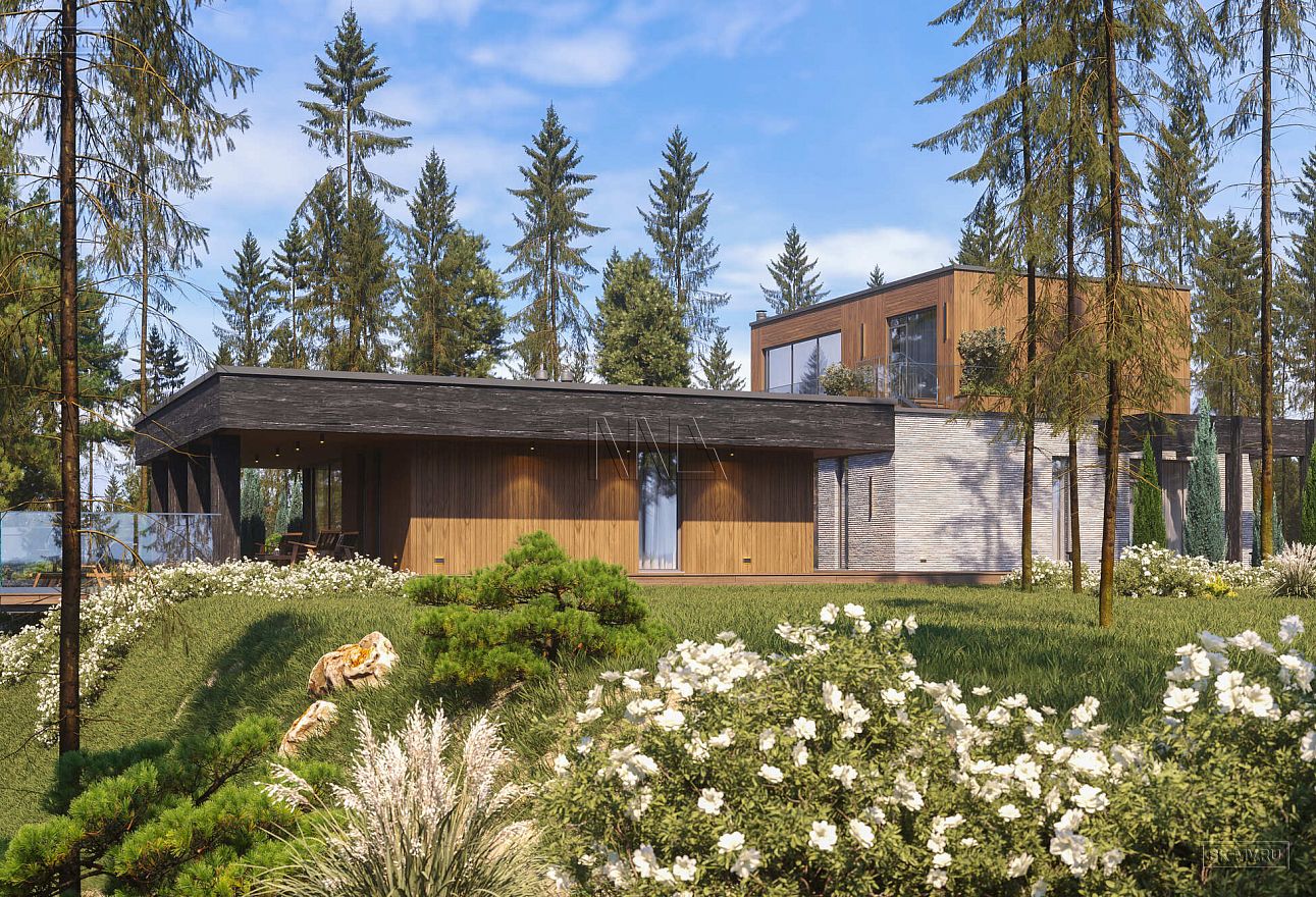 Дом выполнен в современном стиле, что подчеркивают такие элементы, как плоская кровля, минималистичная облицовка, широкие панорамные окна в пол. Экстерьер отличается сдержанными натуральными цветами: облицовочный кирпич смешанных оттенков светло-коричневого тона, темное и светлое дерево.