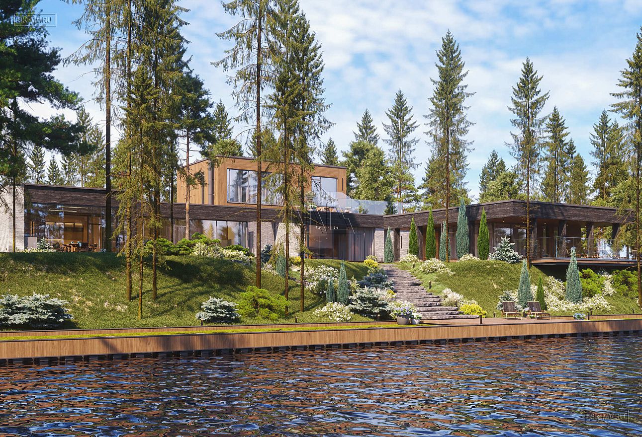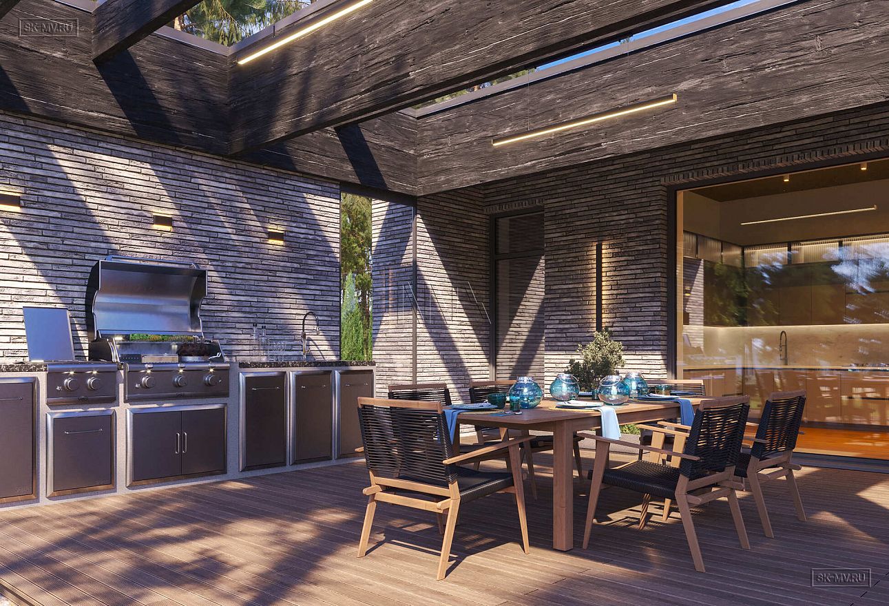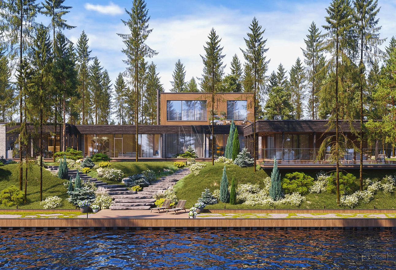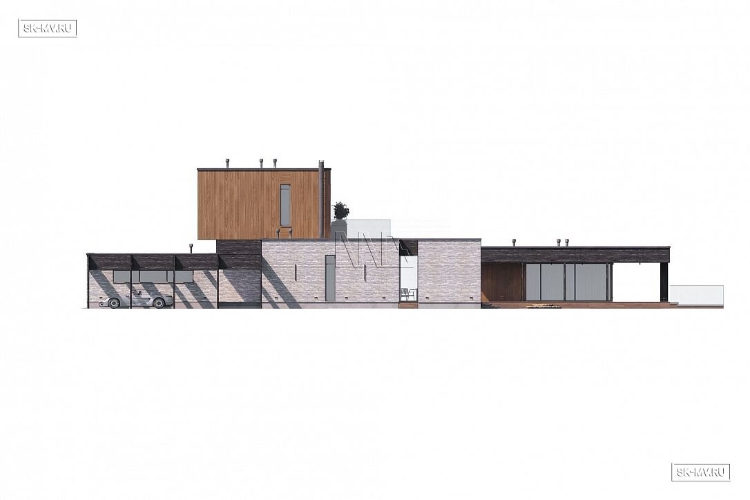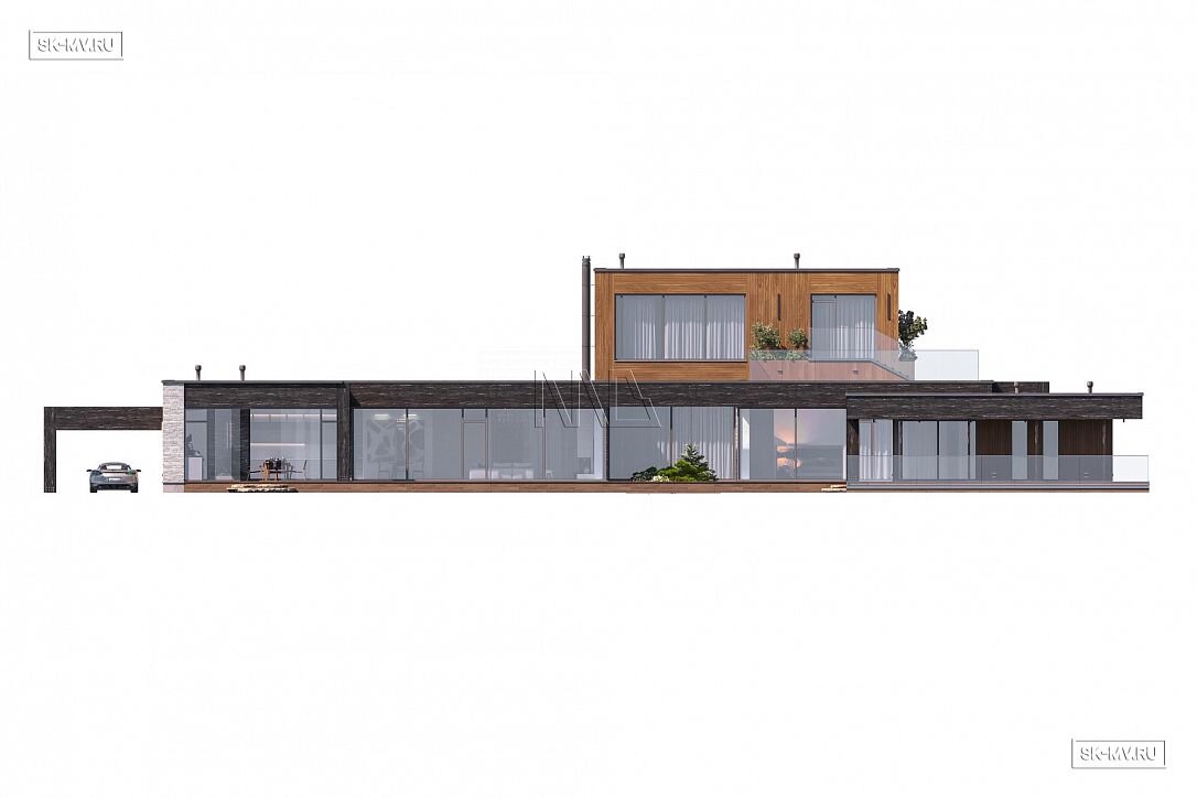 Дом выполнен в современном стиле, что подчеркивают такие элементы, как плоская кровля, минималистичная облицовка, широкие панорамные окна в пол. Экстерьер отличается сдержанными натуральными цветами: облицовочный кирпич смешанных оттенков светло-коричневого тона, темное и светлое дерево.