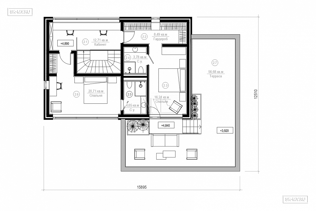 В доме предусмотрены спальни трех типов: стандартная комната, спальня с гардеробной и мастер-спальня с гардеробной и ванной.