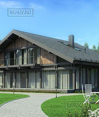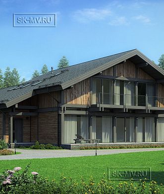 Проект двухэтажного загородного дома «Аврора» с большой террасой барбекю, баней, гаражом и автонавесом. Площадь дома — 446,46 кв.м.