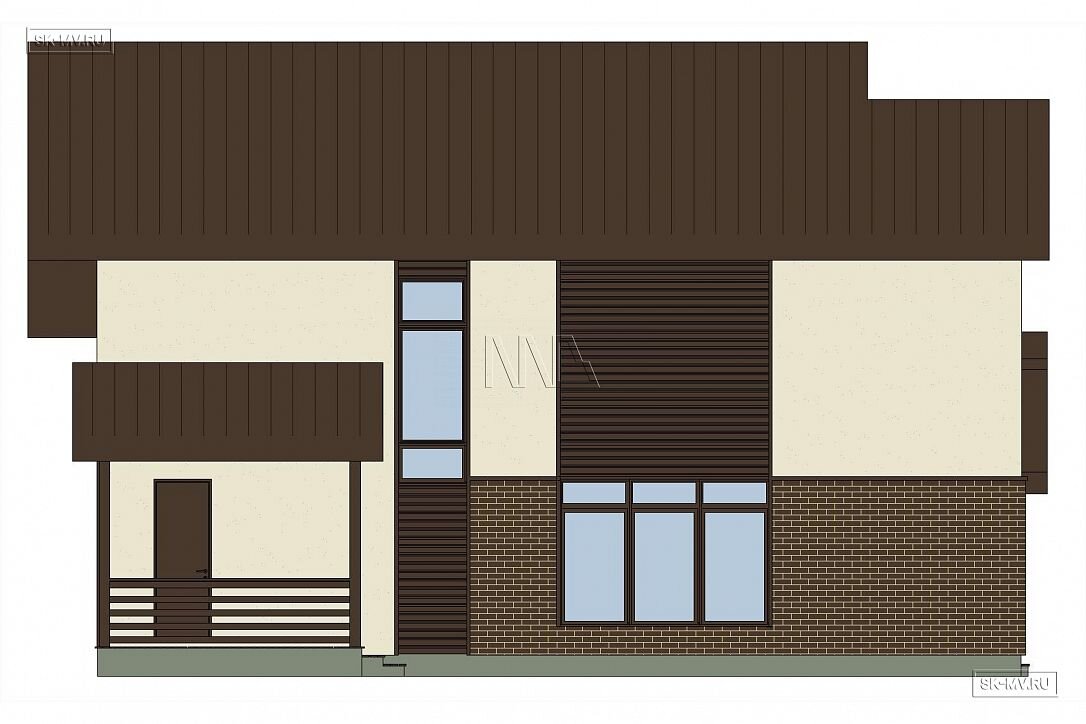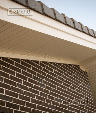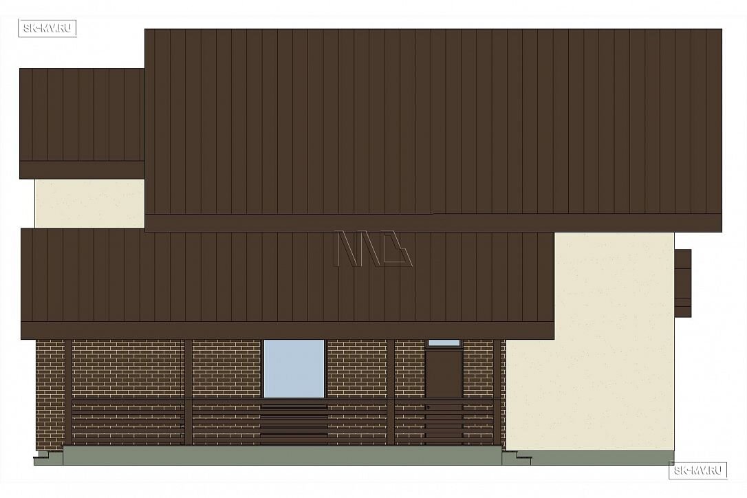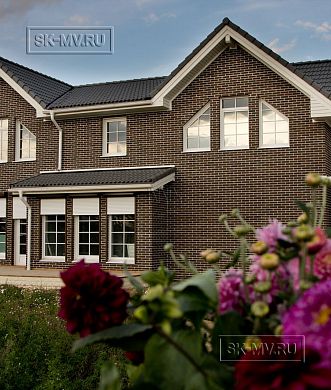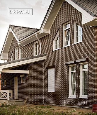 Отделочные материалы фасада подобраны в безупречной гармонии: бежевая штукатурка, рифленый кирпич коричневого цвета с расшивкой швов и вставки коричневой горизонтальной отделочной доски, которые не просто заполняют межоконное пространство, но и создают дизайнерскую имитацию оконного проема.