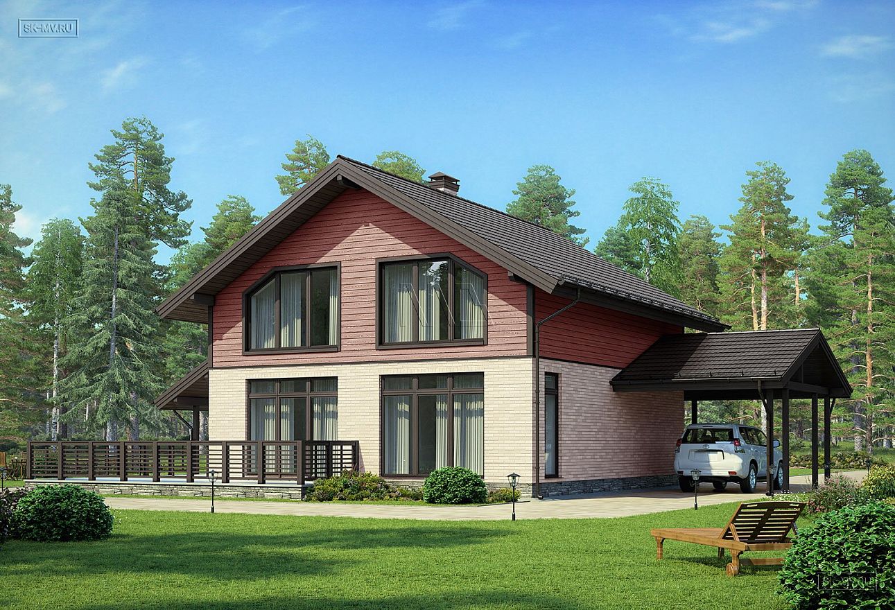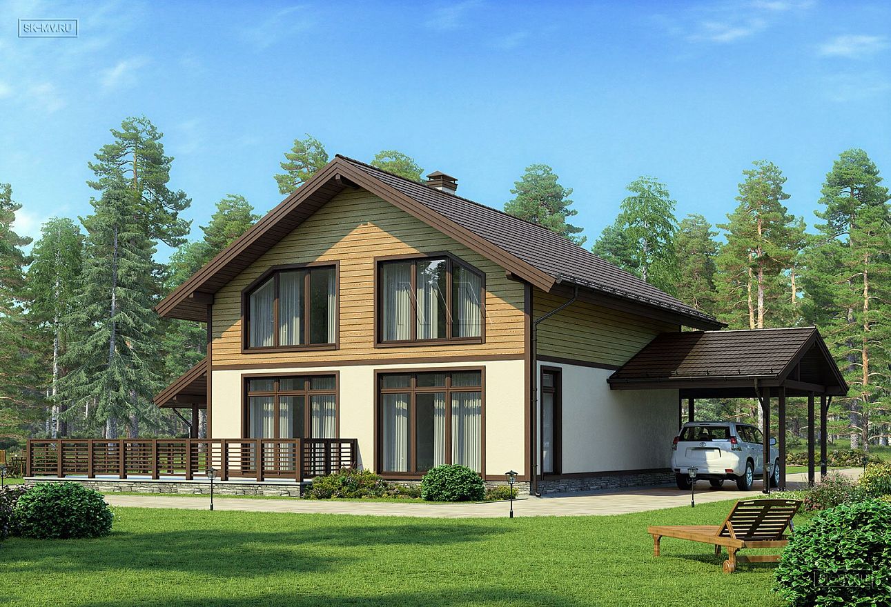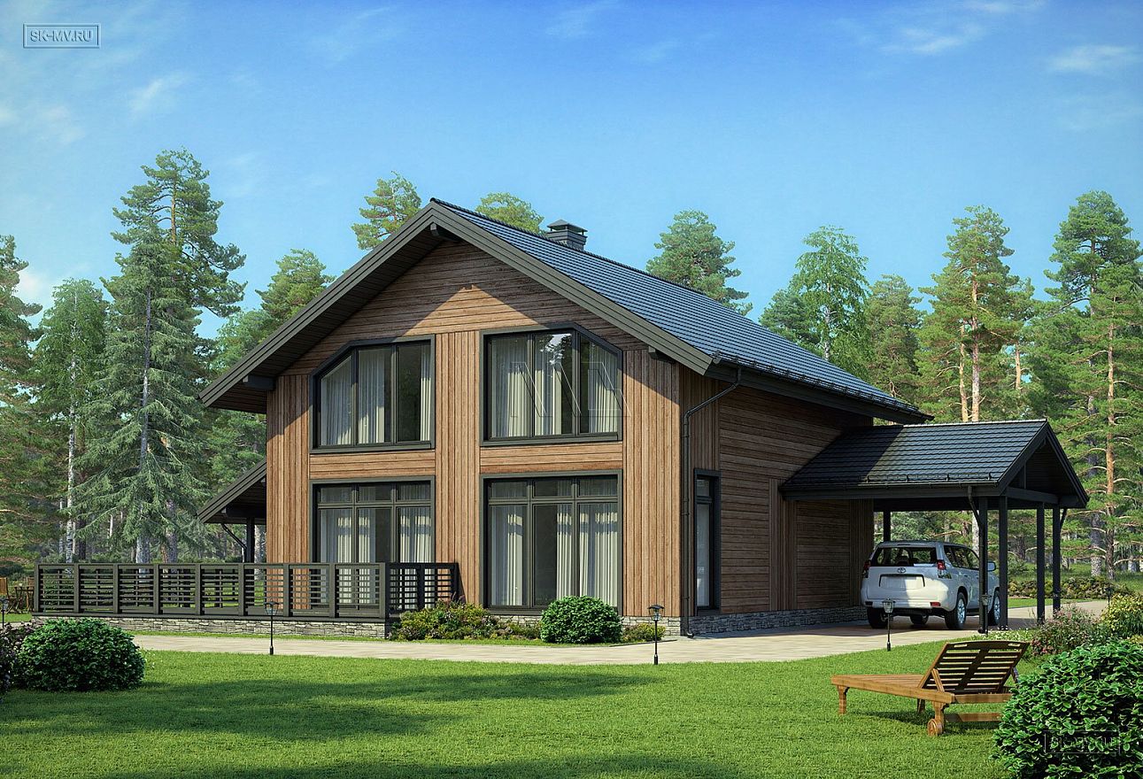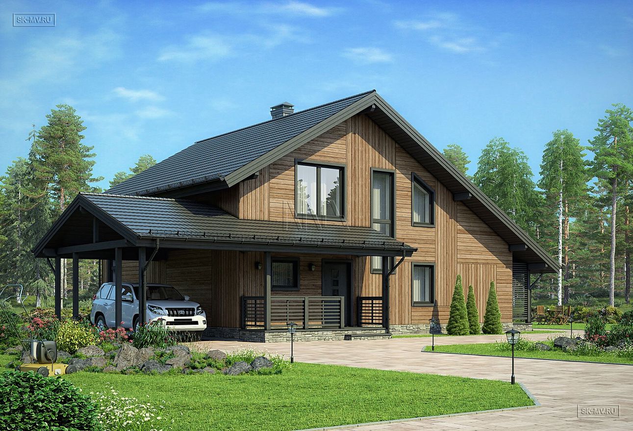 Проект «Айда дом» площадью 198 кв.м — современный комбинированный дом с навесом для автомобиля, сауной и большой террасой. Остановимся подробнее на том, что нам предложил архитектор: