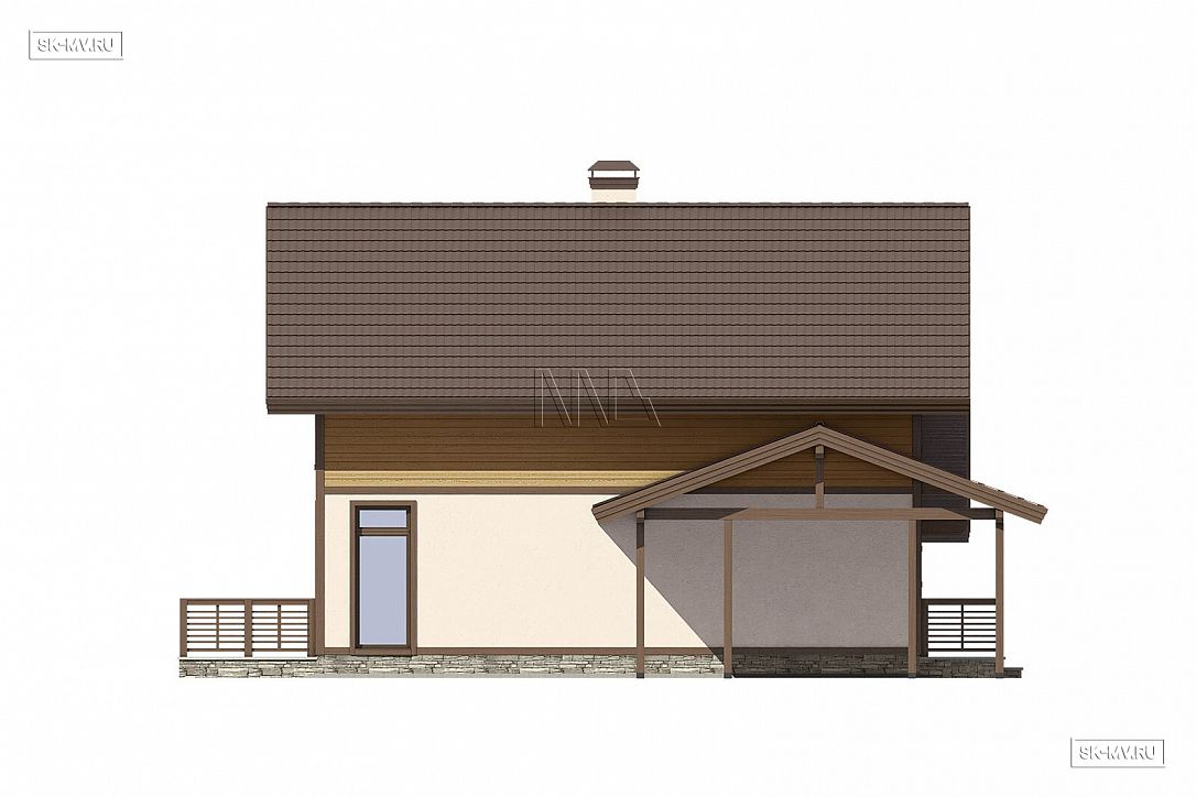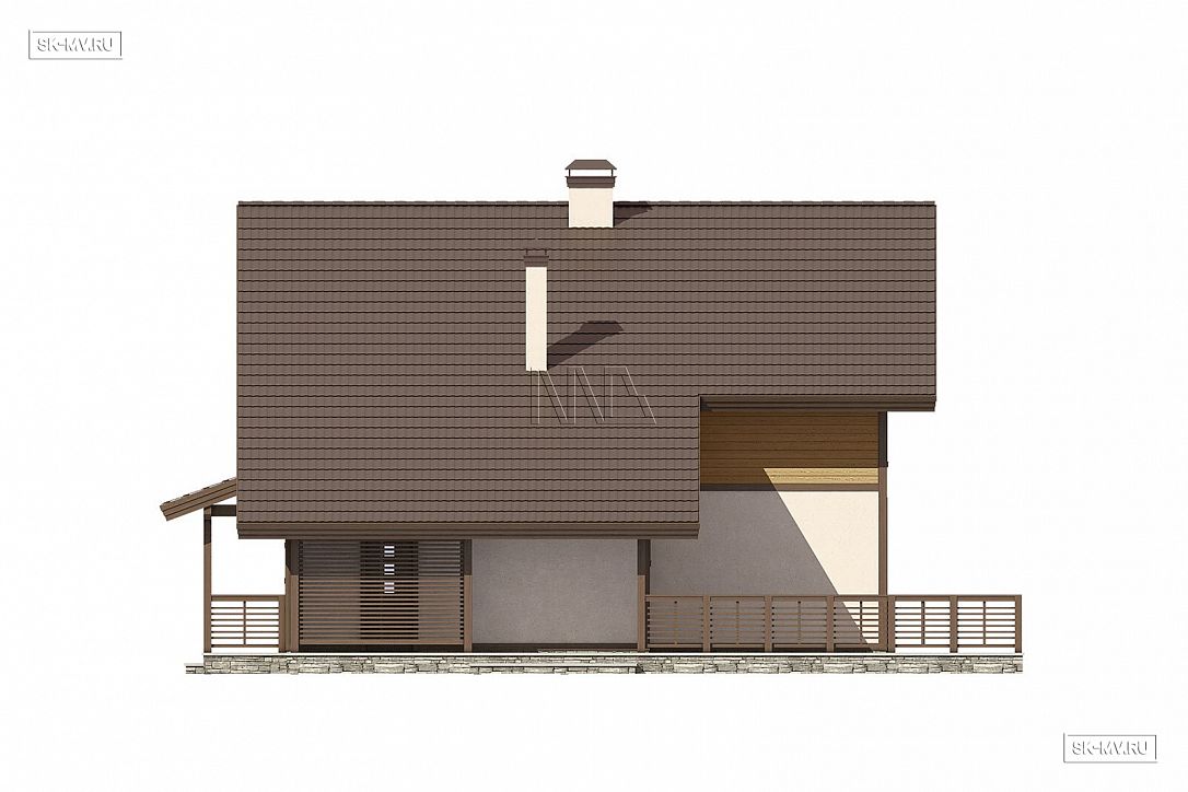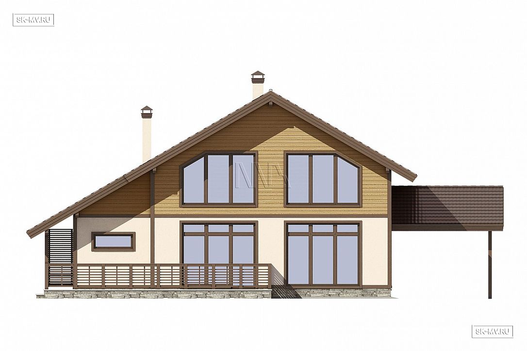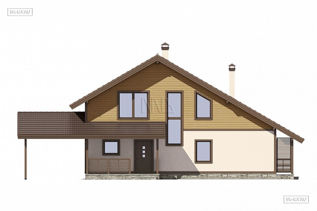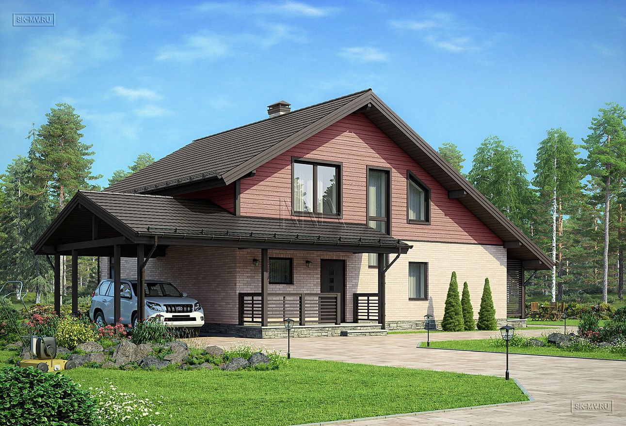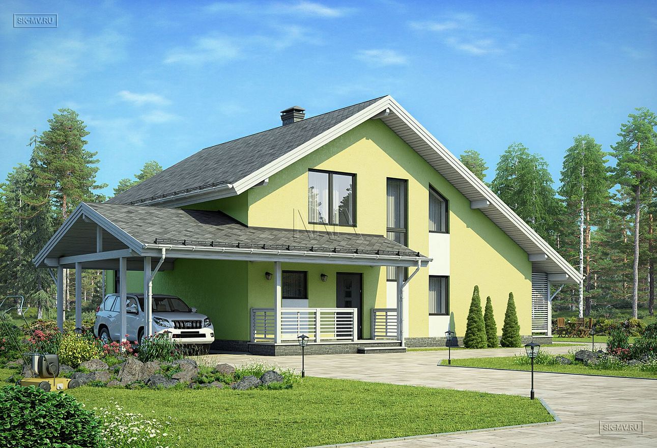 5. Навес для автомобиля является в этом проекте архитектурным элементом дома, переходя в кровлю над крыльцом. Можно удобно проходить с своему авто под крышей, например, в дождливую погоду. Для этого достаточно сделать иначе ограждение крыльца.