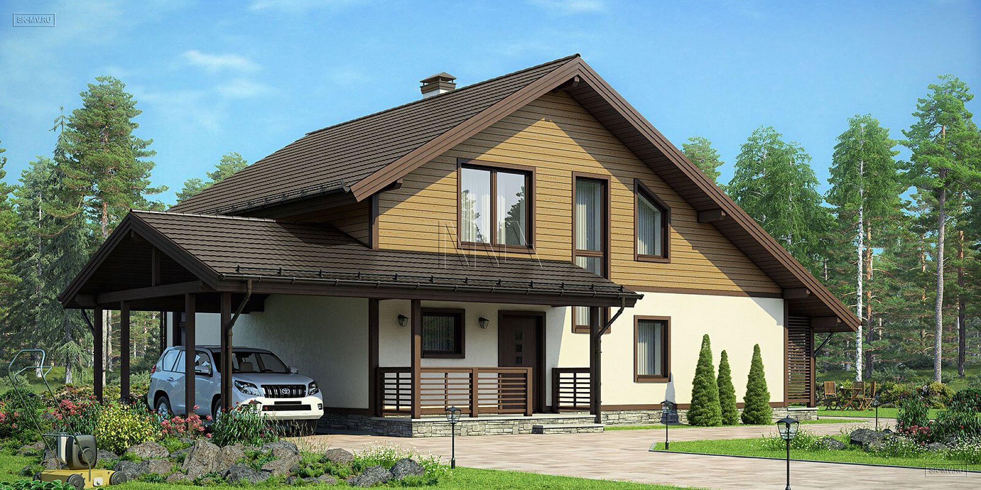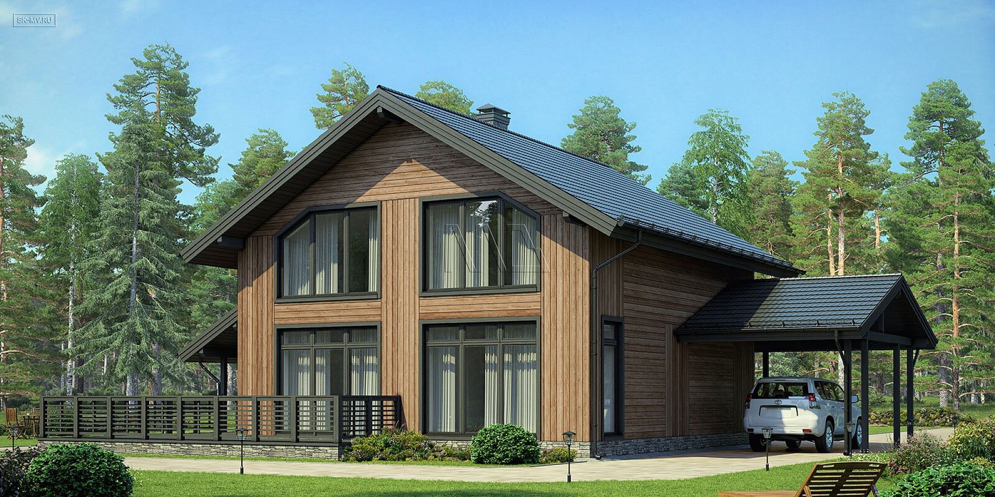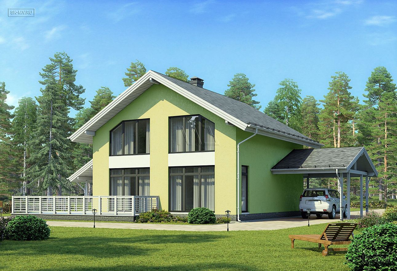 4. Что важно для современной загородной жизни? Автомобиль! В данном проекте архитектор предусмотрел навес для одного автомобиля 24 кв.м (стандартная площадь навесов), но по желанию можно навес увеличить. Он очень удобен в любое время года, зимой не нужно сметать снег, летом машина прохладная, а в дождливую погоду приятно садиться с сухой автомобиль и не стряхивать с него воду щеткой.