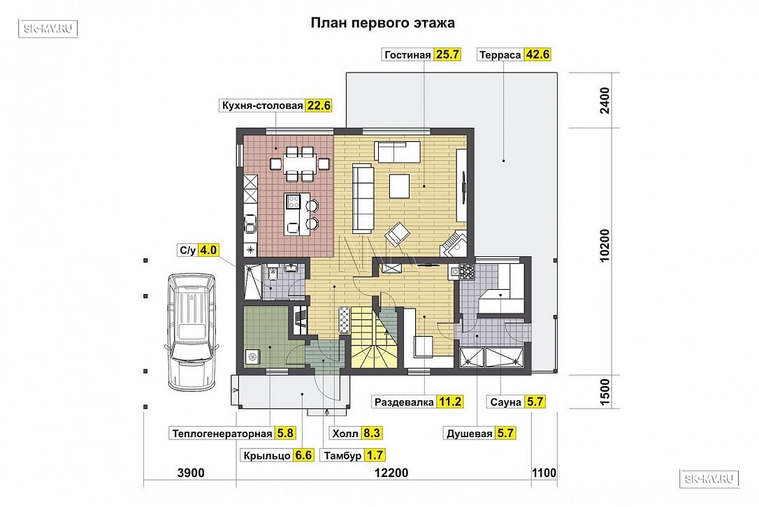 Первый этаж объединил большую зону гостиная — кухня — столовая, а также отдельную зону сауны 22 кв.м с раздевалкой и с/у. Но весь ансамбль помещений собирает воедино очень большая терраса 42,6 кв.м. В нее есть выход из гостиной и сауны.