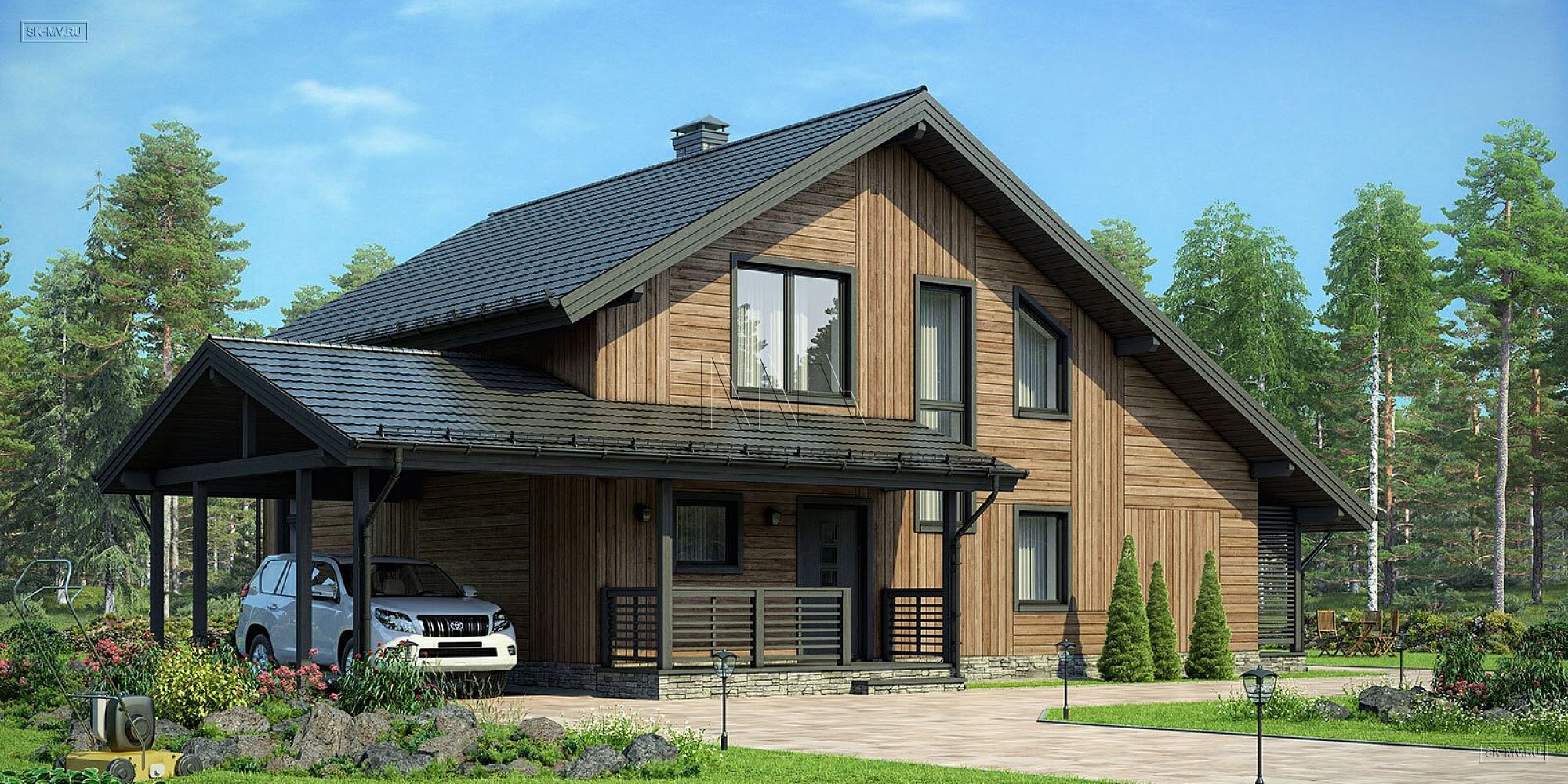 6. Расположение навеса в проекте очень правильное. Если дом грамотно привязан к участку, то сценарий жизни современного человека в загородном доме такой: приехал, открыл ворота, припарковался возле крыльца, зашел в дом с пакетами продуктов и т.д. Удобно и просто.