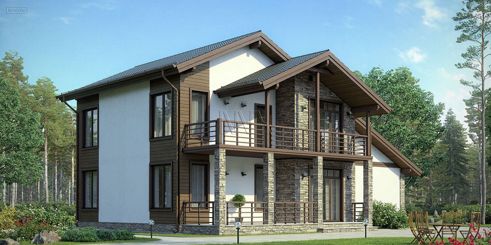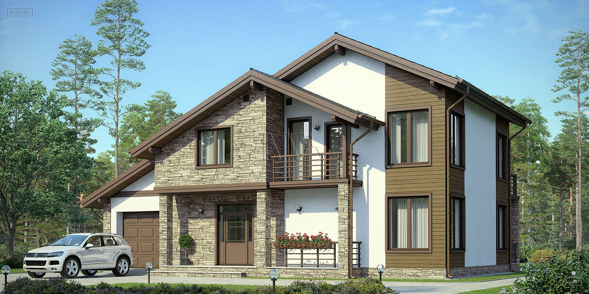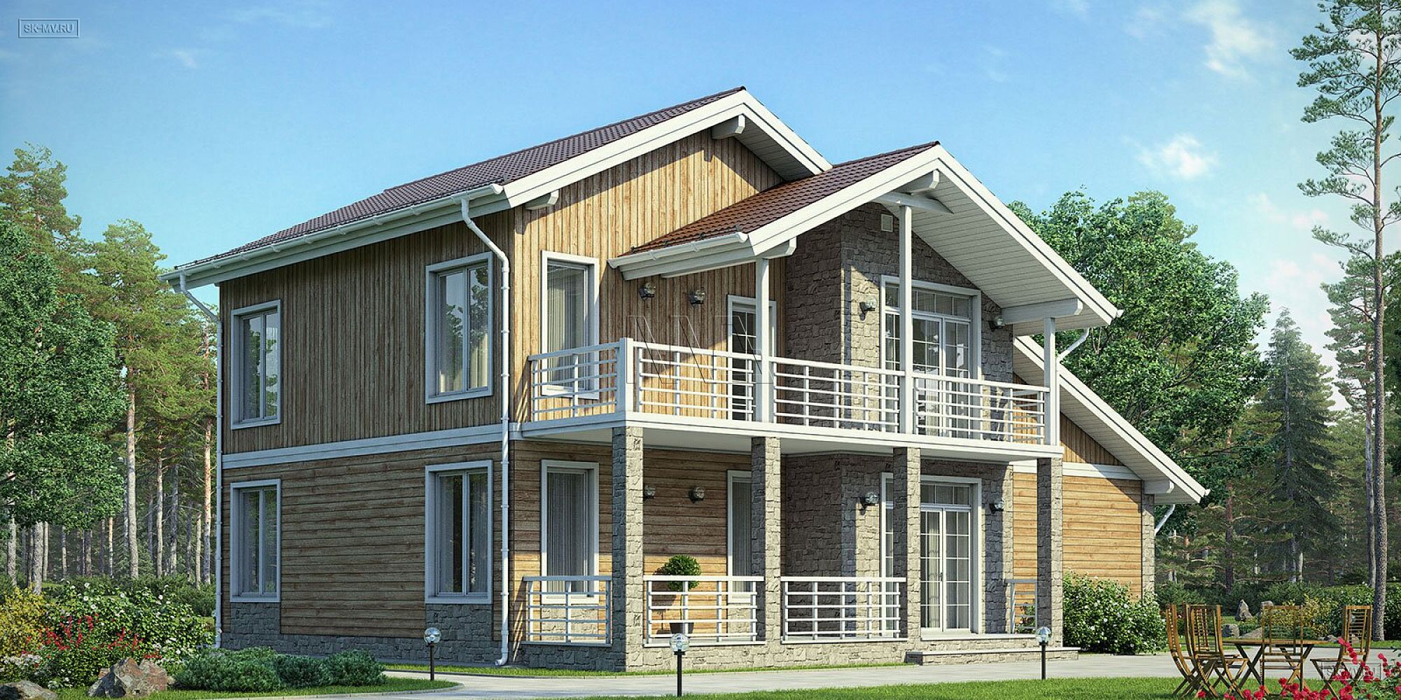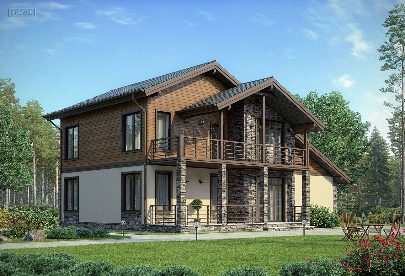 «Белоостров» — проект современного двухэтажного загородного дома в американском (канадском) стиле с встроенным гаражом и комбинированной фасадной отделкой из дерева и камня. Дом входит в серию проектов «Европейские фасады», основная задача которой показать заказчику варианты оформления фасада в разных комбинациях материалов, имитируя основные черты архитектуры некоторых европейских регионов: Скандинавии, Франции, Австрии и Англии.