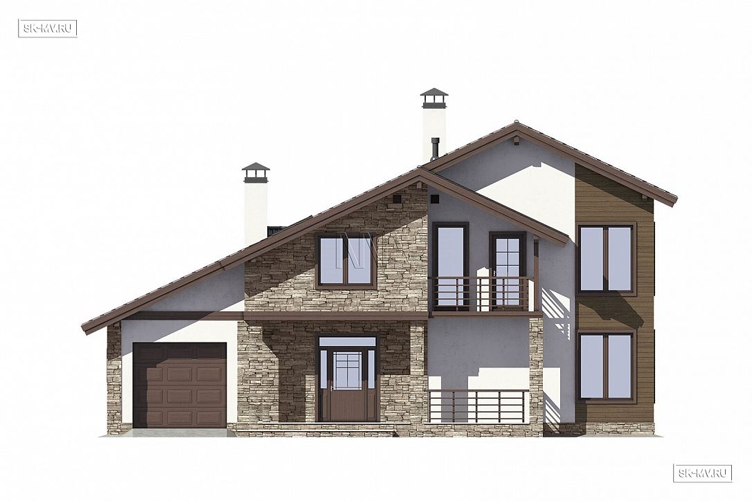 Особенностью этого проекта является асимметричная кровля со смещением конька с длинным скатом, объединяющим дом и гараж в единый комплекс под одной крышей.Почему при проектировании использован такой прием, как разноскатность, которая все чаще встречается в современных проектах?