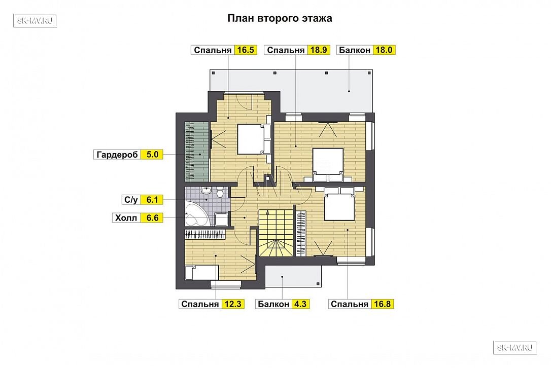 Но самое важное, чего удалось добиться таким приемом, что окна спален расположены не как обычно в крыше или во фронтоне, а выходят на две стороны (юг и запад, юг и восток), а значит естественного света в комнатах будет больше.