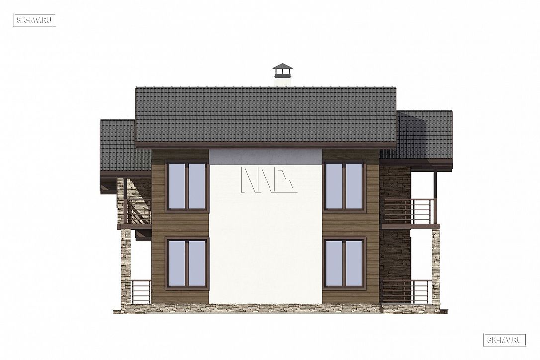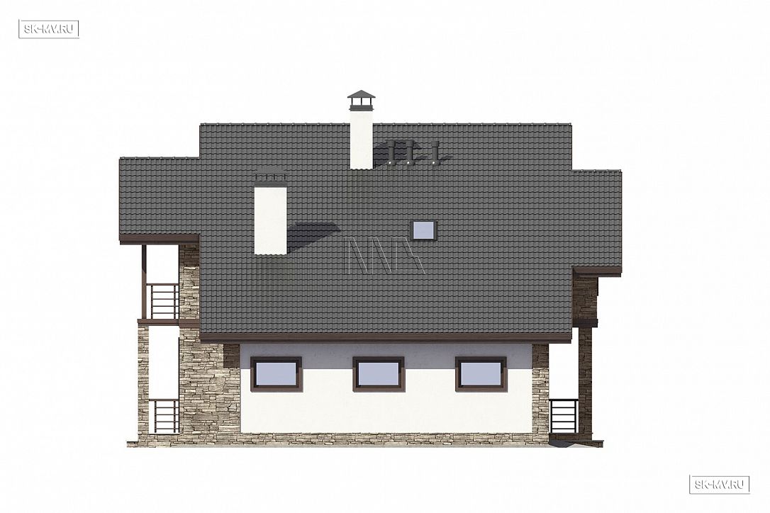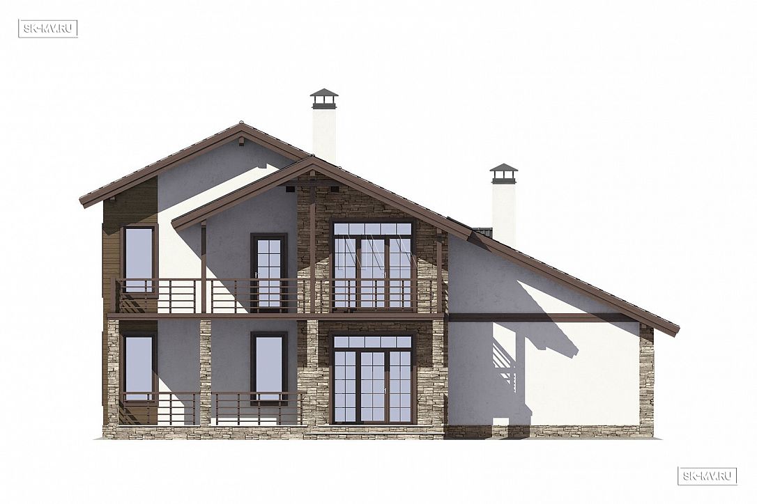 Во-первых, это уход от архитектурных стереотипов и правильных геометрических форм в современном загородном строительстве. Такая кровля выглядит очень нестандартно и оригинально, хотя архитектор компенсировал асимметрию со стороны главного фасада двускатным козырьком над балконом.