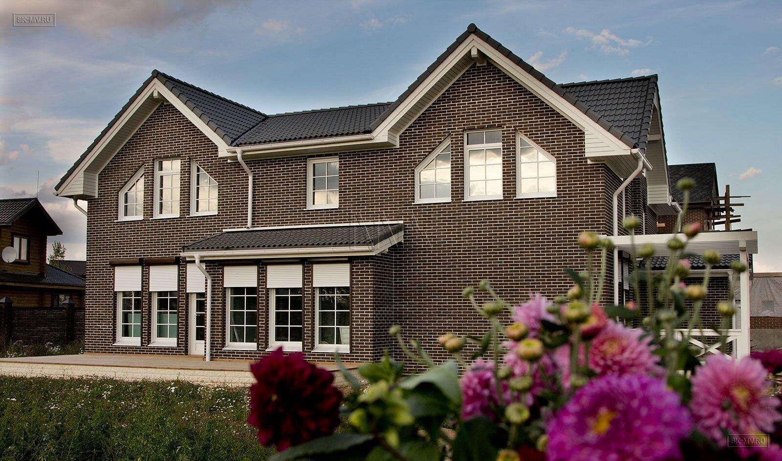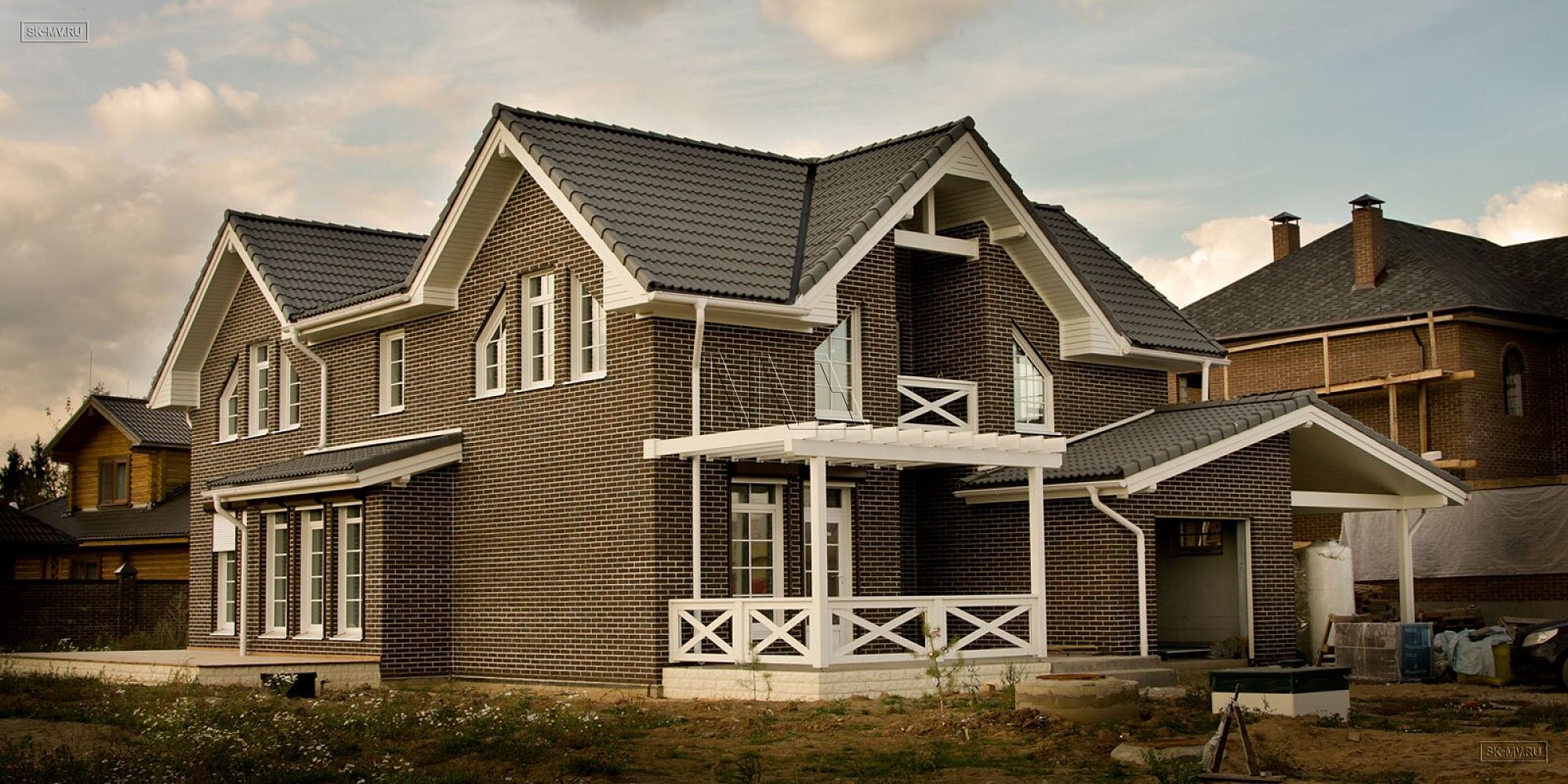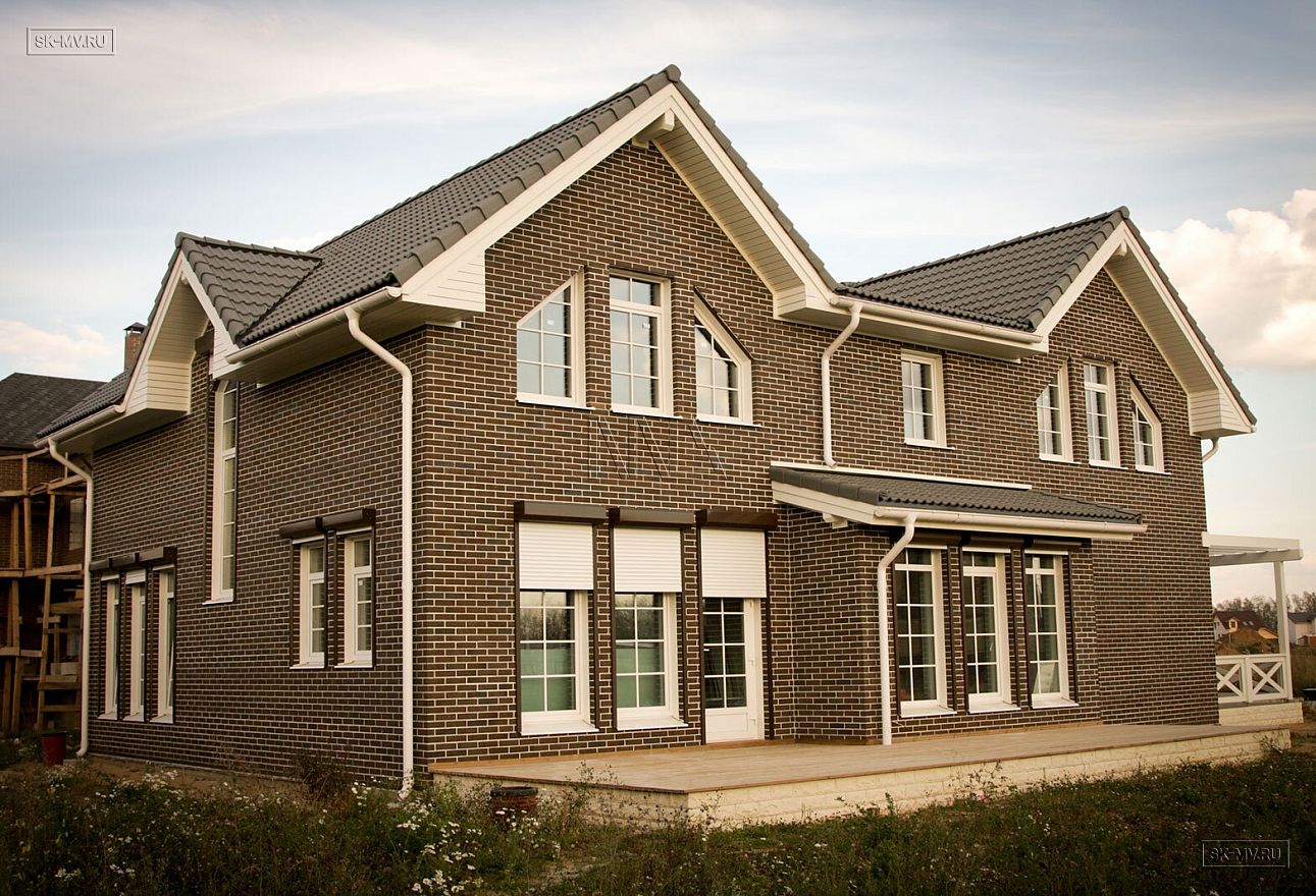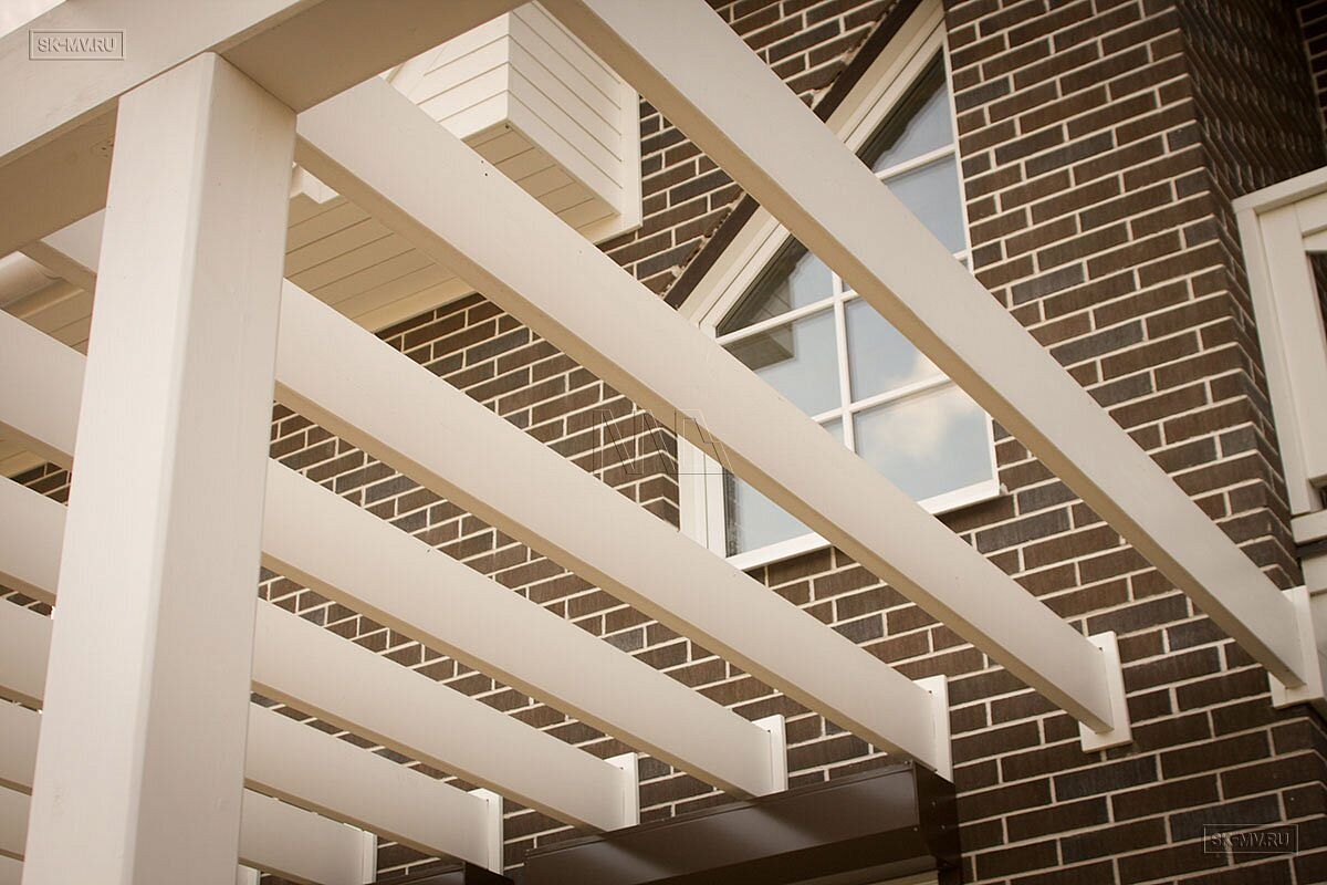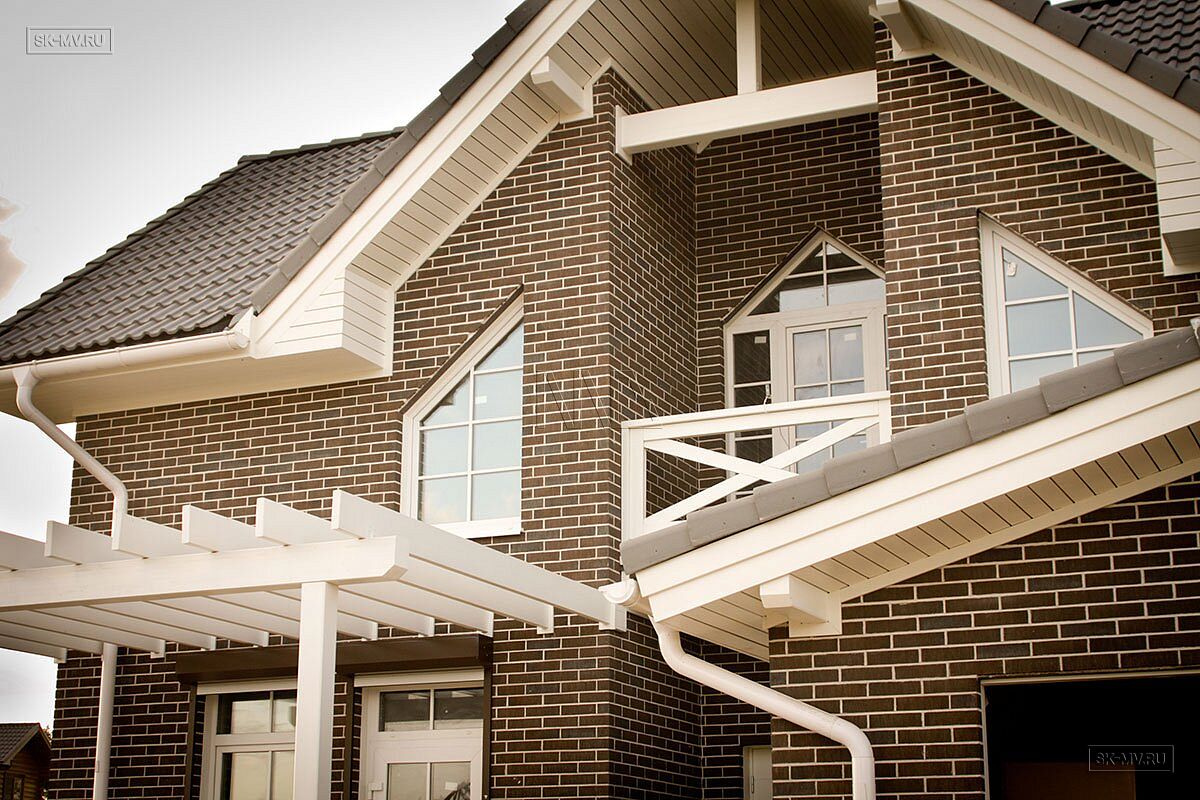 Фасадная отделка выполнена коричневым кирпичом с белой расшивкой и дополнена декоративными планками, стойками, наличниками, ограждениями и перголой для плюща.