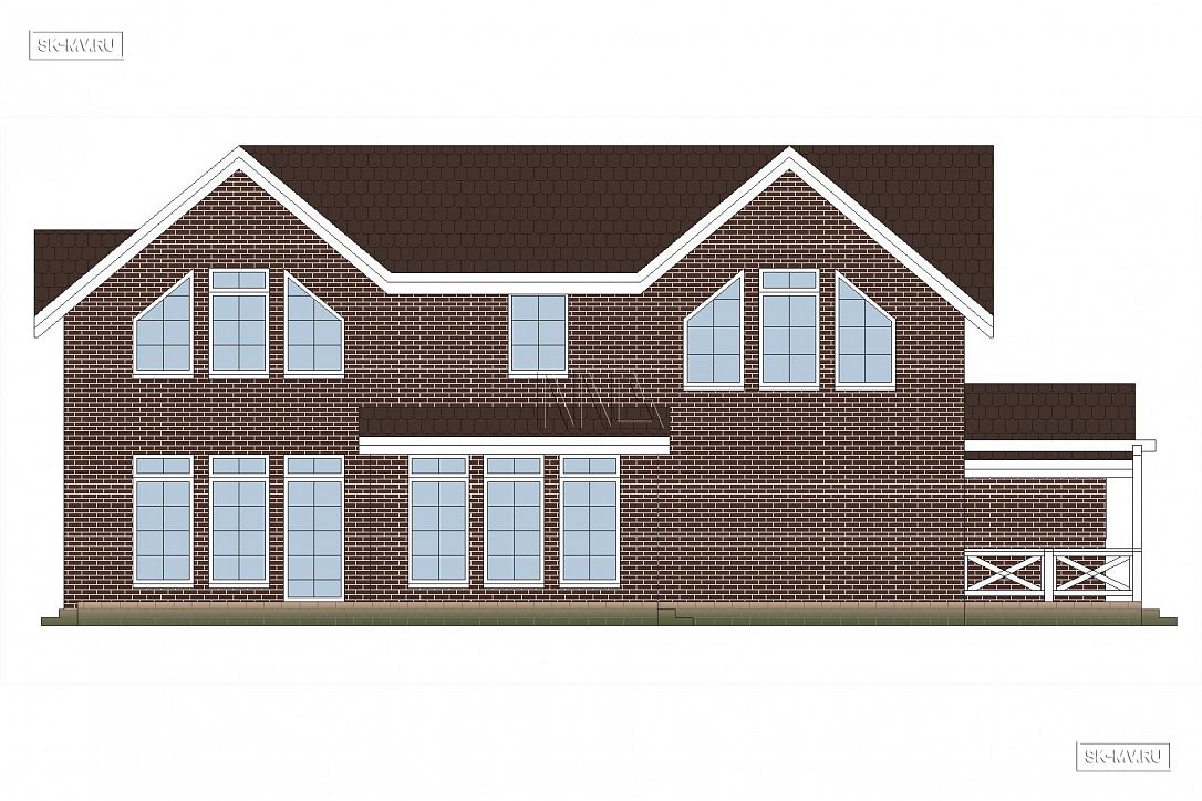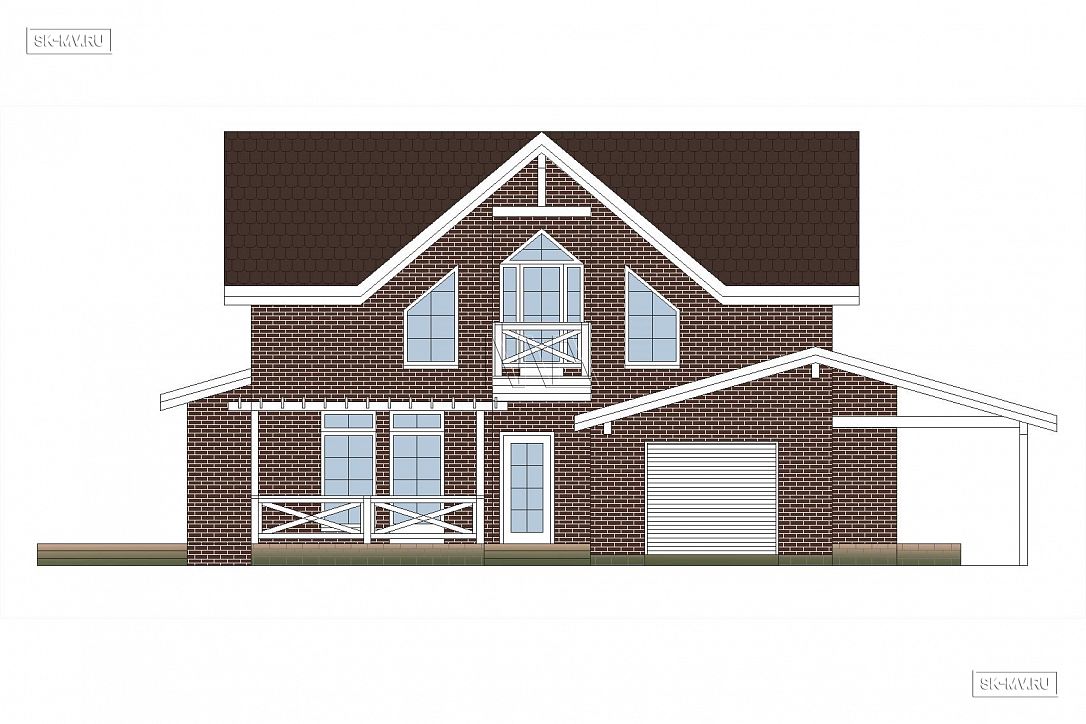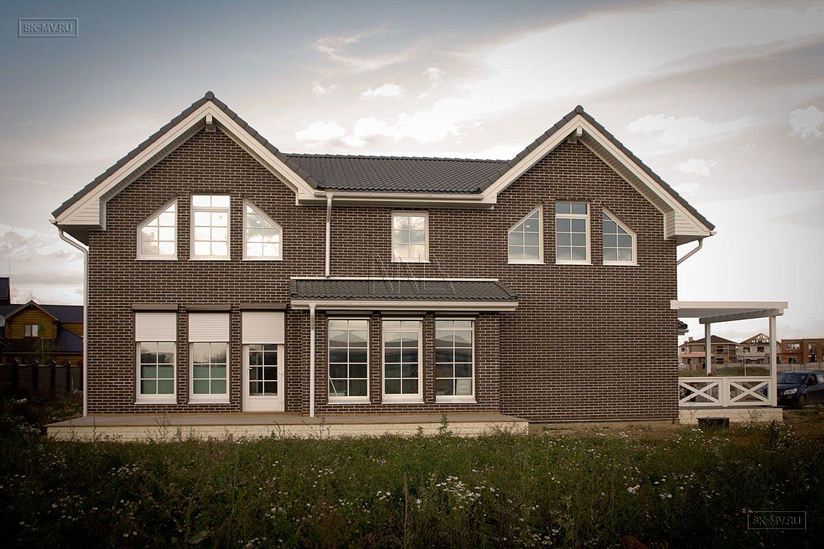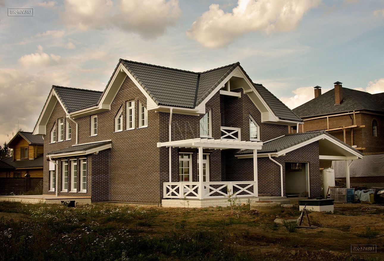 Проект кирпичного коттеджа из коричневого кирпича с белой расшивкой с гаражом и навесом для автомобиля площадью 318 кв.м разработан нами для заказчика из Москвы.