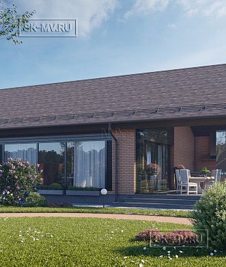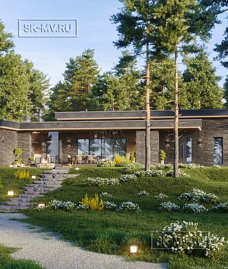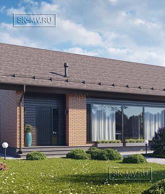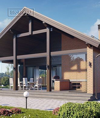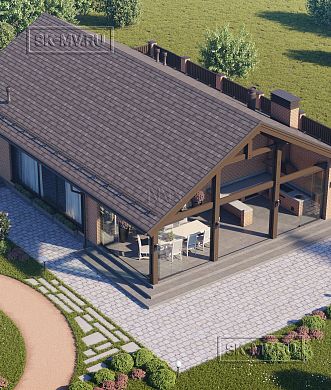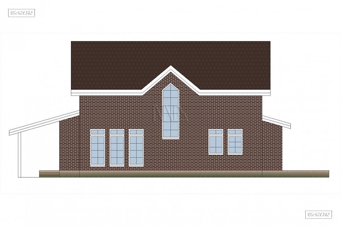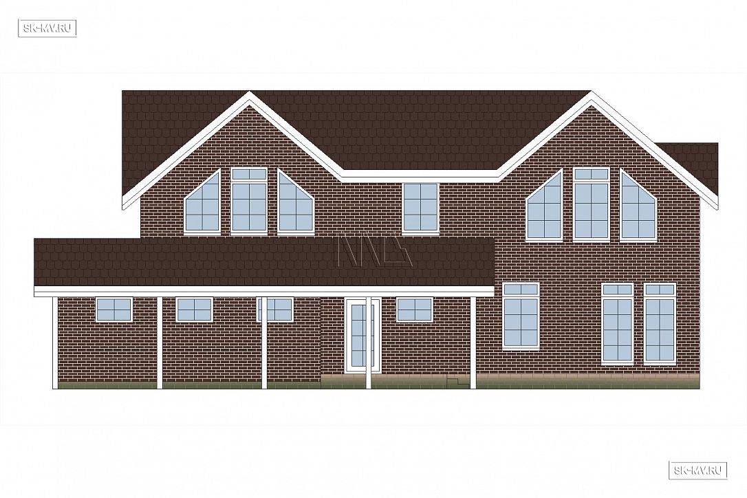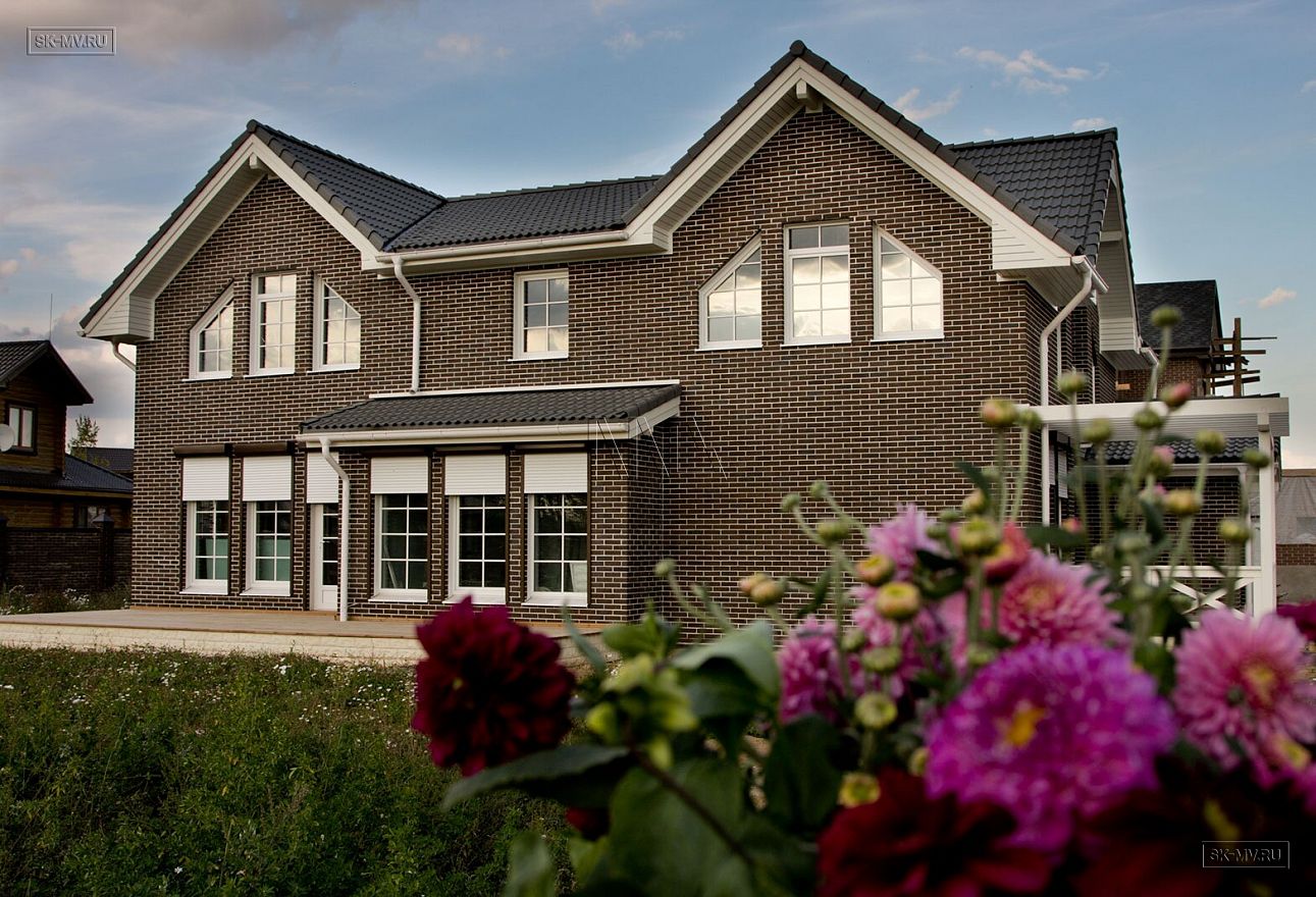 Проект кирпичного коттеджа из коричневого кирпича с белой расшивкой с гаражом и навесом для автомобиля площадью 318 кв.м разработан нами для заказчика из Москвы.