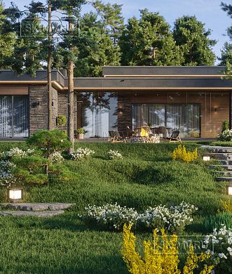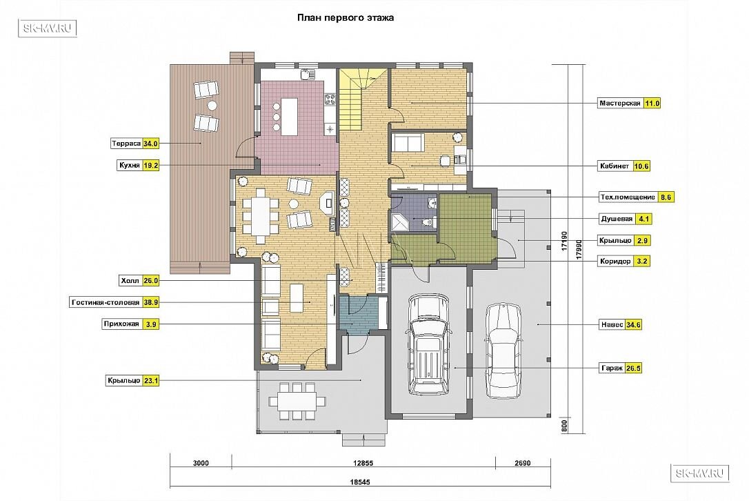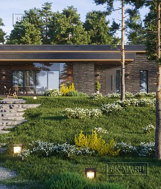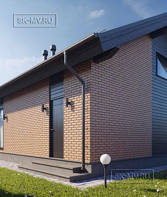 Для автомобилей в этом проекте предусмотрено много места: и открытый навес для машины и закрытый гараж. Гараж может быть использован как по прямому назначению для авто, так и для парковки мотоцикла или квадроцикла. Дом правильно посажен на участок и привязан к сторонам света. Правильно архитектор расположил и въездную группу. Хозяева с улицы сразу паркуются под навес и проходят в дом с крыльца, не обегая с тяжелыми сумками здание вокруг.