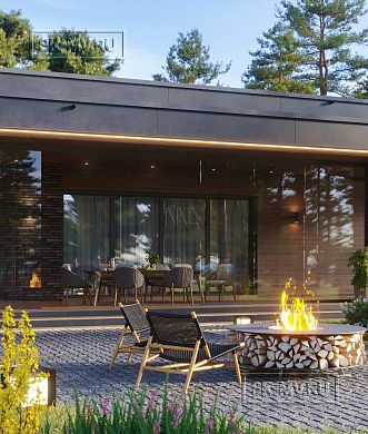 Большая терраса обращена на юг, поэтому в доме с утра до вечера солнышко. Небольшой эркер и окна совмещенной кухни пропускают максимальное количество естественного освещения в гостиную, которая разбита на две зоны телевизором и камином.